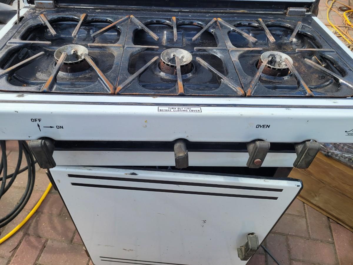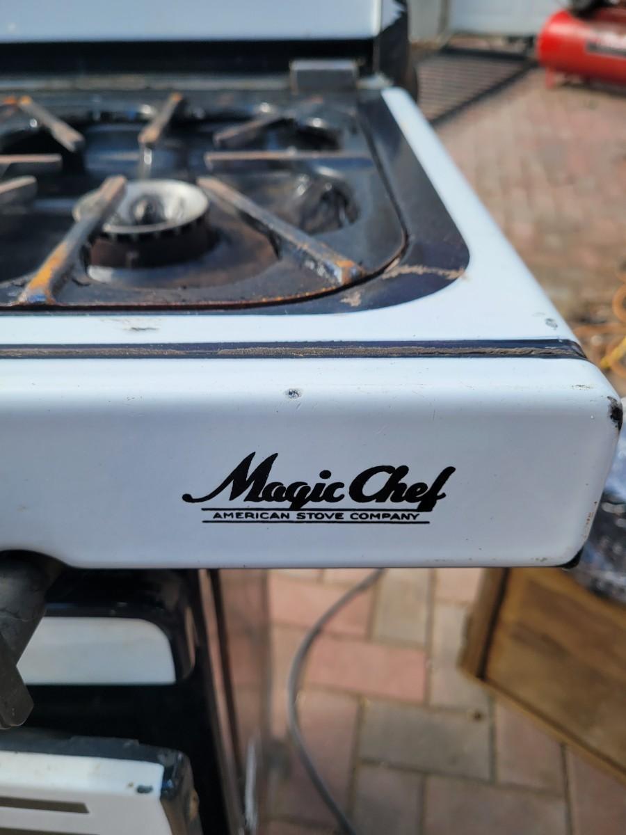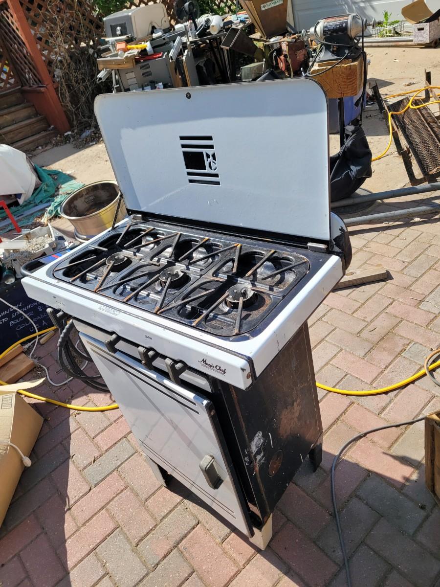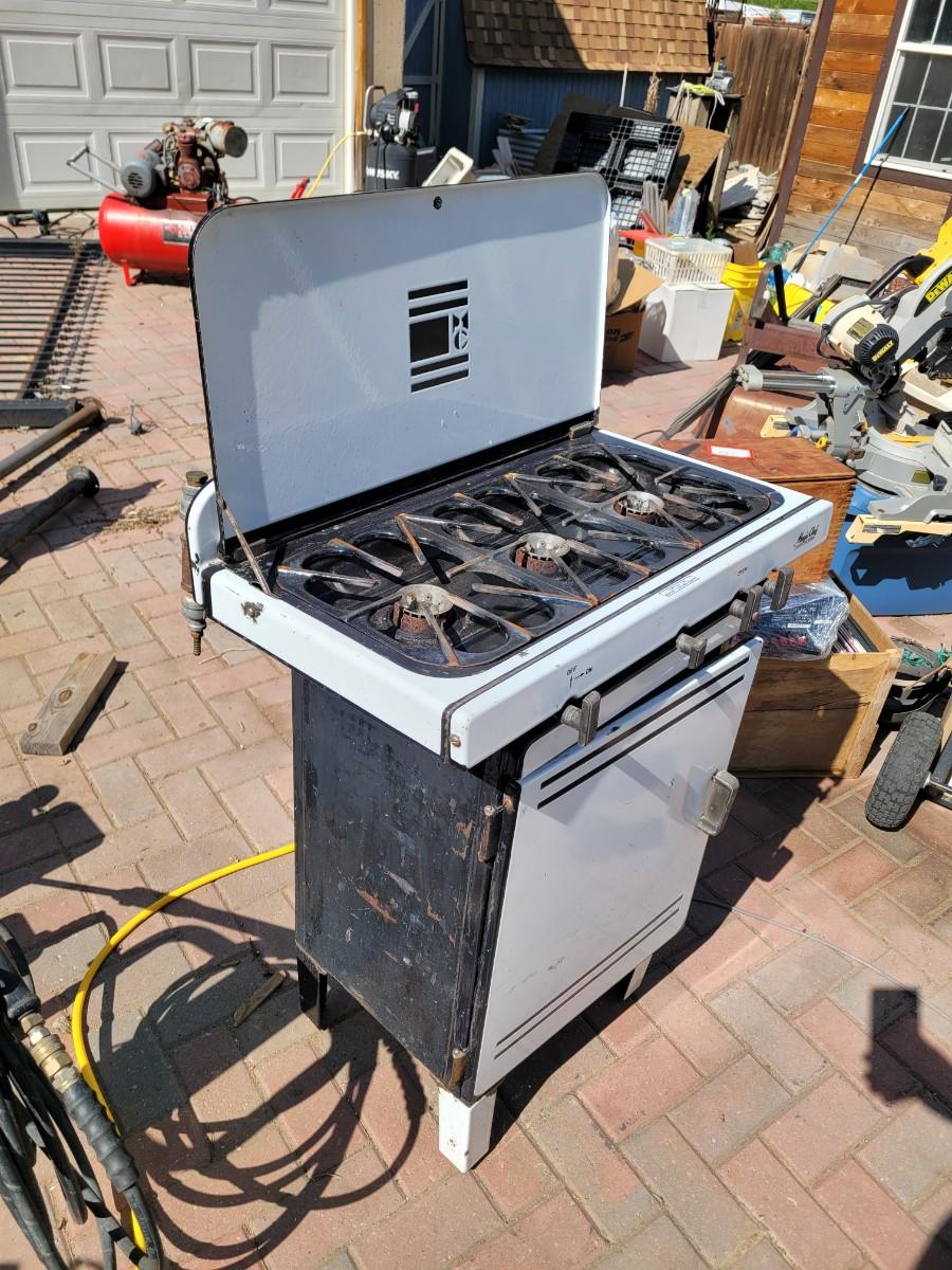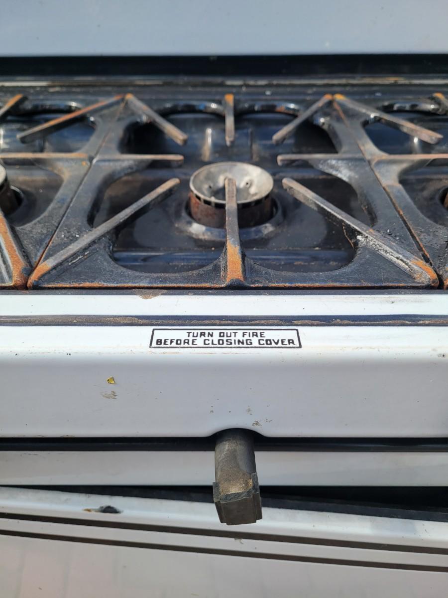 Looks to be complete, I'm not sure if it's set up for propane or natural gas. Measures 28 in wide 17 in deep and 38 in tall with the lid closed and 48 and 1/2 in tall with the lid open. The porcelain does have some chipping see the photos carefully for additional description