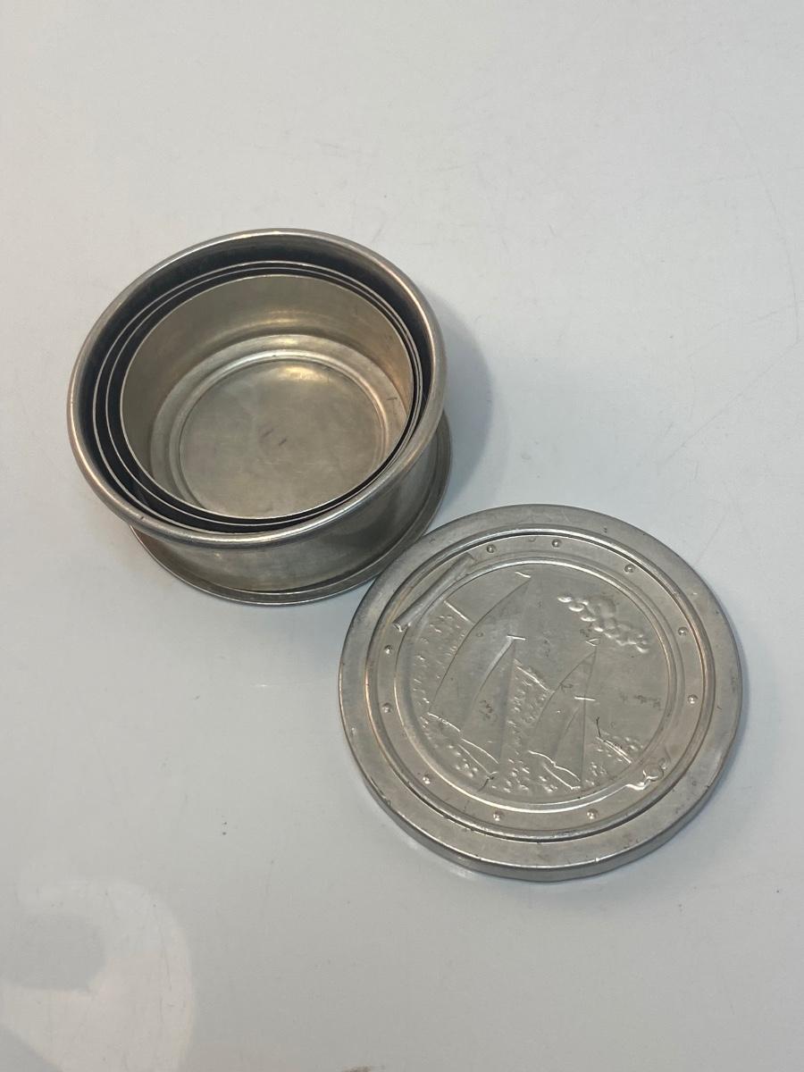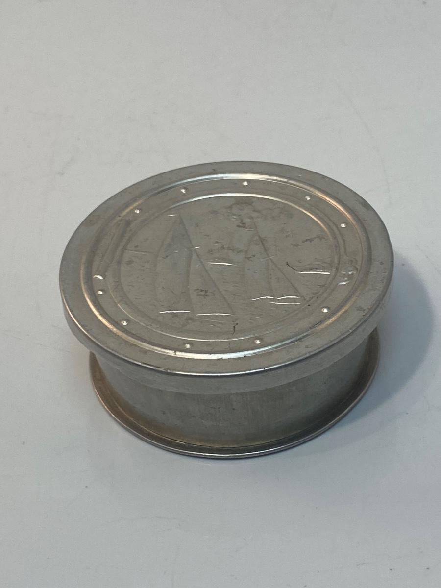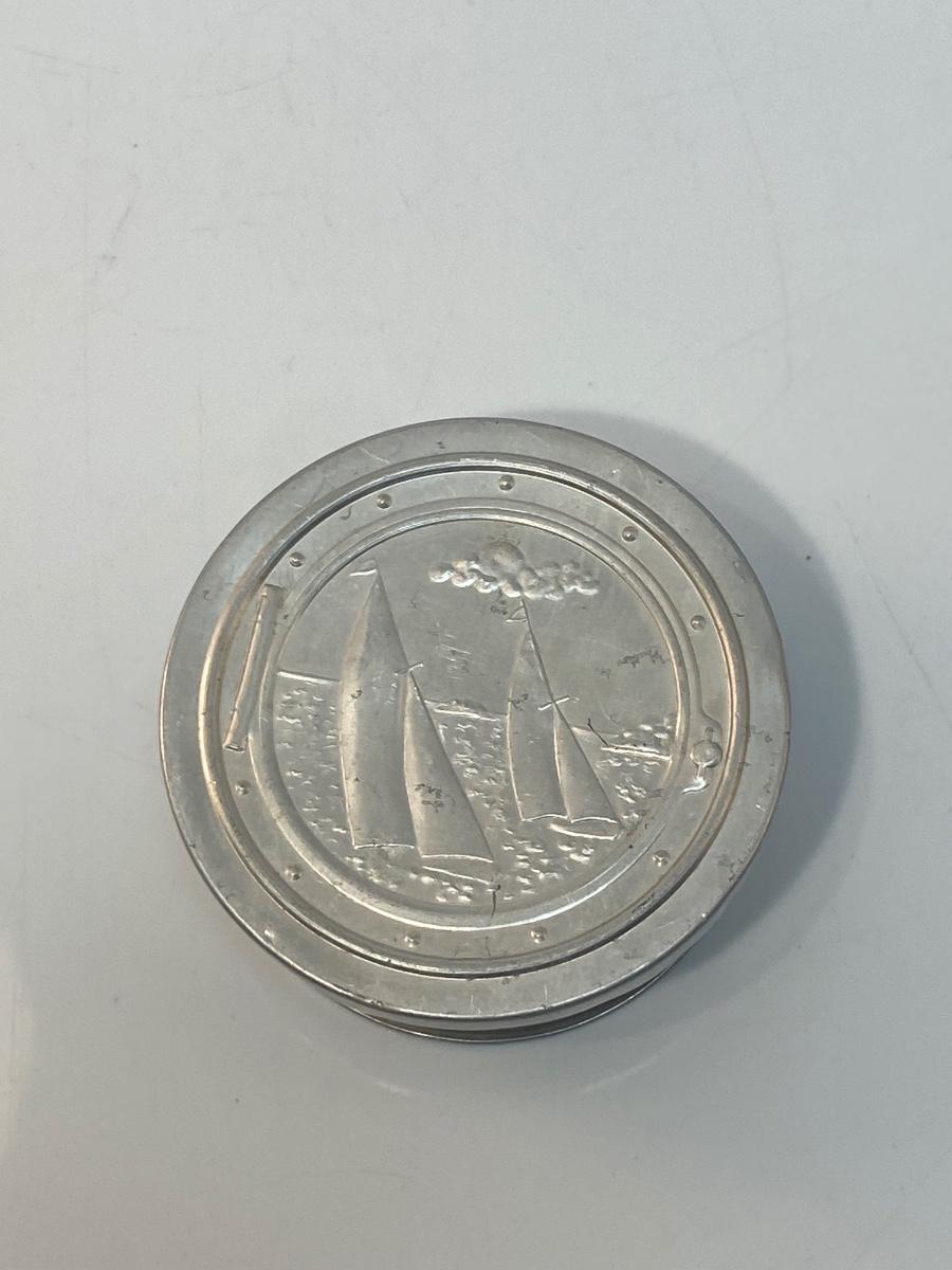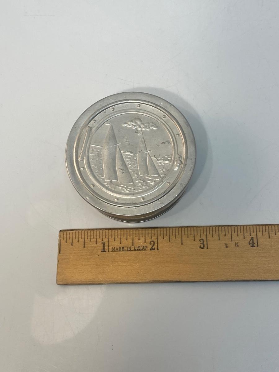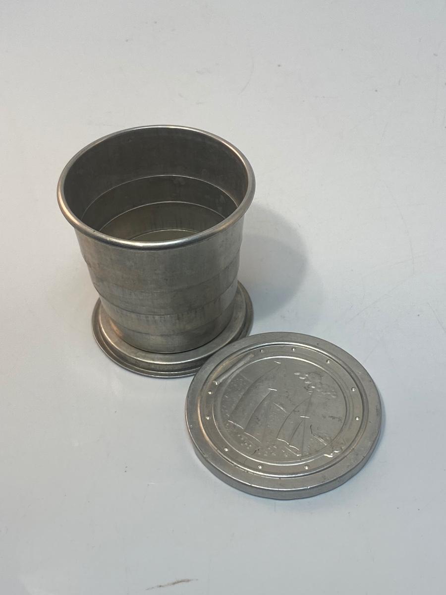 Vintage Sailboat Embossed Lid Collapsible Camping Hiking Cup Made in USA. In good, aged condition. Super lightweight, probably aluminum.