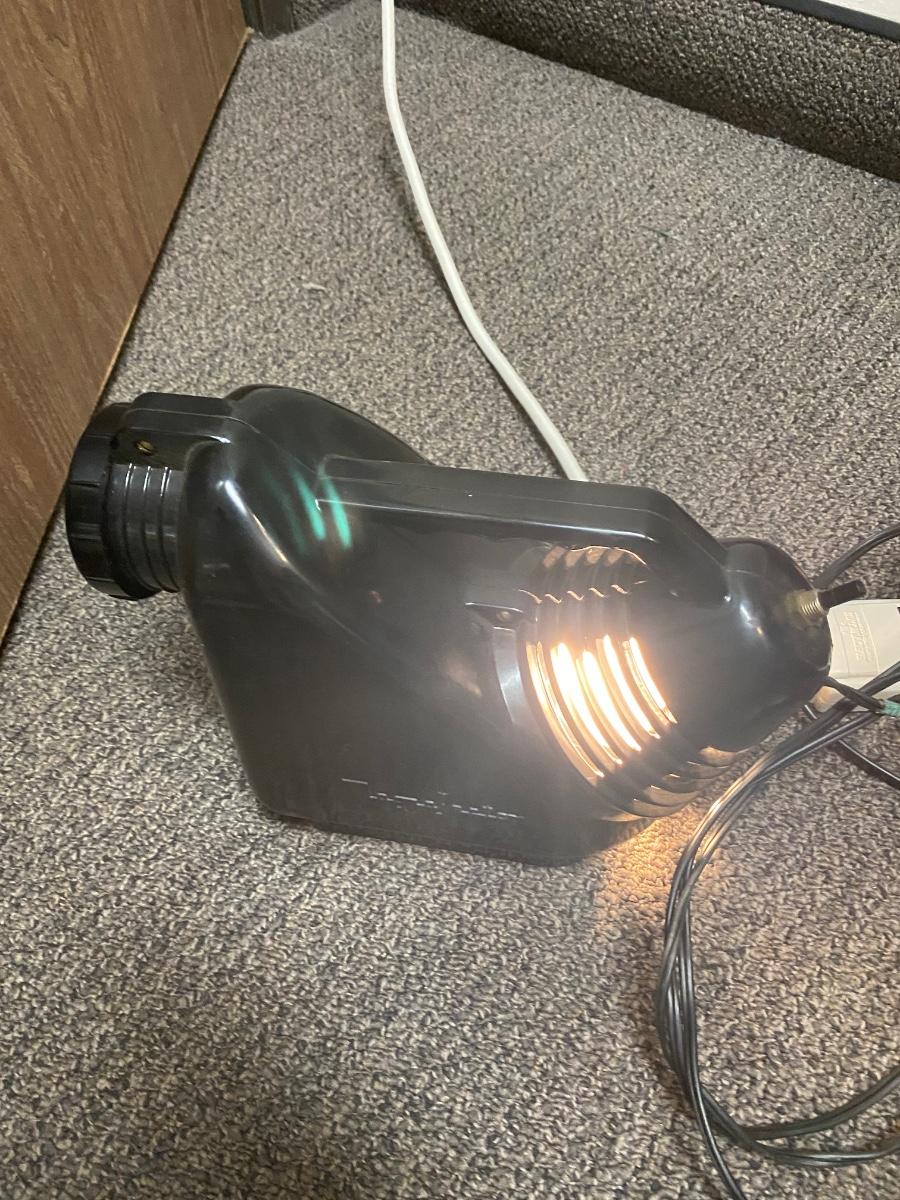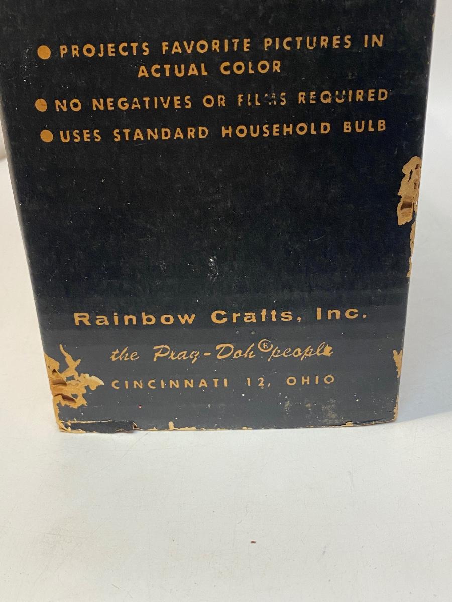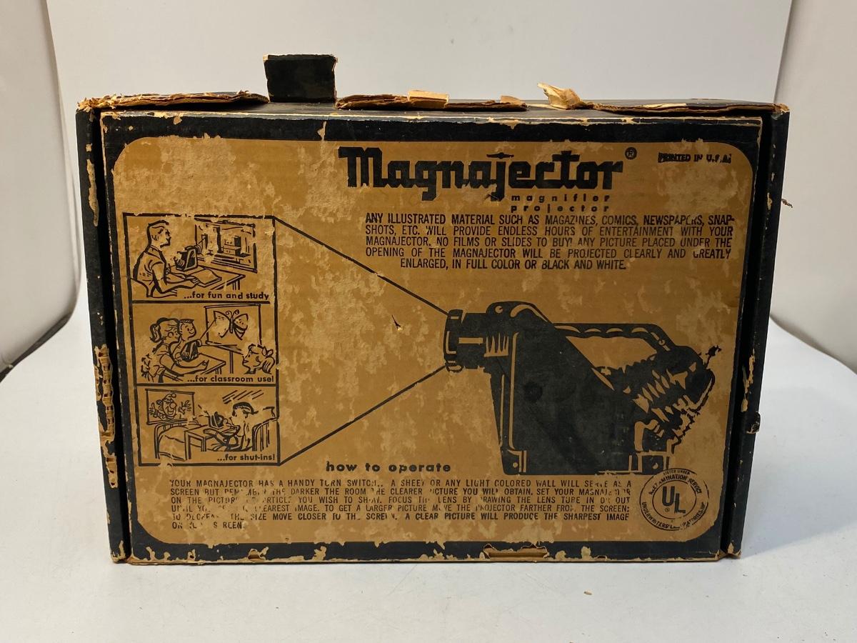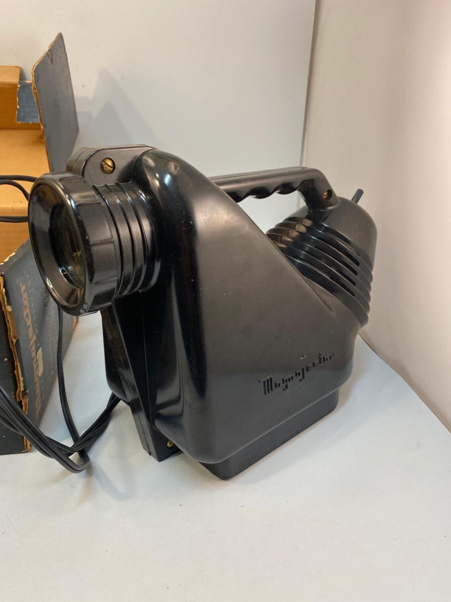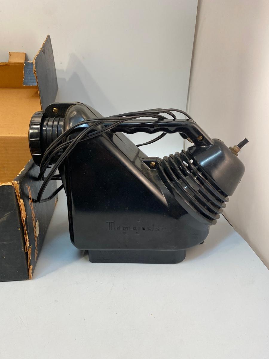 Vintage Magnajector Image Projector. Simple to use. Tested and works, but i think it needs a newer bulb and the mirror inside cleaned. Box has wear. Gets hot while on from current bulb, use caution when using.