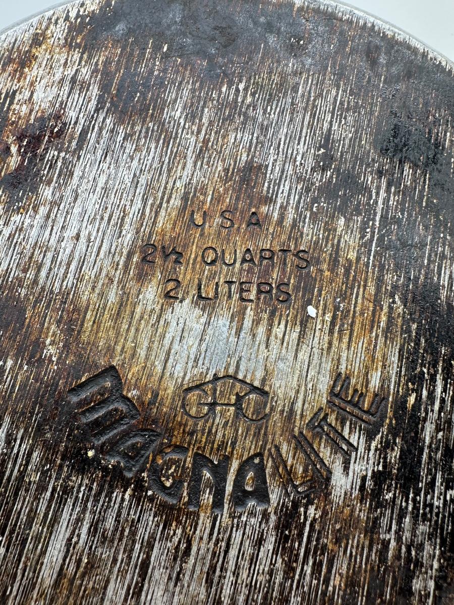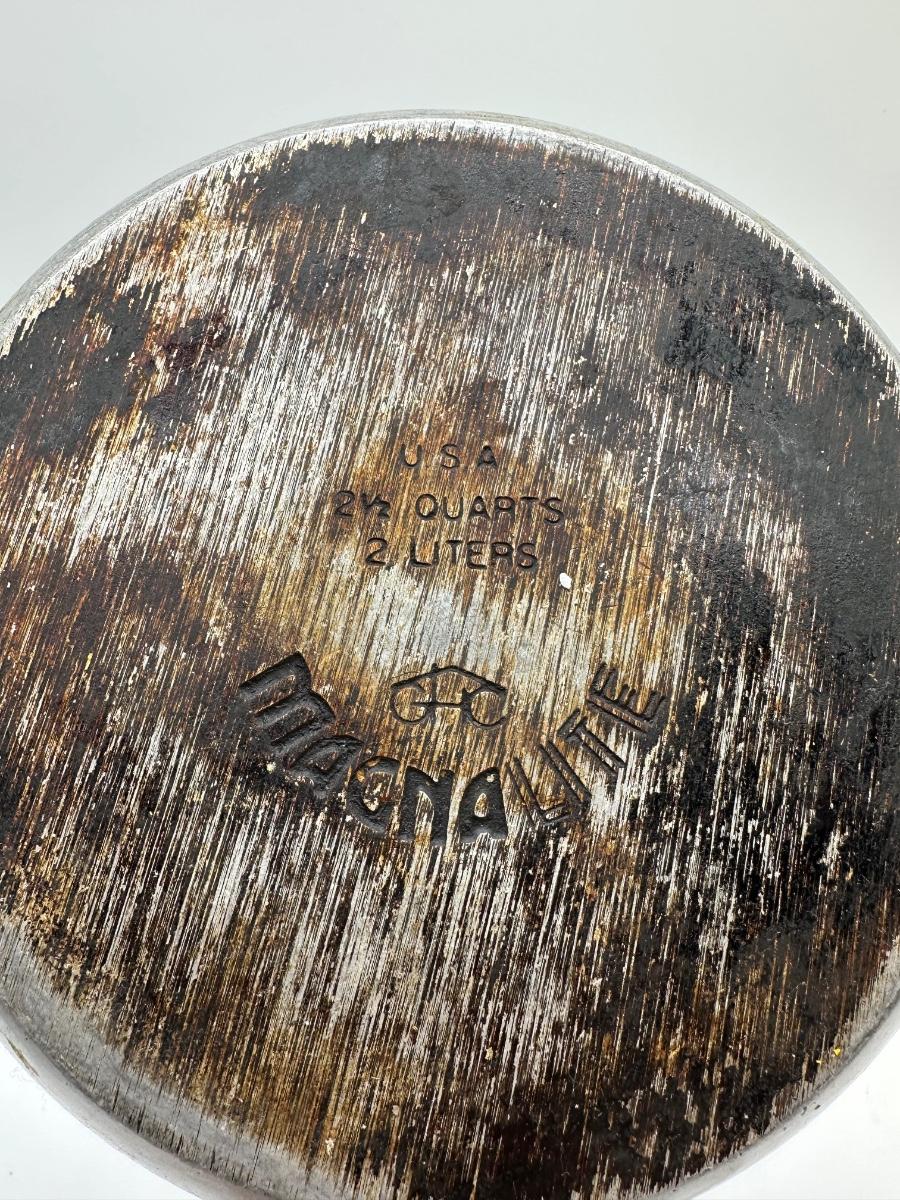 Original vintage Magnalite cast aluminum 2-quart saucepan with matching lid. Marked USA – 2½ Quarts / 2 Liters on base. Heavy-duty aluminum with excellent heat distribution, pour spout, and classic black handle. Normal cosmetic wear and surface marks from use; structurally solid and fully functional.