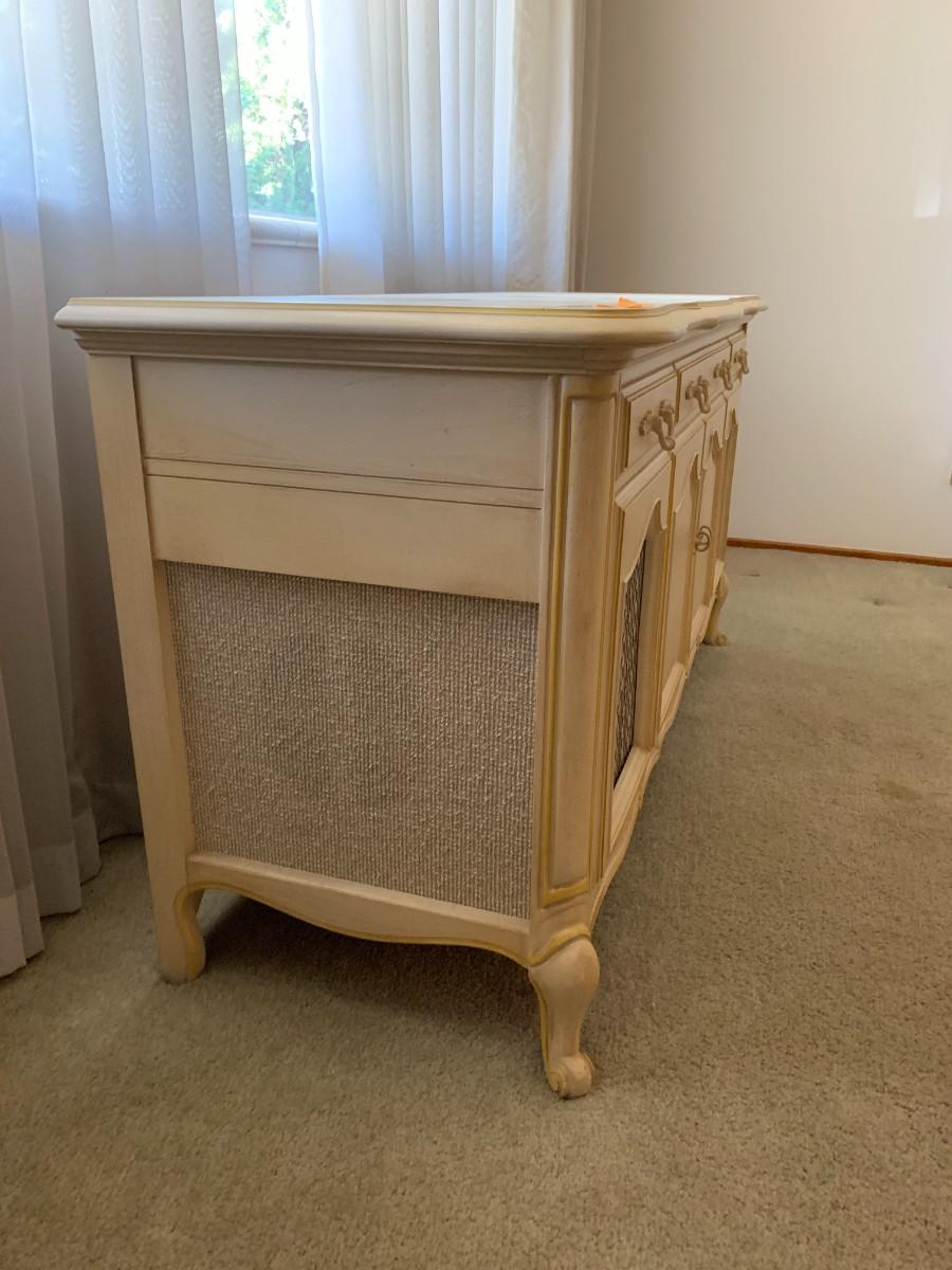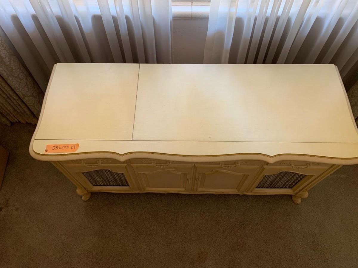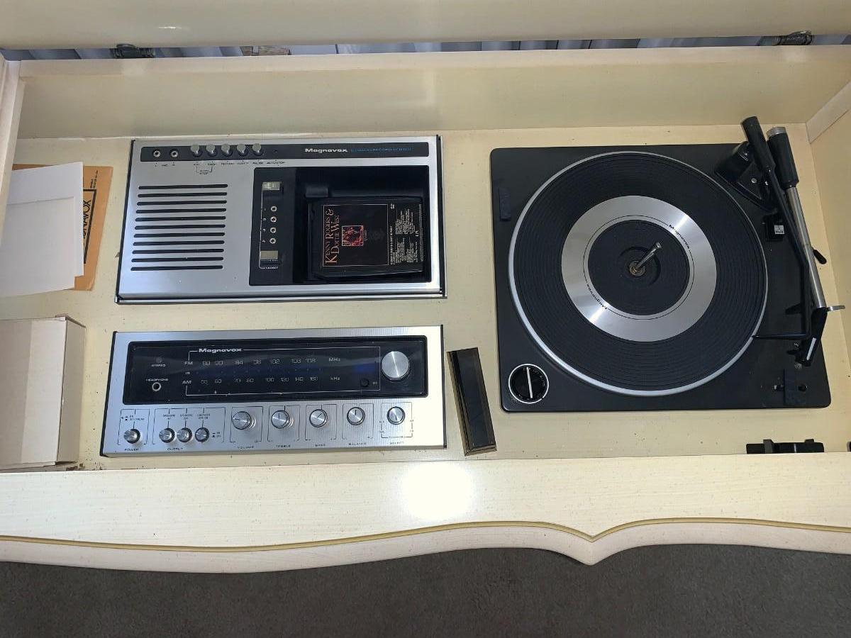 Vintage Magnavox Stereo Console - 1970's, Antique White with Gold Trim in a French or Italian Provincial Cabinet Style. Includes 8 Track/Record Center, a Kenny Rogers & Dottie West tape, AM/FM Radio, and Turntable. Turns On