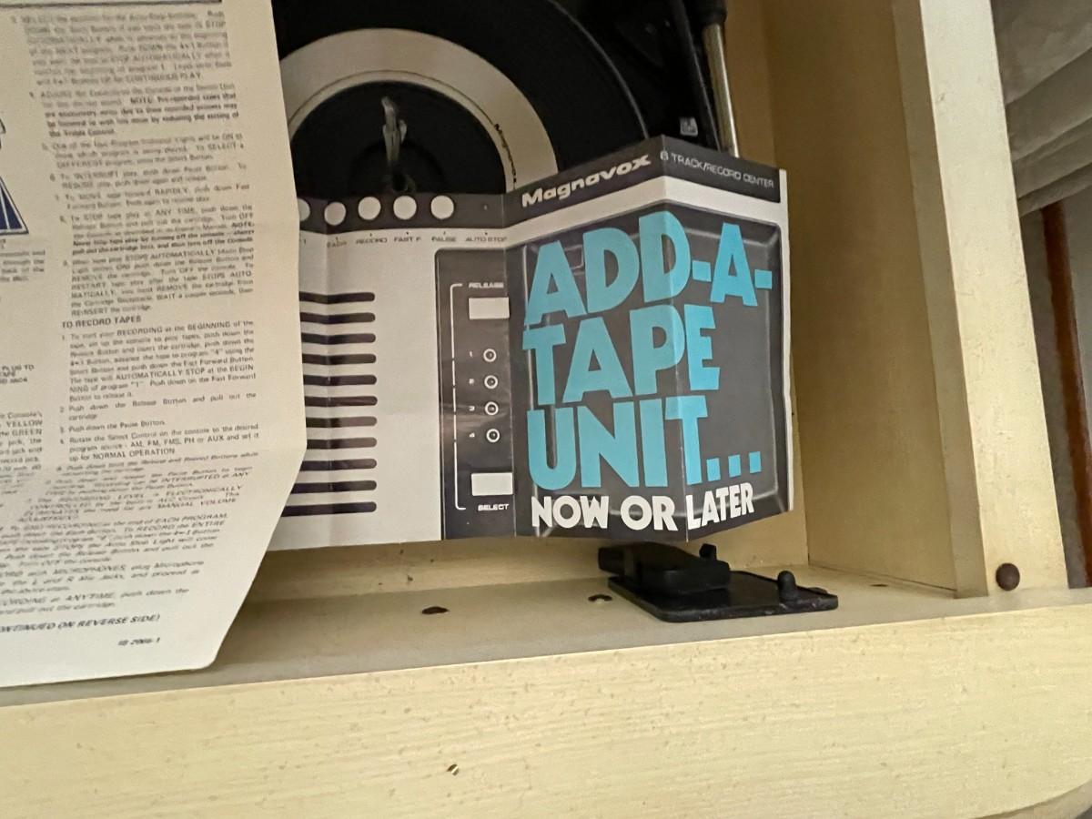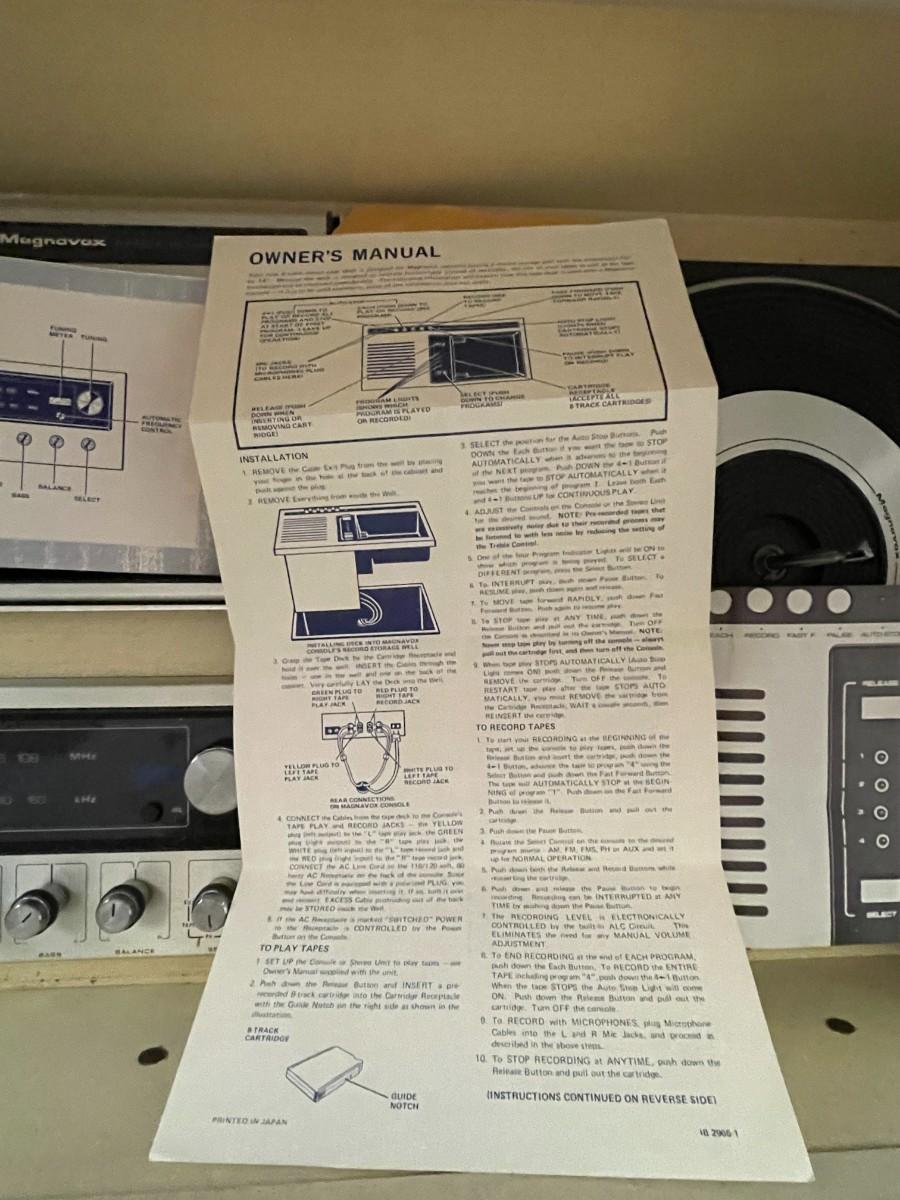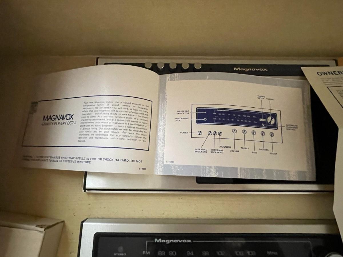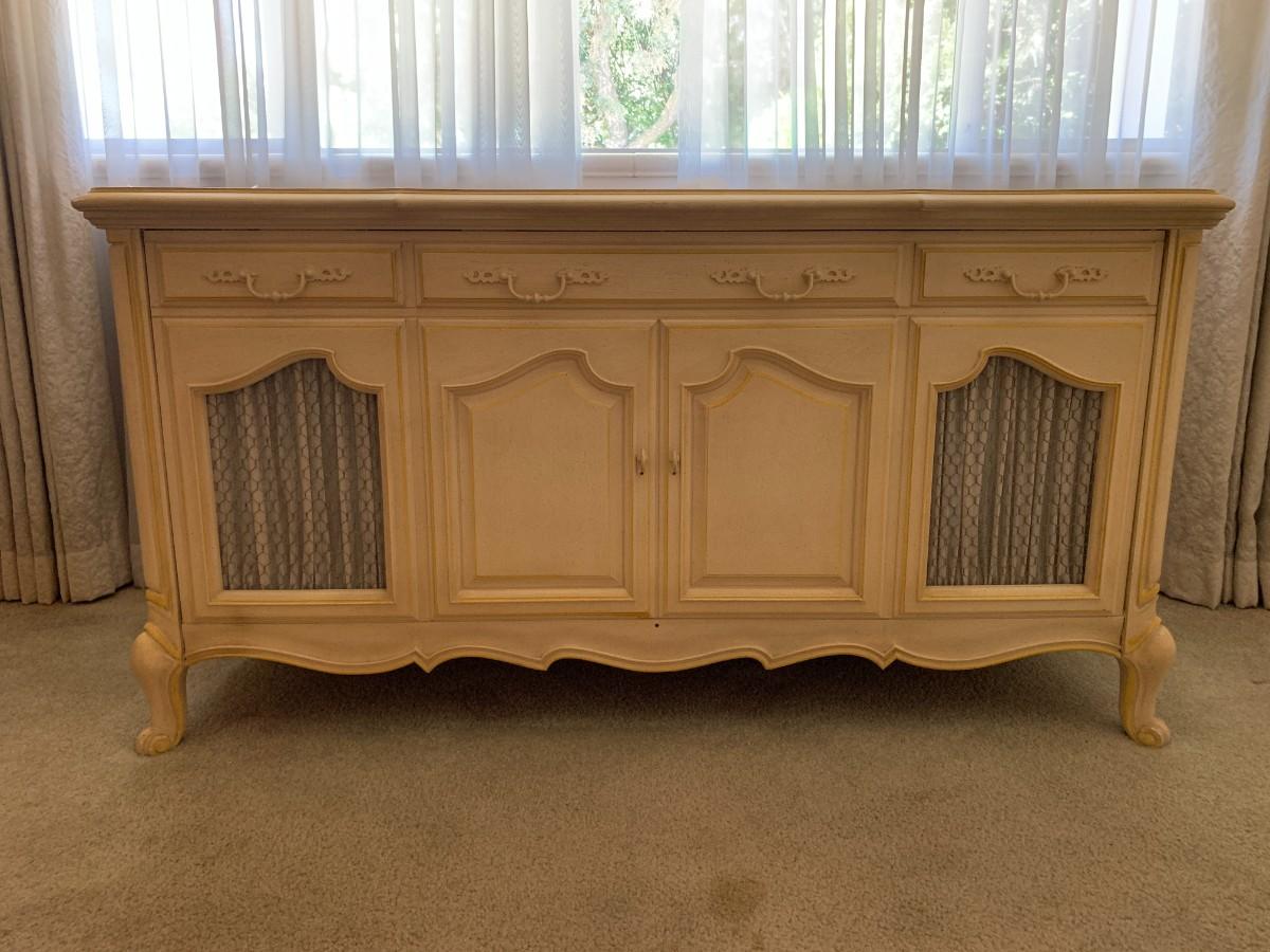 Vintage Magnavox Stereo Console - 1970's, Antique White with Gold Trim in a French or Italian Provincial Cabinet Style. Includes 8 Track/Record Center, a Kenny Rogers & Dottie West tape, AM/FM Radio, and Turntable. Turns On