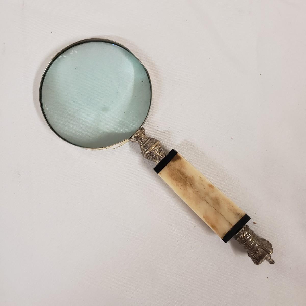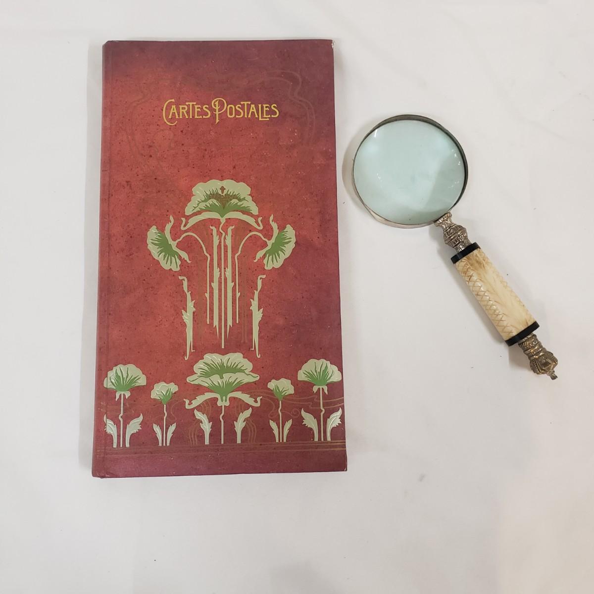 The vintage magnifying glass is a heavier piece. The glass and handle are in good condition with the metal rim around the glass has one dent on it. See pictures for details. The bone handle has some ornate carvings on it and is what adds to the weight of this piece. The Cartes Postales postcard display book appears to be brand new. There are slats on each page to place your postcards in. The magnifying glass measures 10"x4" and the book 8"x15".
