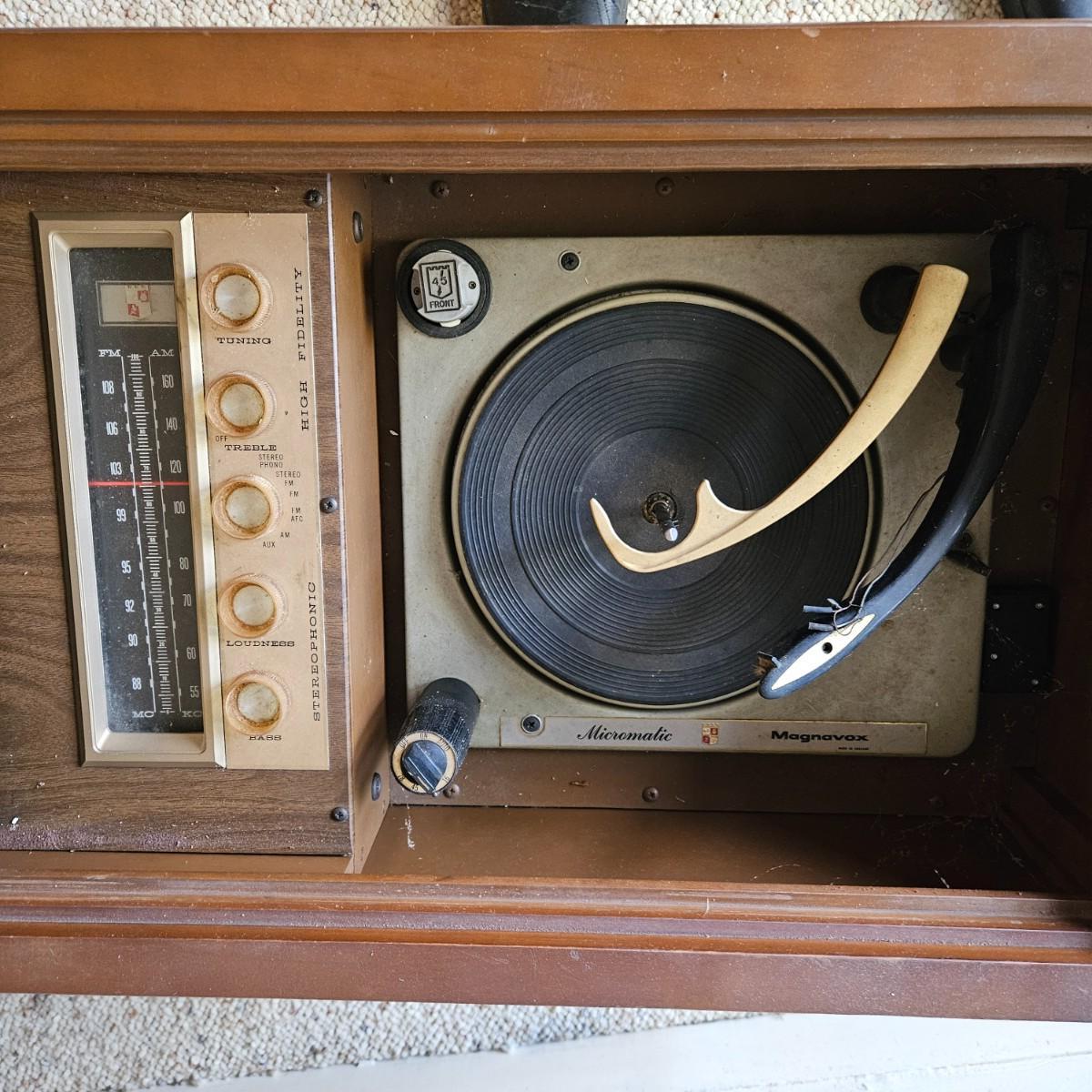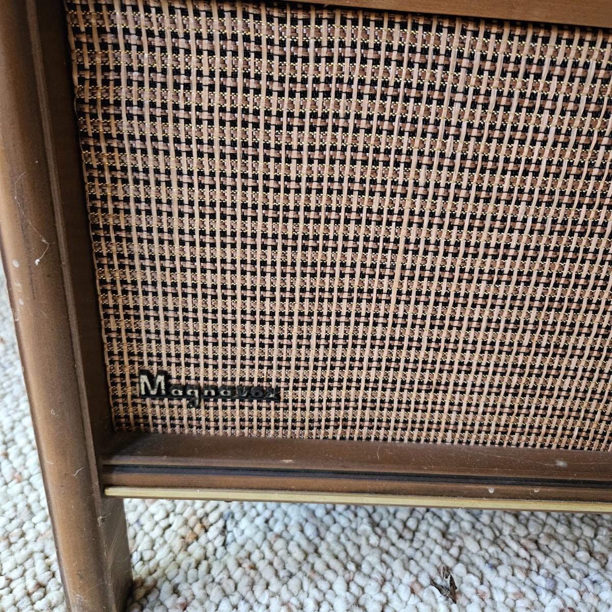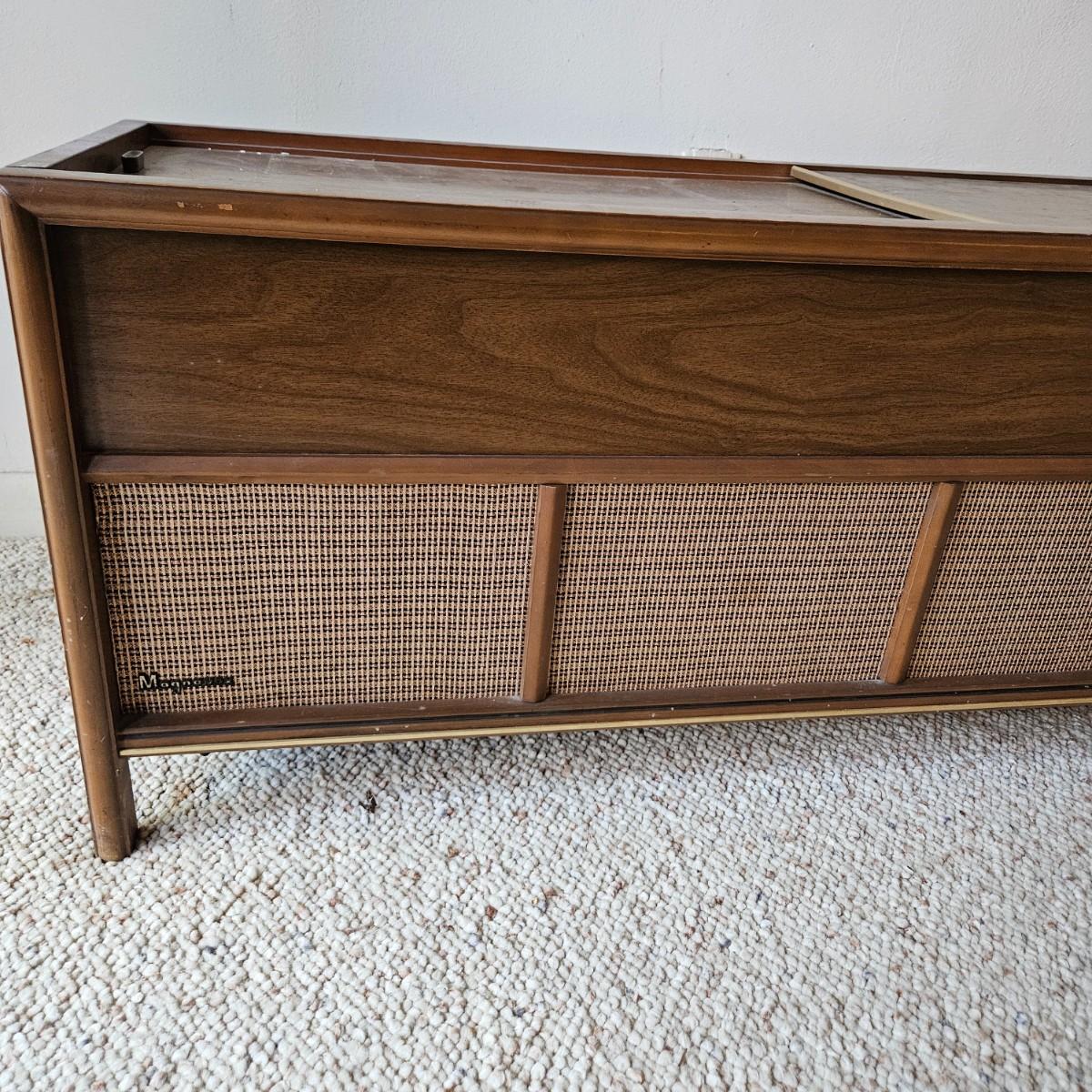 Vintage Magnovox stereo console with a turntable. This item powered on when plugged it, but has a loud tube buzz to it. The turntable also spins, but the wires to the head are exposed and appear to be unattached. It is constructed of a medium, dark stained wood and measures approximately 50" x 17.5" x 19"H. Local pickup only. Winning bidder must bring assistance to help move and load this item due to its weight and/or size.