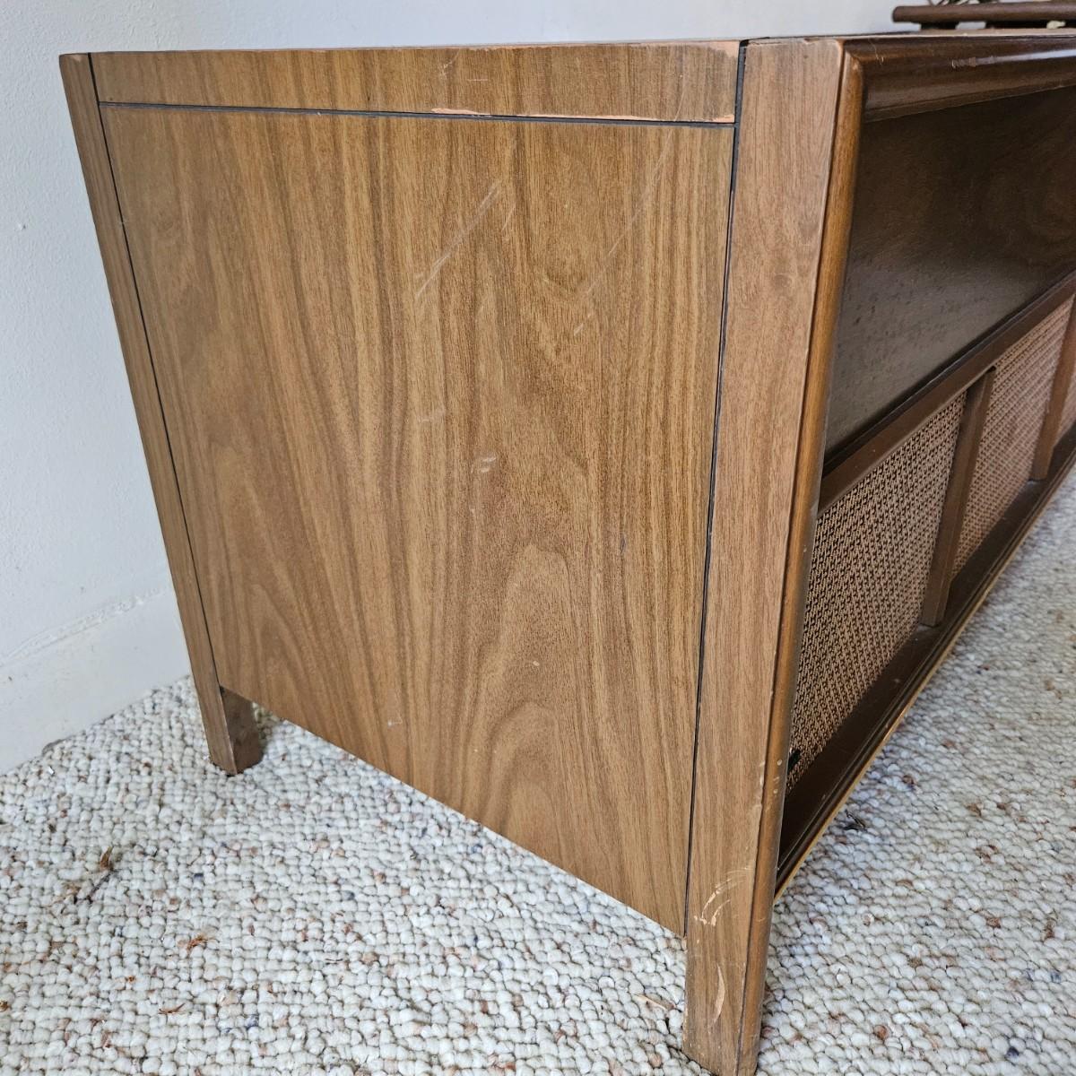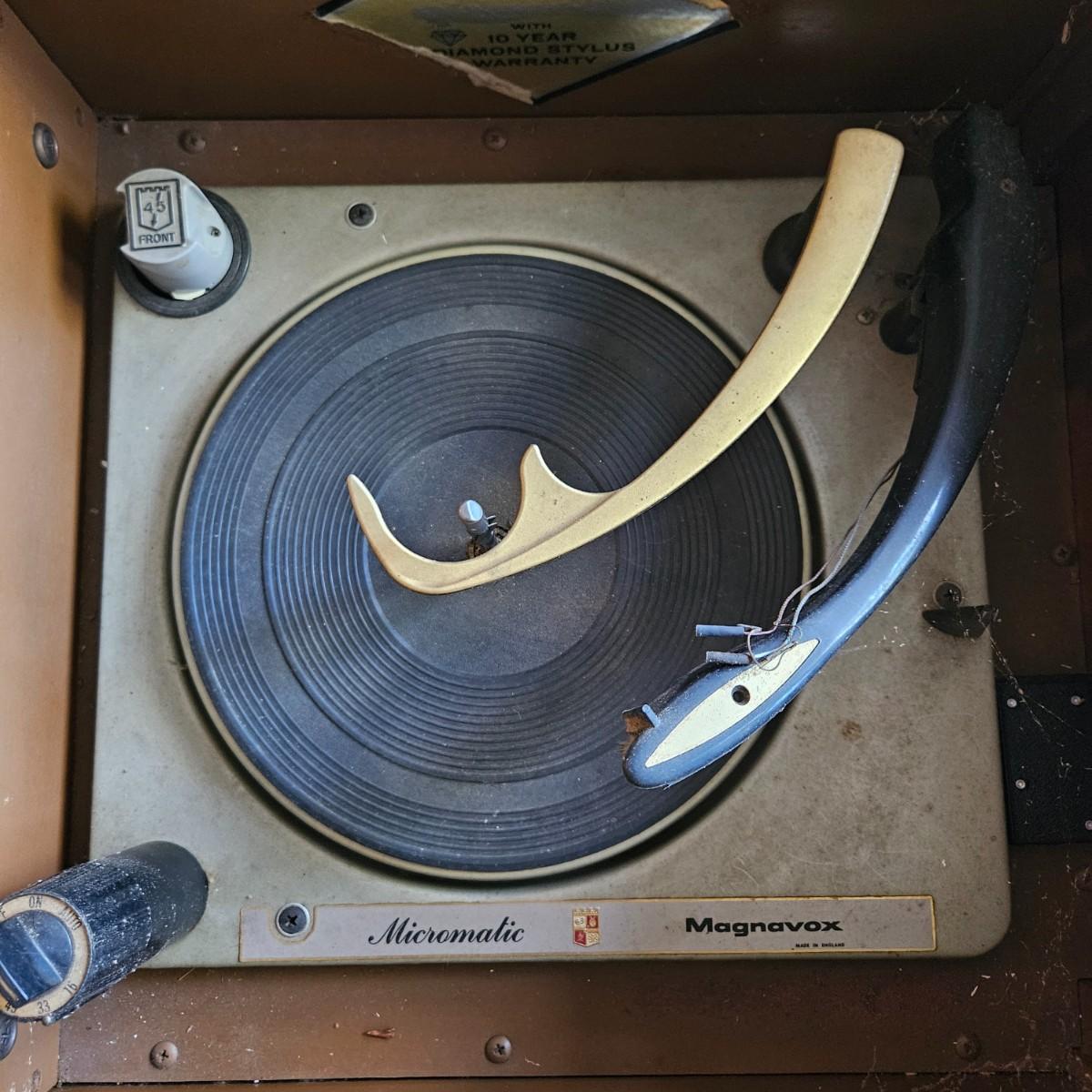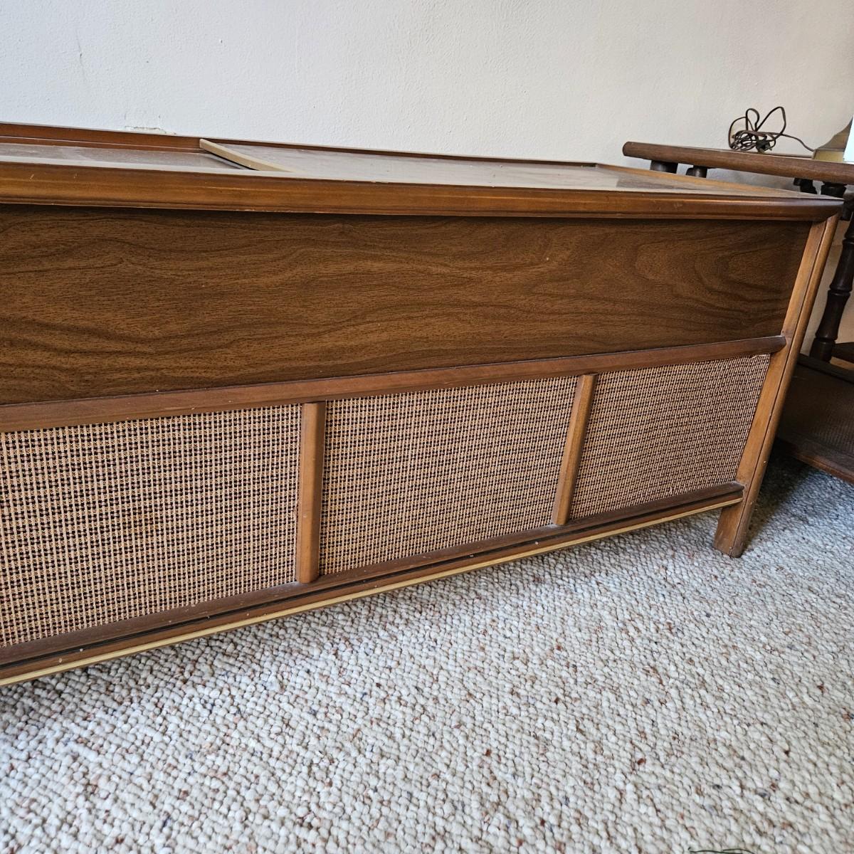 Vintage Magnovox stereo console with a turntable. This item powered on when plugged it, but has a loud tube buzz to it. The turntable also spins, but the wires to the head are exposed and appear to be unattached. It is constructed of a medium, dark stained wood and measures approximately 50" x 17.5" x 19"H. Local pickup only. Winning bidder must bring assistance to help move and load this item due to its weight and/or size.