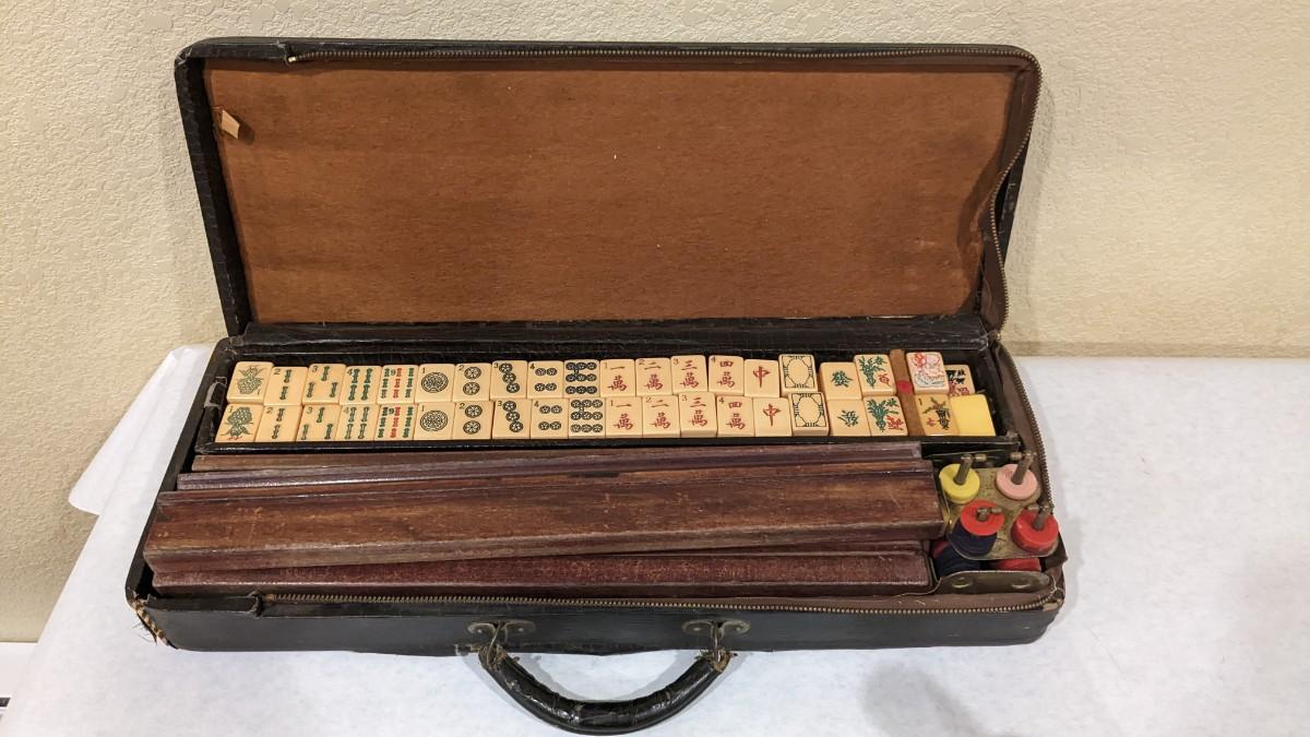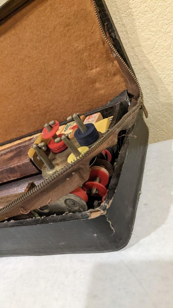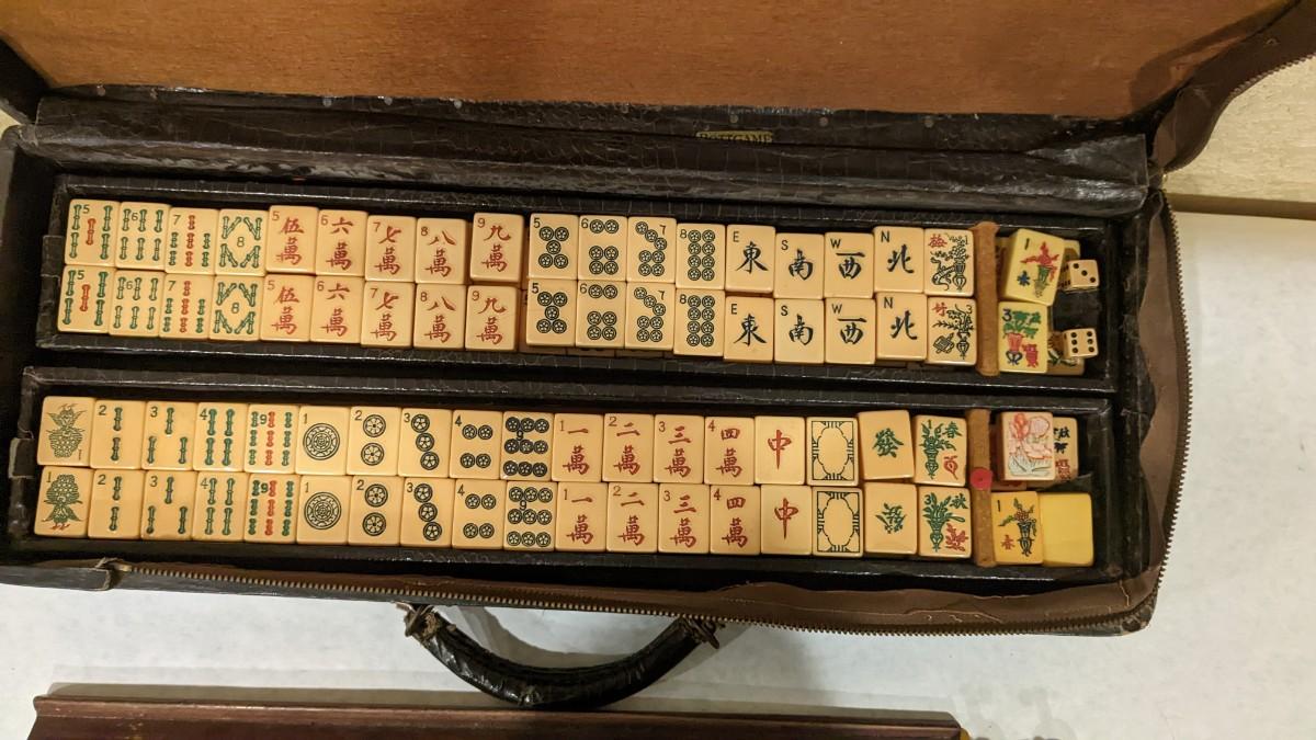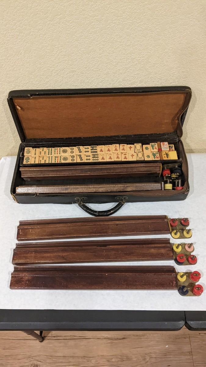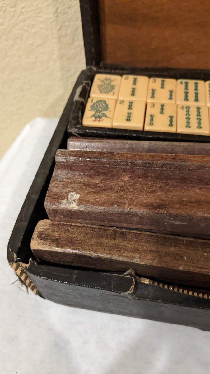 patent leather case with damaged separated zipper, mixed tiles, and 5 wood with acrylic scorers. 2 layers of tiles, Tiles are in great condition, appears that one is missing. Original dice included, a very beautiful set