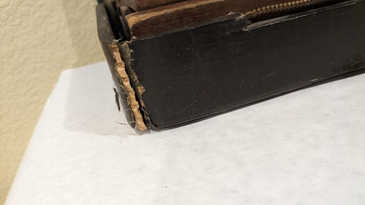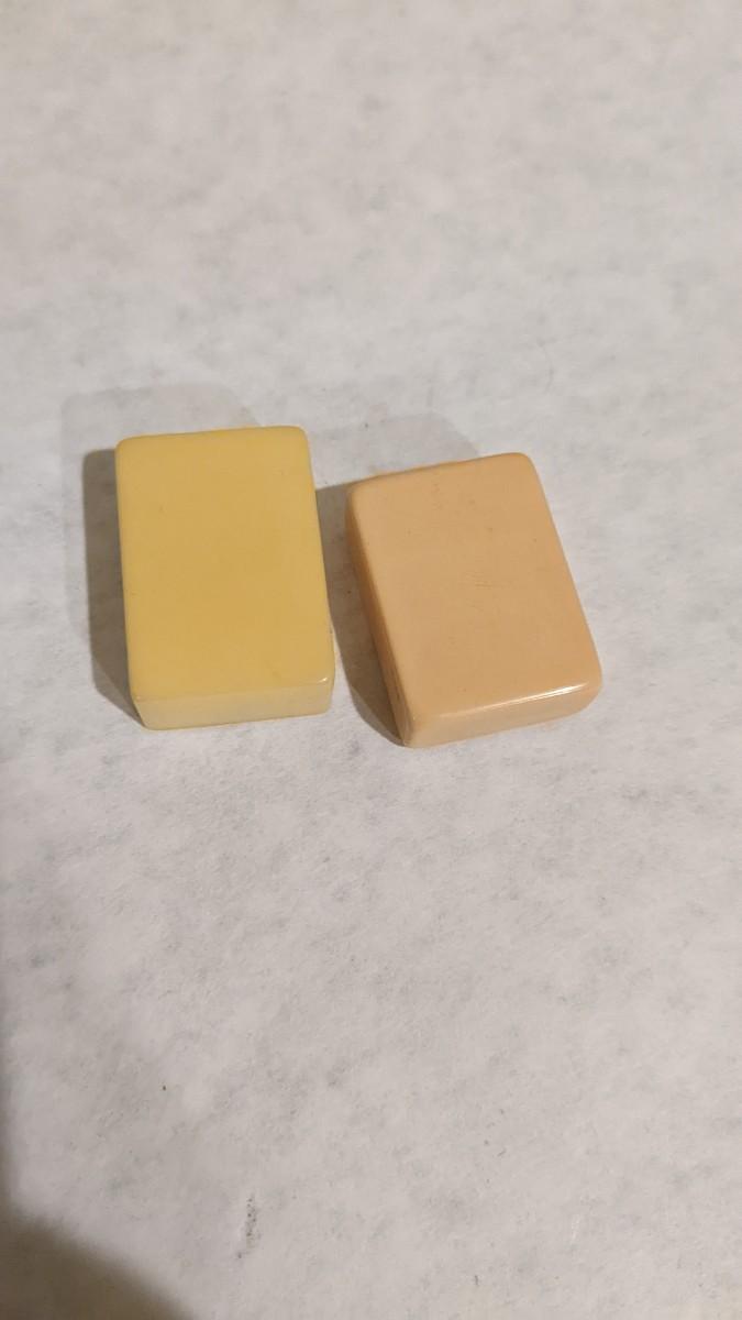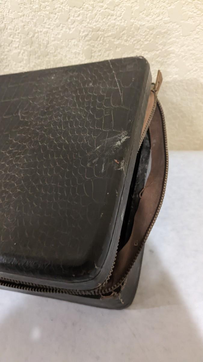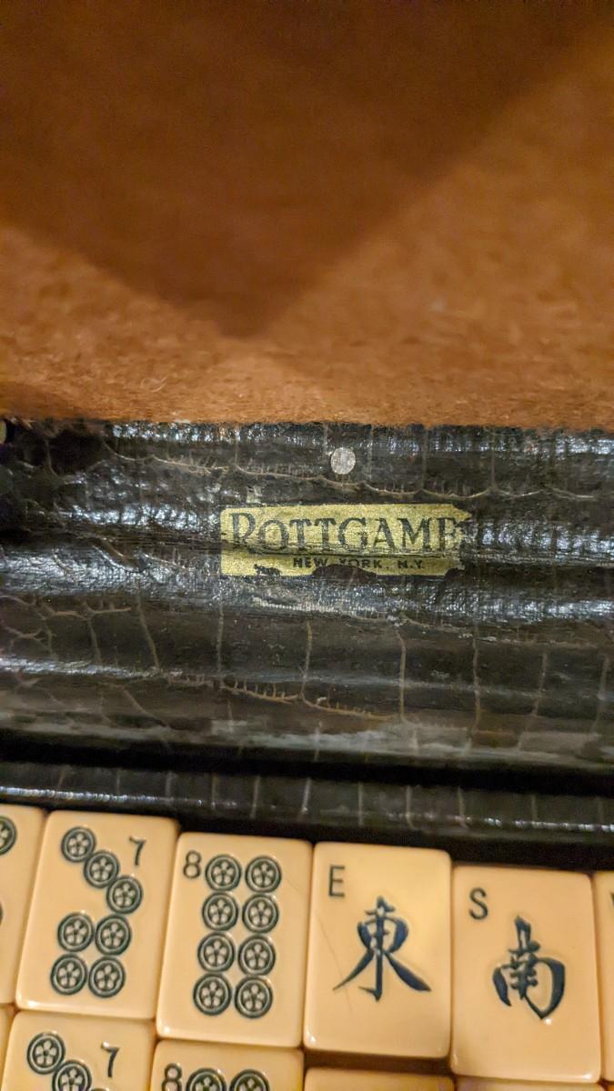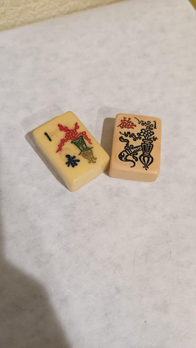 patent leather case with damaged separated zipper, mixed tiles, and 5 wood with acrylic scorers. 2 layers of tiles, Tiles are in great condition, appears that one is missing. Original dice included, a very beautiful set