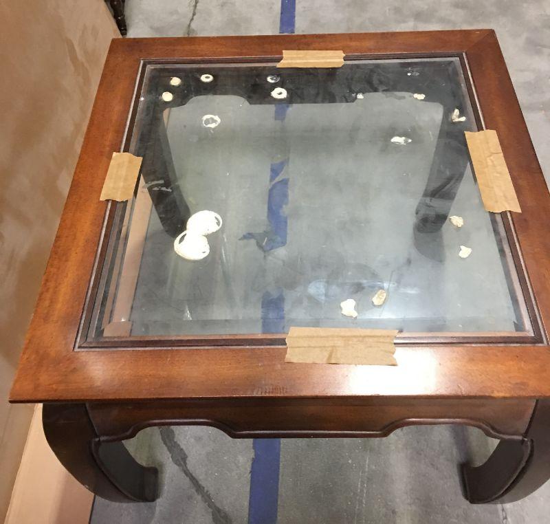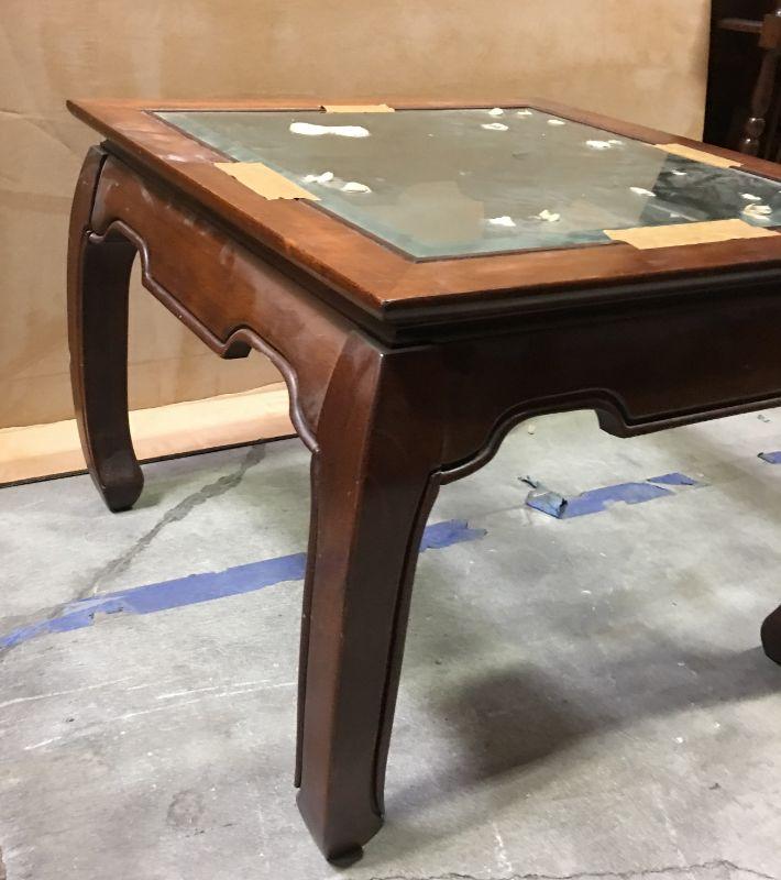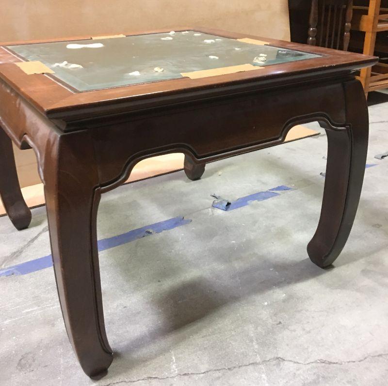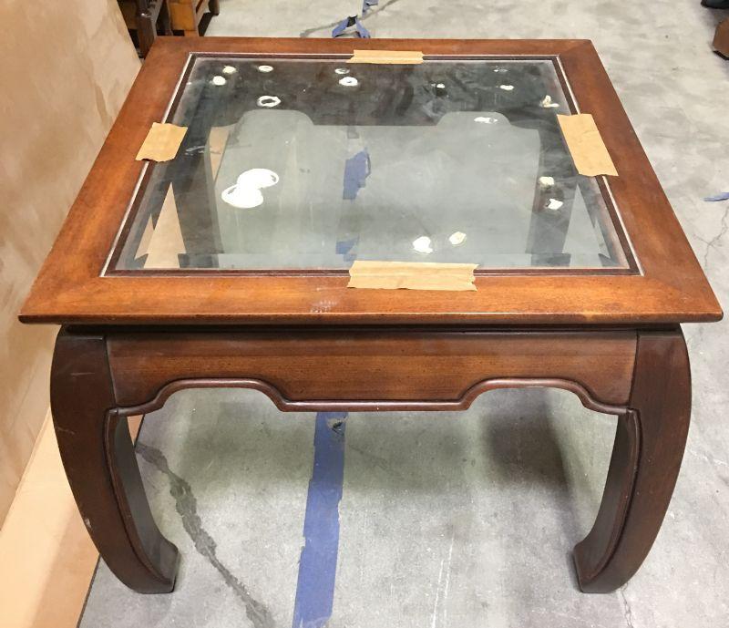 The table is in VG conditions. The glass top was used for displaying various porcelain figurines and some of the glue used to protect the figurines needs to be cleaned. Priced accordingly. Measures 27.5" X 27.5" X 21".