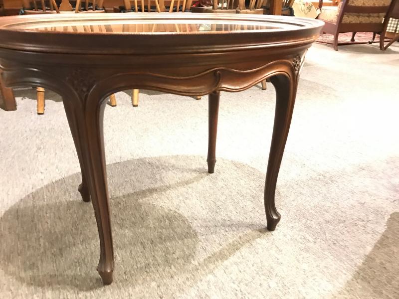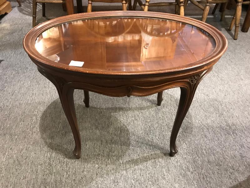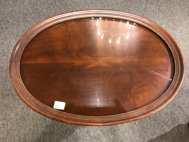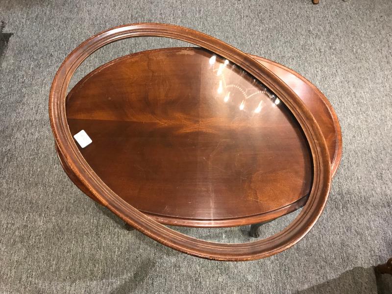 Very nice vintage mahogany oval coffee table with removable mahogany famed glass tray top. In the French style with carved skirt and cabriole legs. In very good condition. 27" x 19 1/2" x 19" H