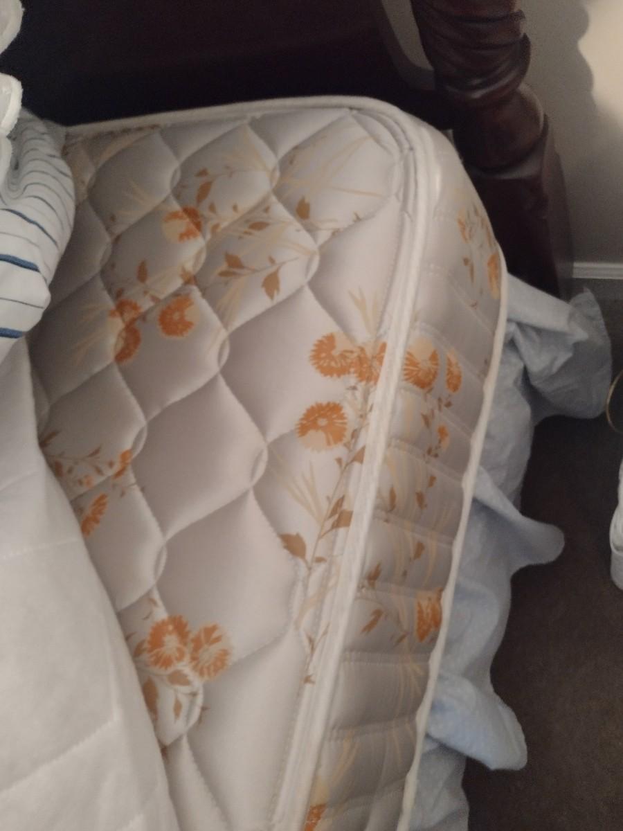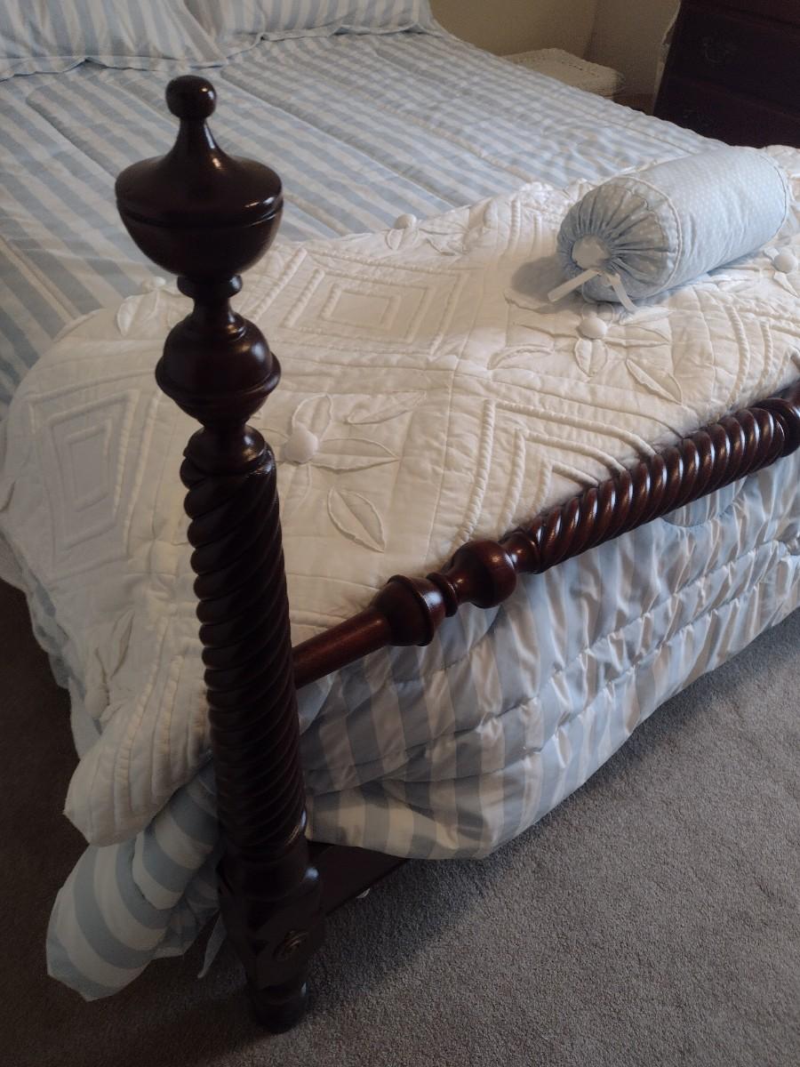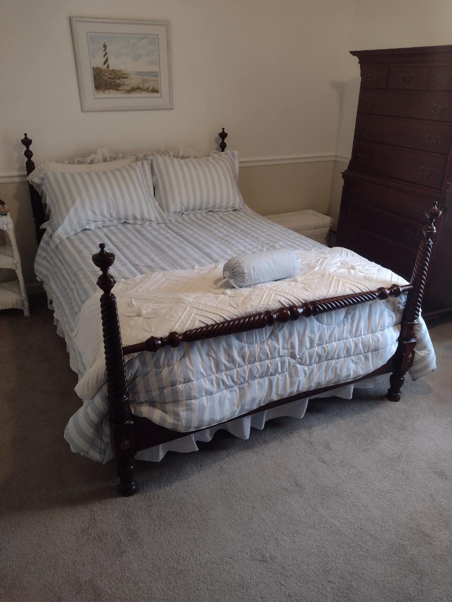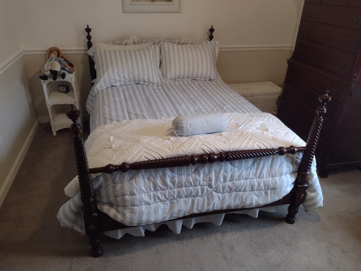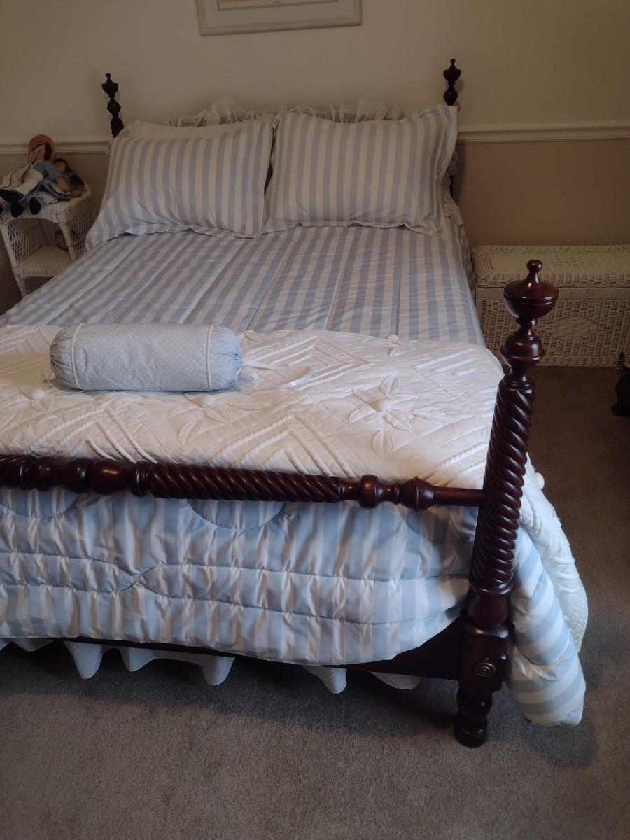 Vintage Mahogany Full Sized Turned Wood Four Poster Bed Set with Mattress and Bedding. Item has been broken down for transport. Item stored within feet of driveway for easy and quick load.