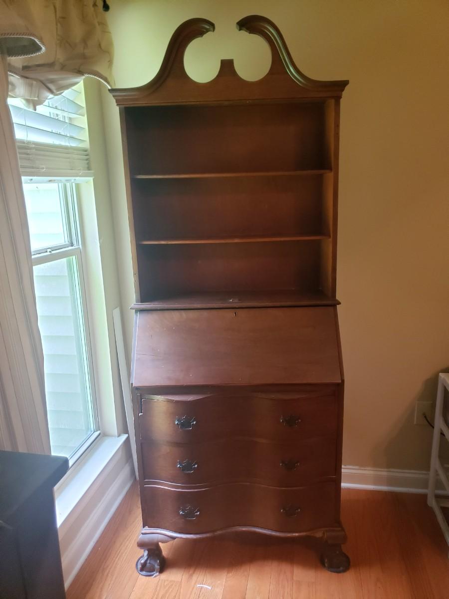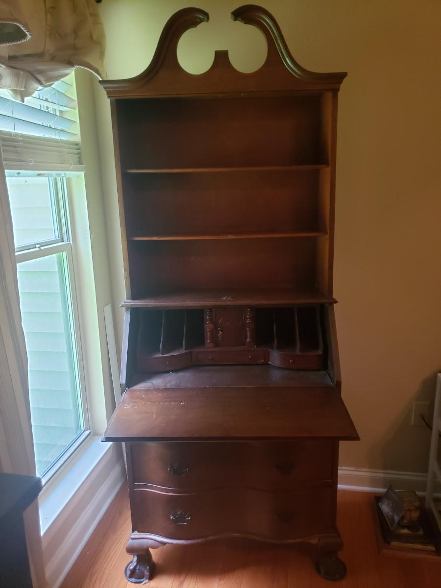 Vintage mahogany slant front Secretary with ball and claw feet. Three shelves and three drawers. Secretary is one piece. Good condition. 76"H x 32"W x 16" D.