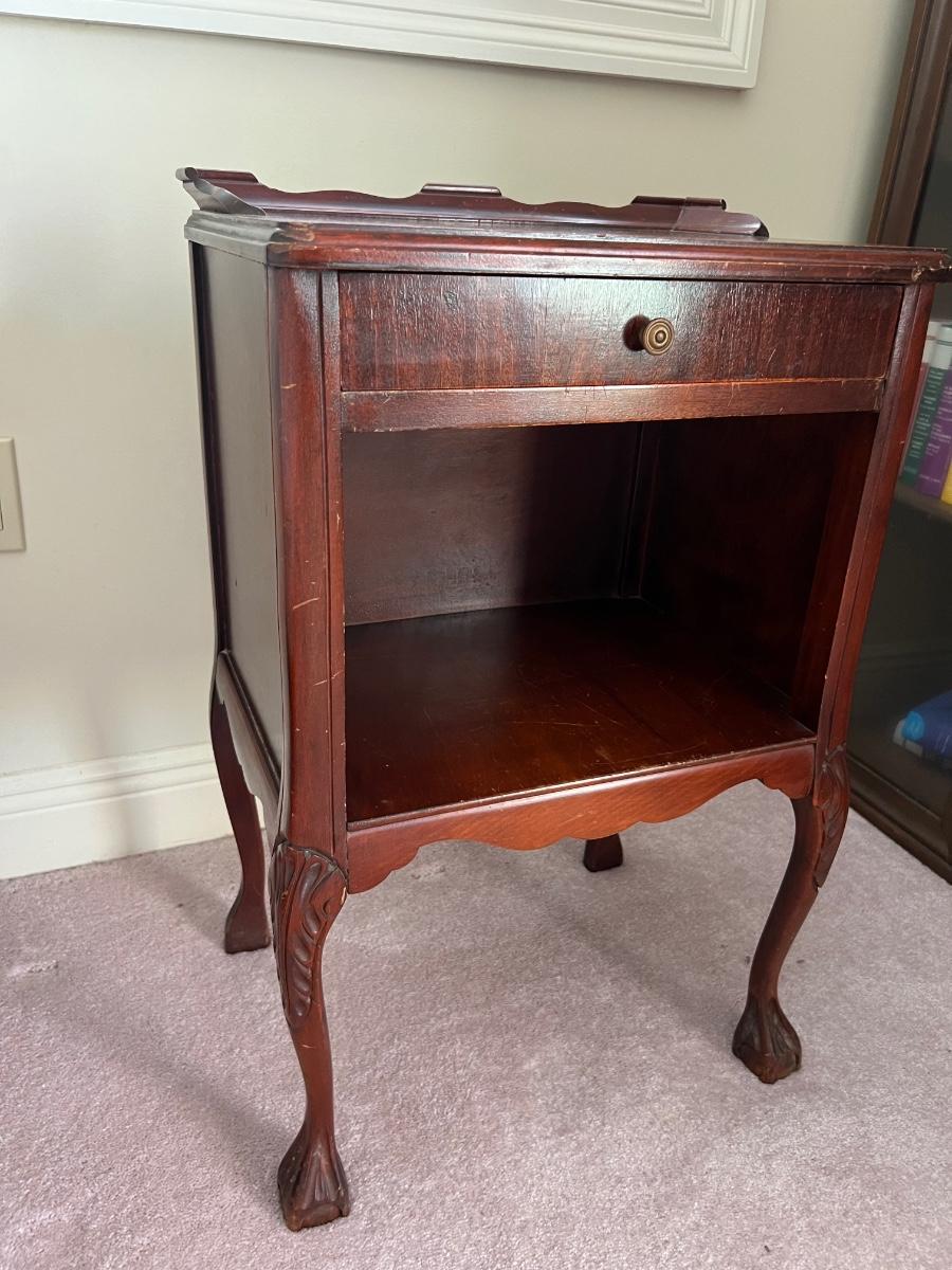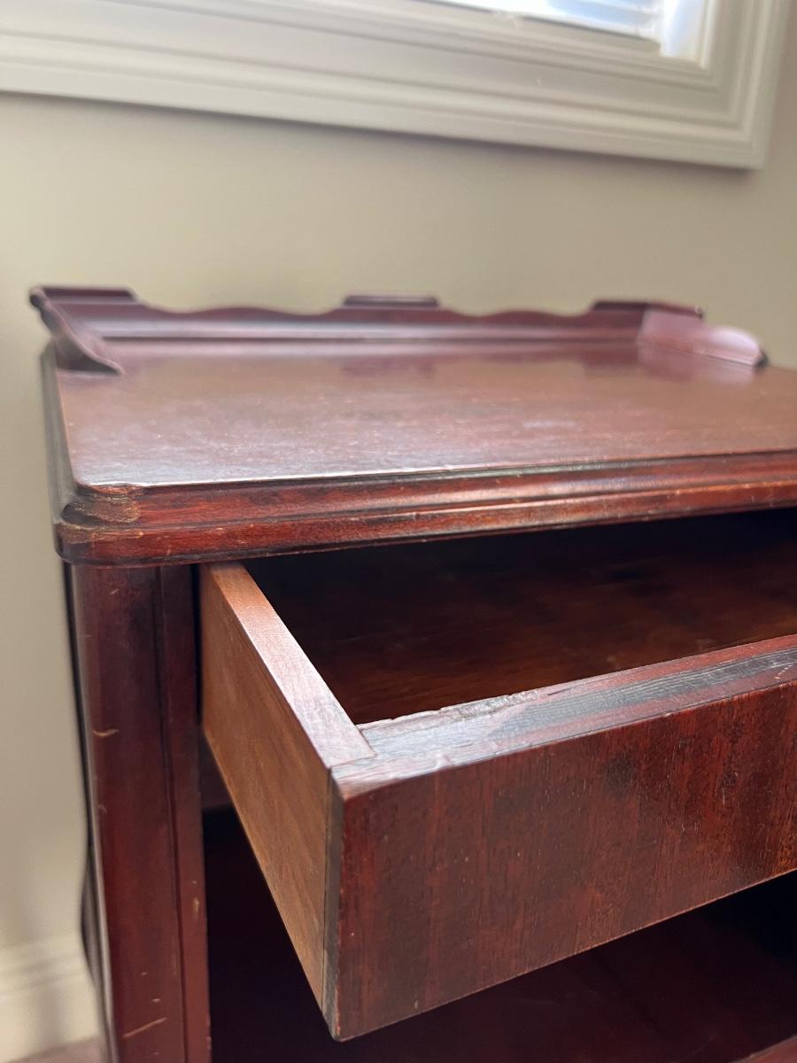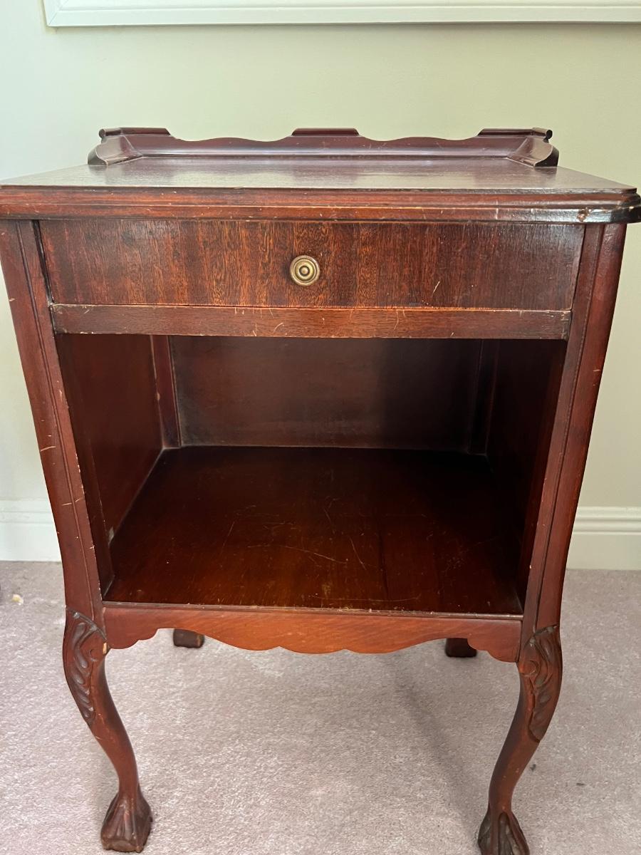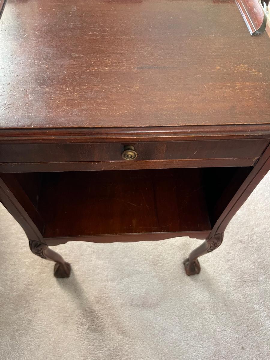 Vintage Mahogany Side Table With drawer. Measures 29 inches tall, 18 inches wide and 13 inches deep. Does have some surface scratches and signs of wear. Please see pictures for condition.