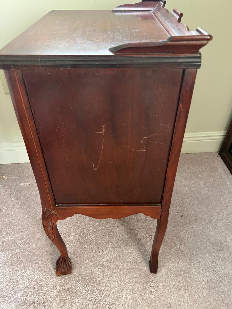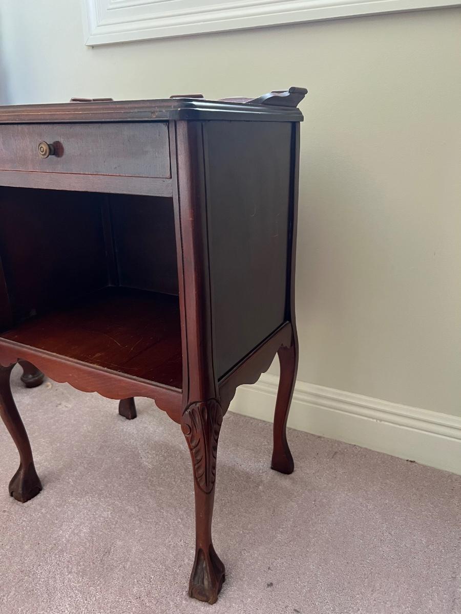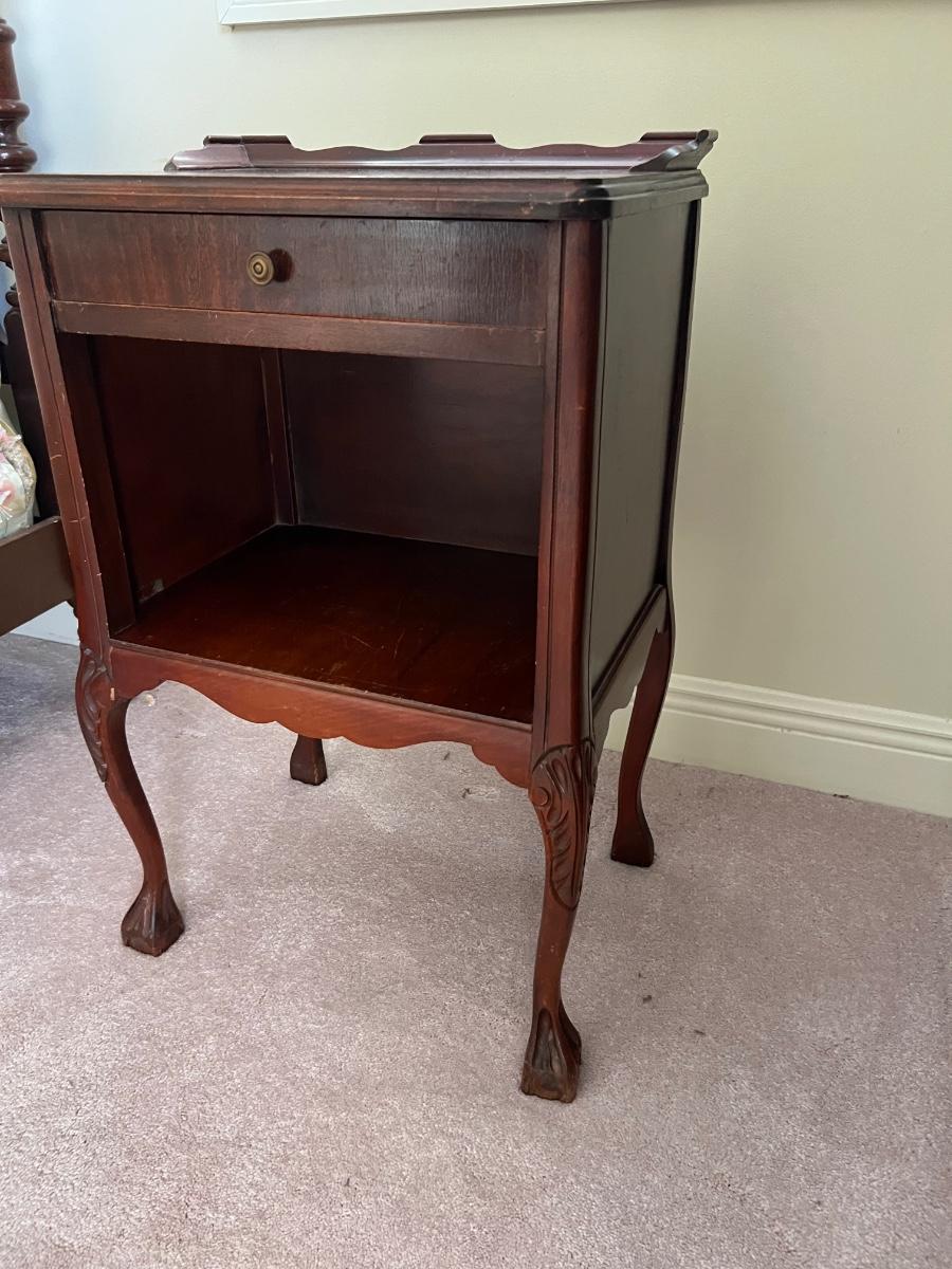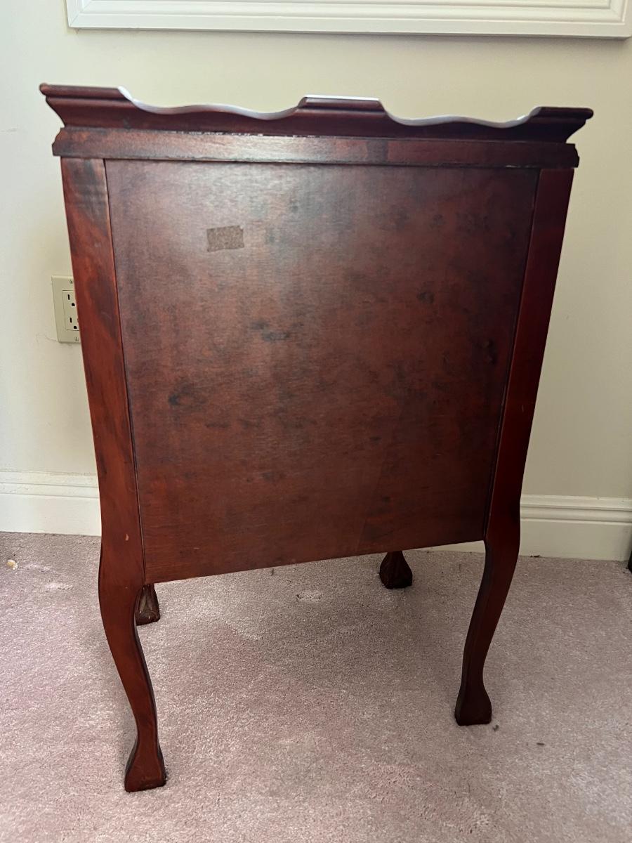 Vintage Mahogany Side Table With drawer. Measures 29 inches tall, 18 inches wide and 13 inches deep. Does have some surface scratches and signs of wear. Please see pictures for condition.