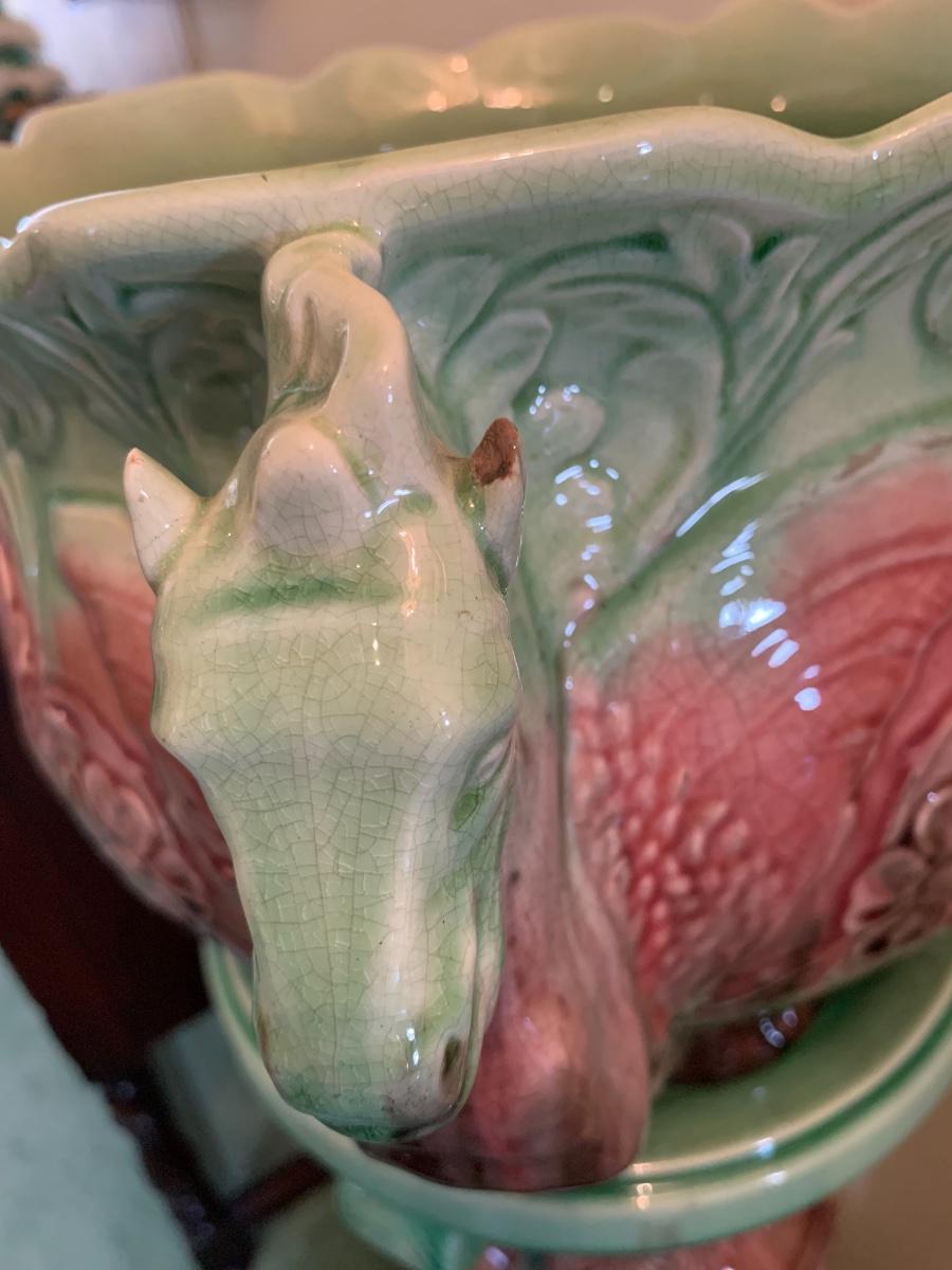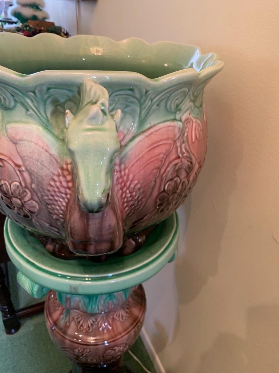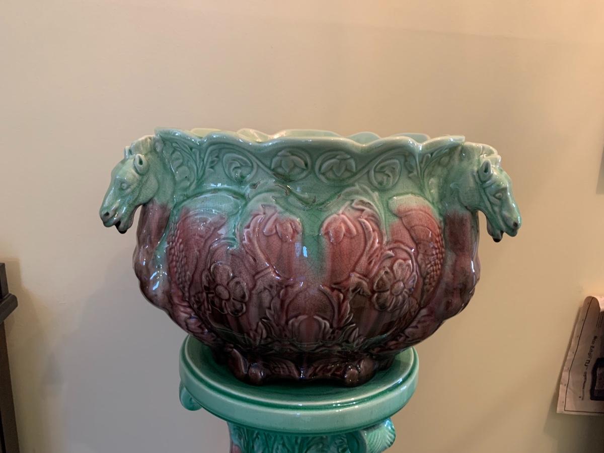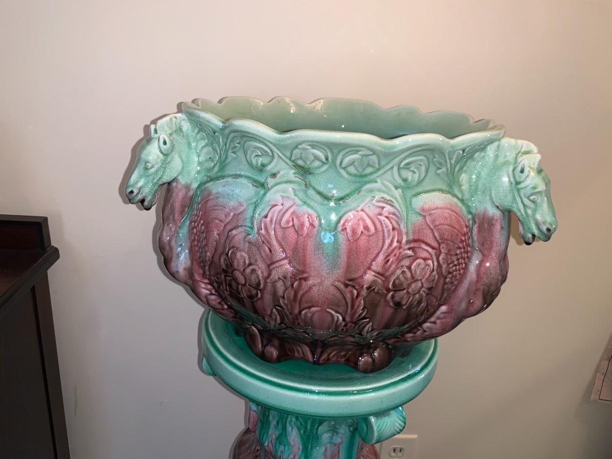 Beautiful and truly unique jardinere. Large decorative bowl rests on sseparate pedestal. This piece is in excellnet condition except for one missing horse ear as shown. No cracks .