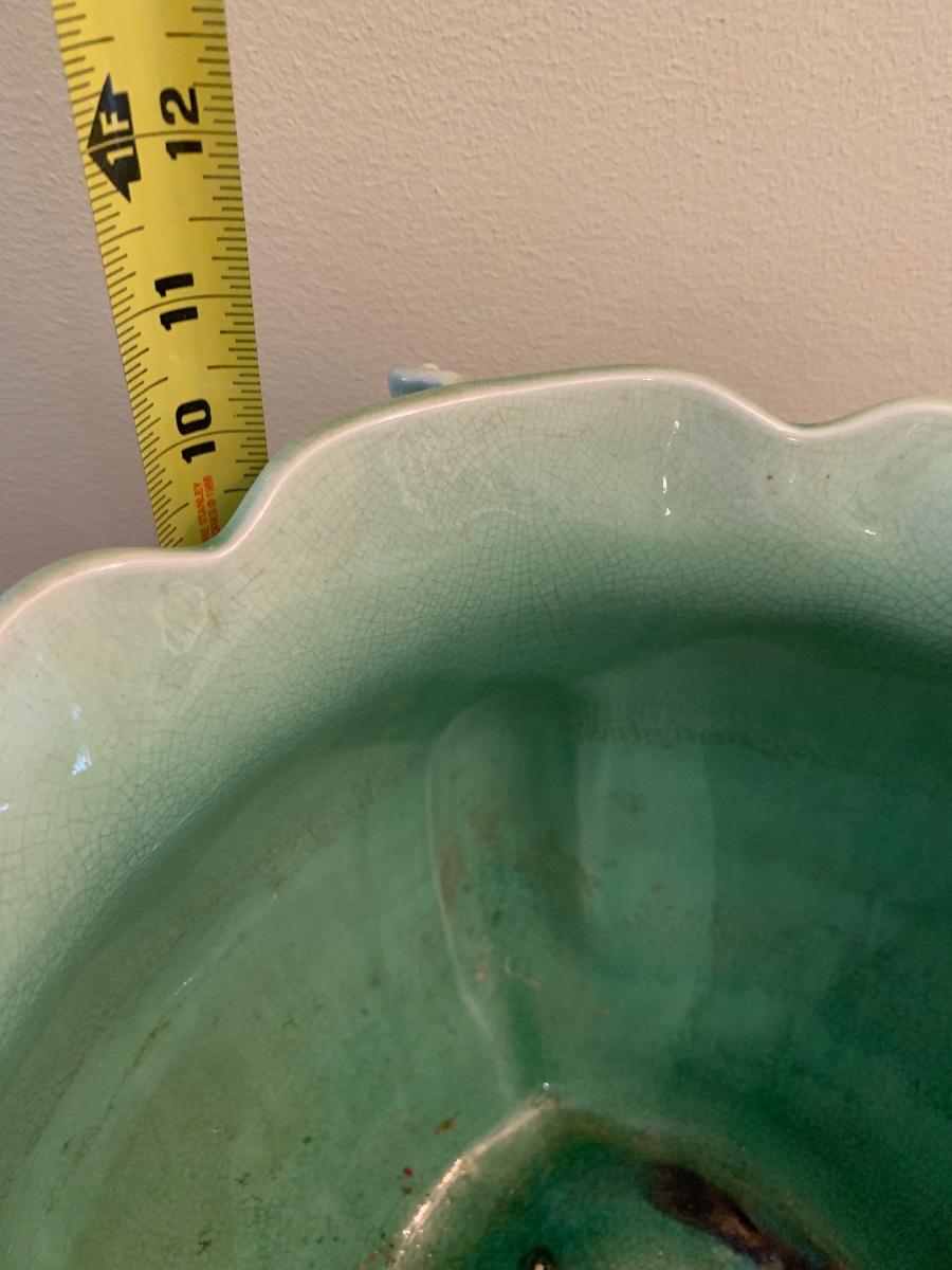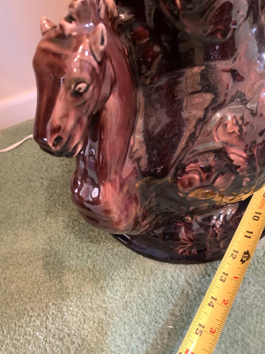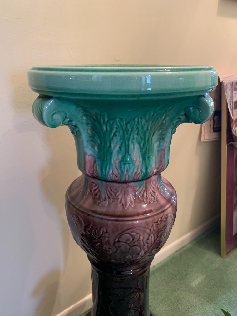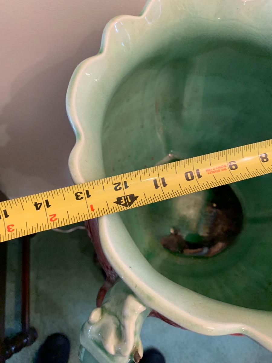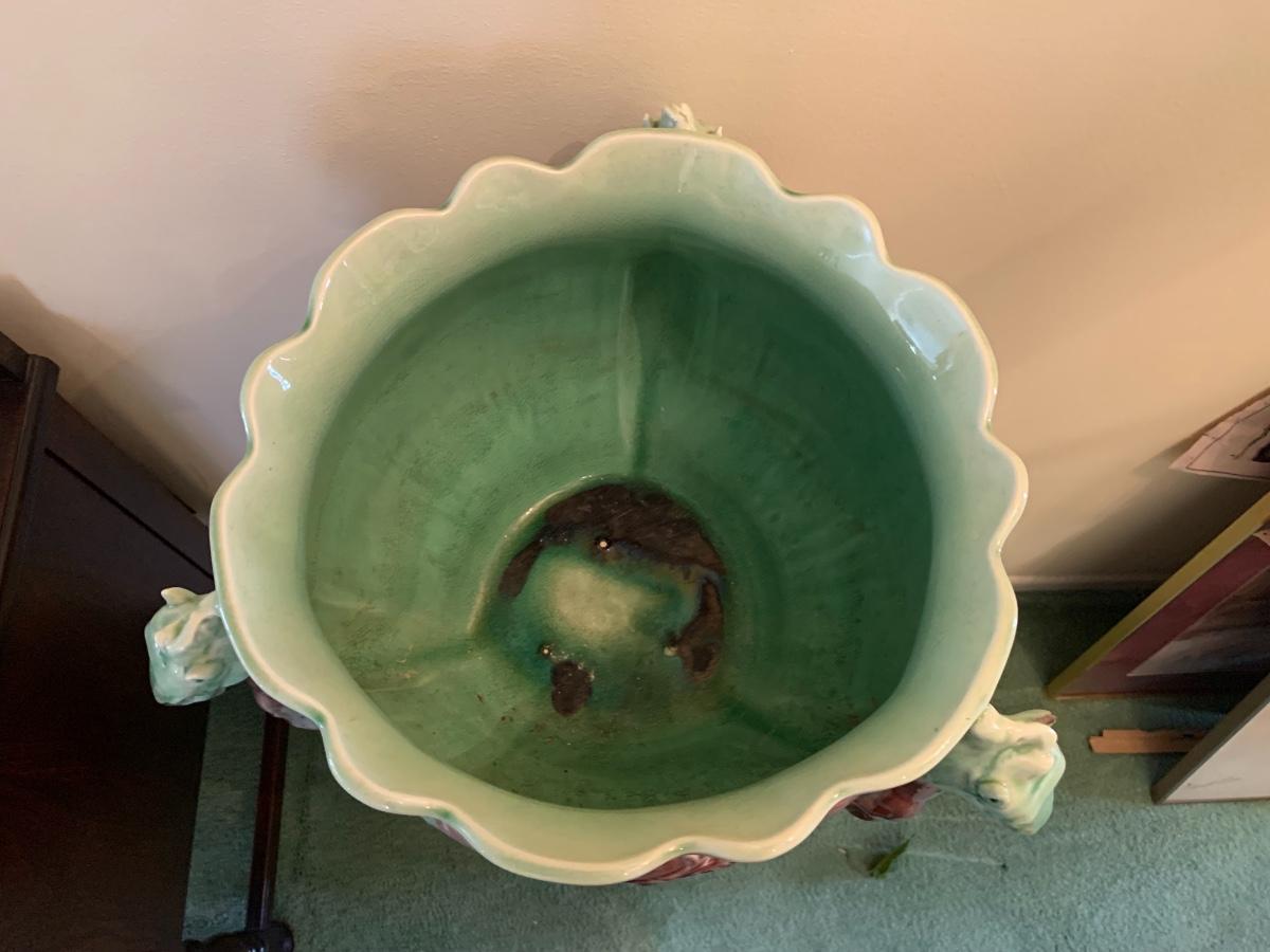Beautiful and truly unique jardinere. Large decorative bowl rests on sseparate pedestal. This piece is in excellnet condition except for one missing horse ear as shown. No cracks .