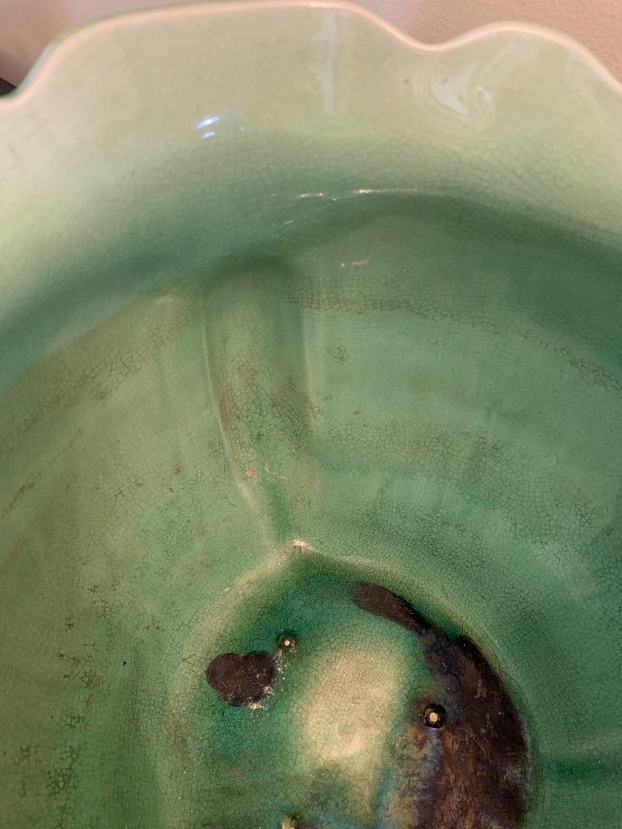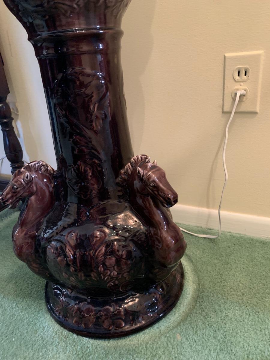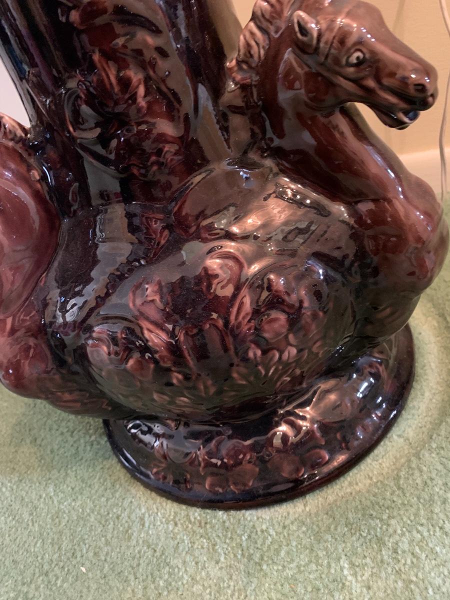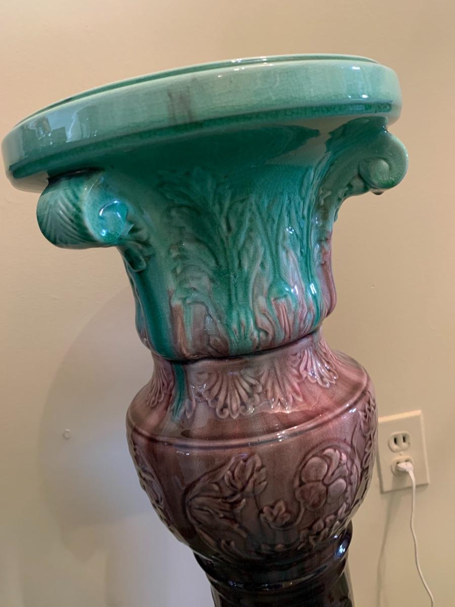 Beautiful and truly unique jardinere. Large decorative bowl rests on sseparate pedestal. This piece is in excellnet condition except for one missing horse ear as shown. No cracks .