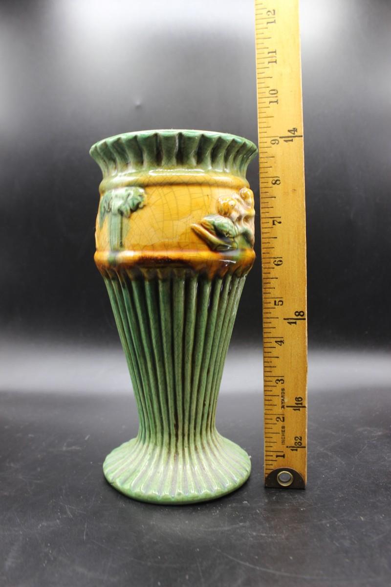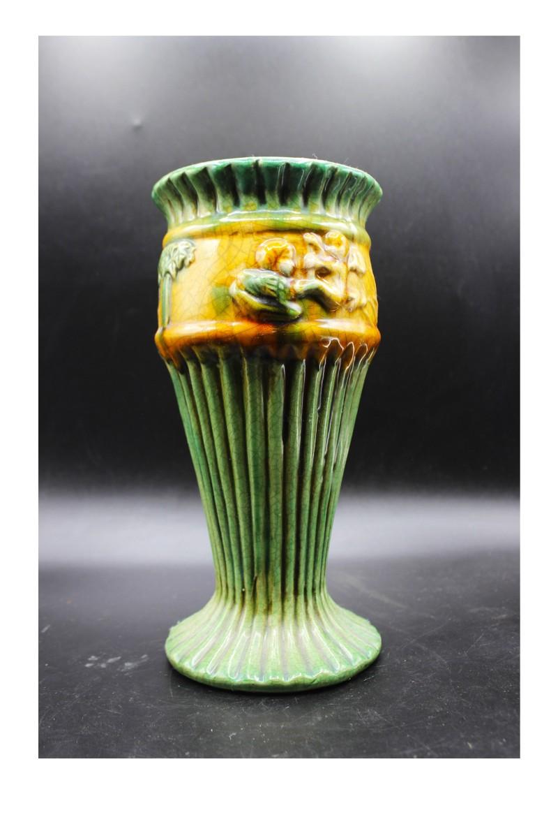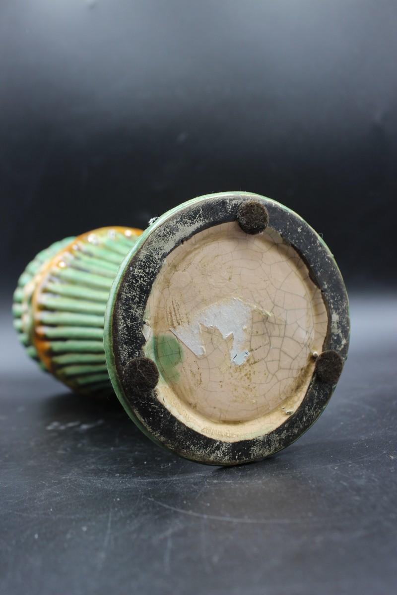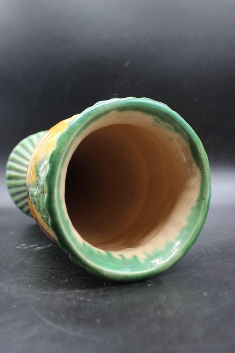 Vintage Majolica Style Cherub Art Deco Ribbed Vase, there are no significant cracks or chips to the piece and is in good vintage condition. Check pictures for more details and for sizing.