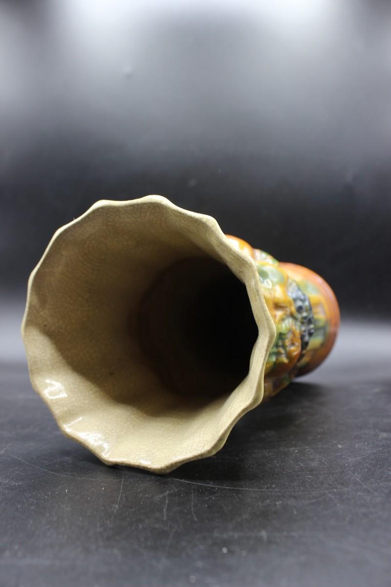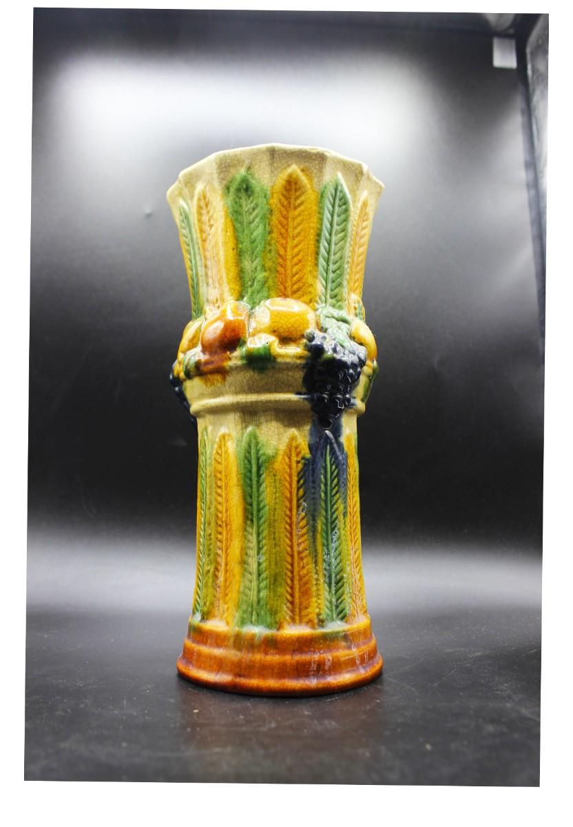 Vintage Majolica Textured Feathers Adorned with Fruits Art Vase