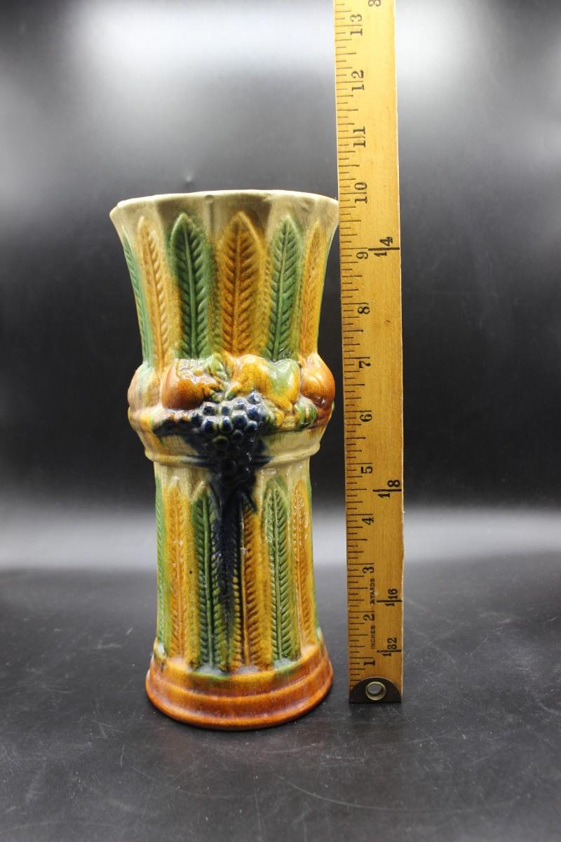 Vintage Majolica Textured Feathers Adorned with Fruits Vase, there are no significant cracks or chips to the decorative vase and is in good vintage condition. Check pictures for more details and for sizing.