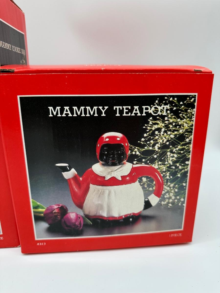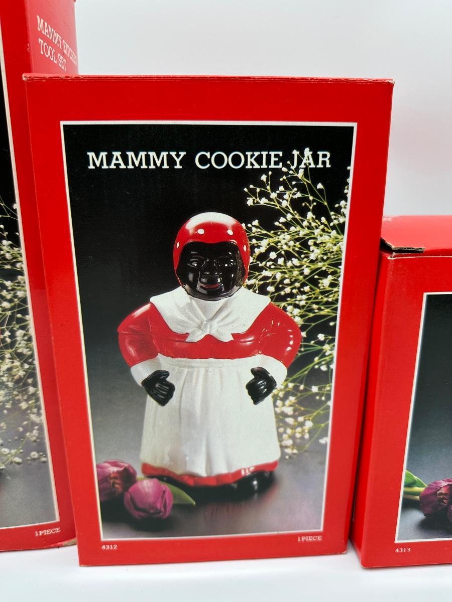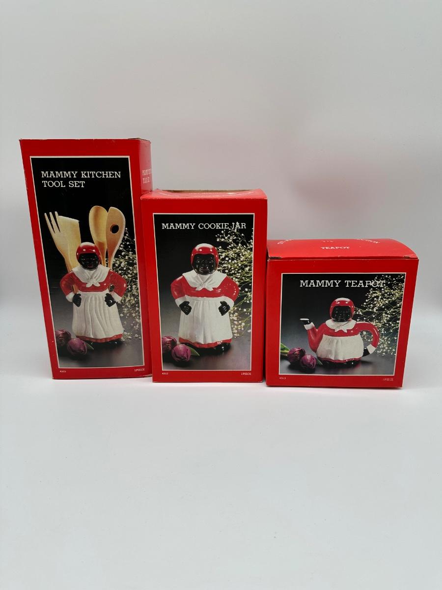 Vintage 3-piece Mammy kitchen décor set consisting of a cookie jar, teapot, and kitchen tool holder. Each piece features matching red, white, and black figural design. Set includes the original retail boxes, with internal packing still present. Decorative ceramic pieces intended for display/collection rather than daily use.