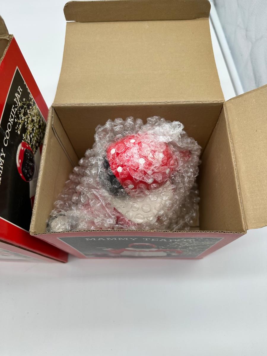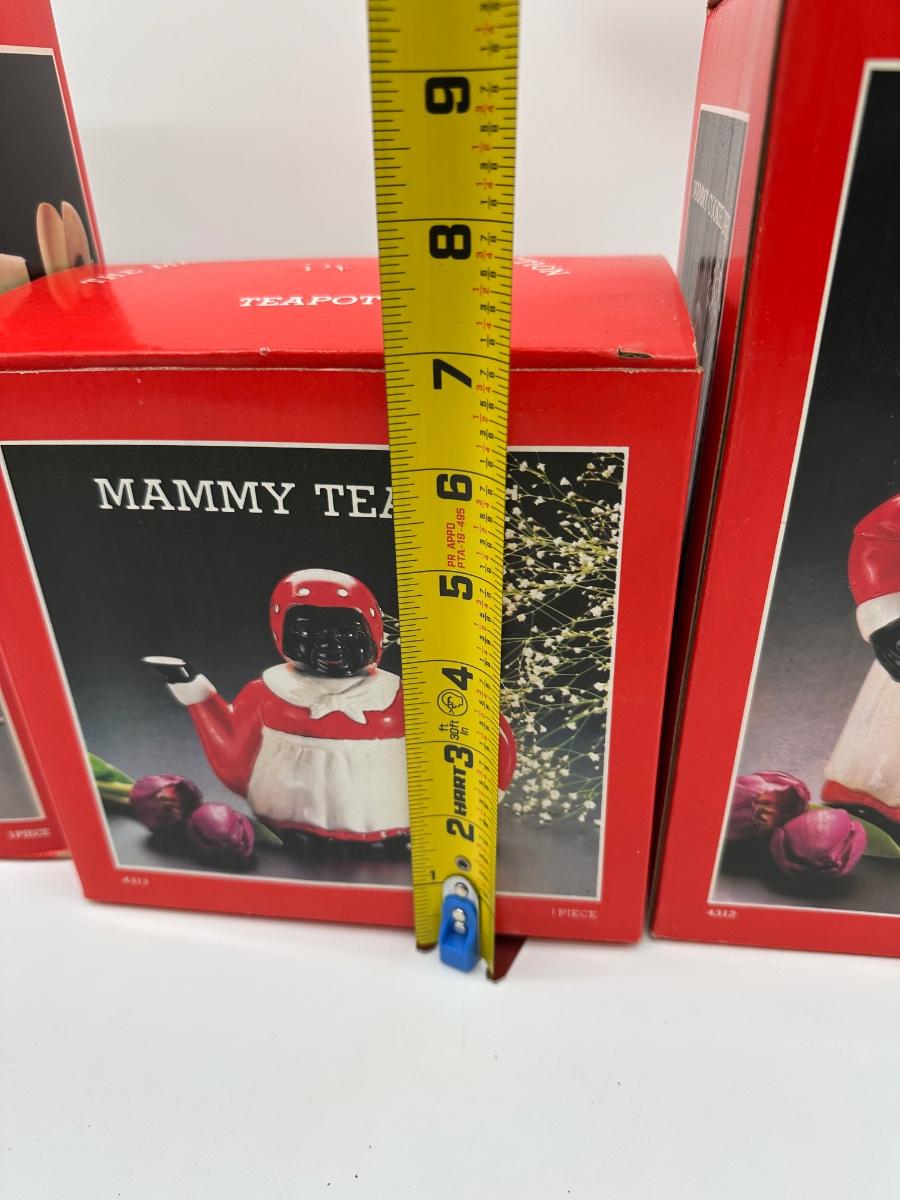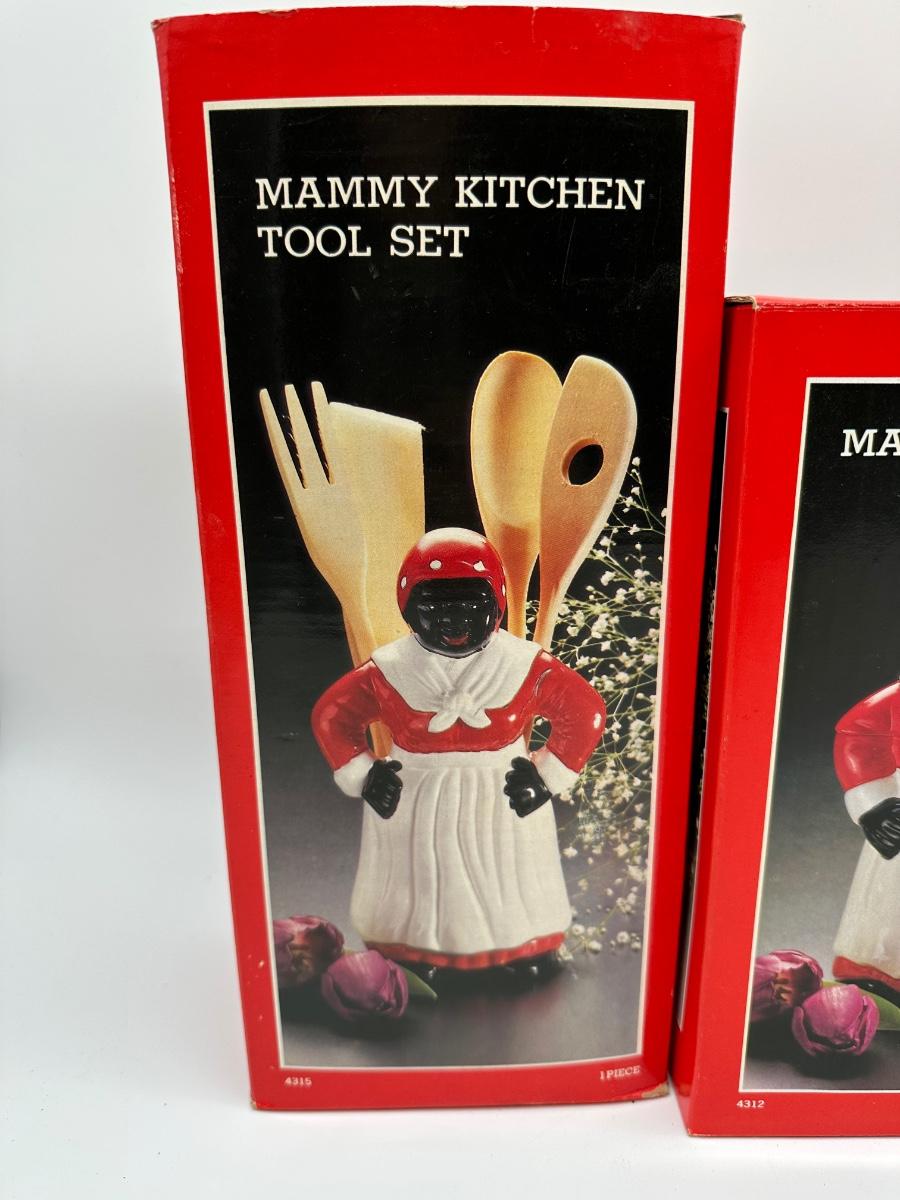 Vintage 3-piece Mammy kitchen décor set consisting of a cookie jar, teapot, and kitchen tool holder. Each piece features matching red, white, and black figural design. Set includes the original retail boxes, with internal packing still present. Decorative ceramic pieces intended for display/collection rather than daily use.