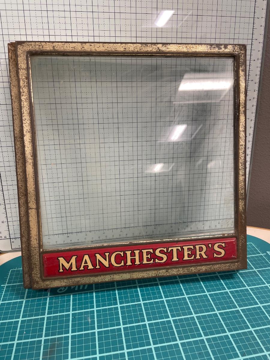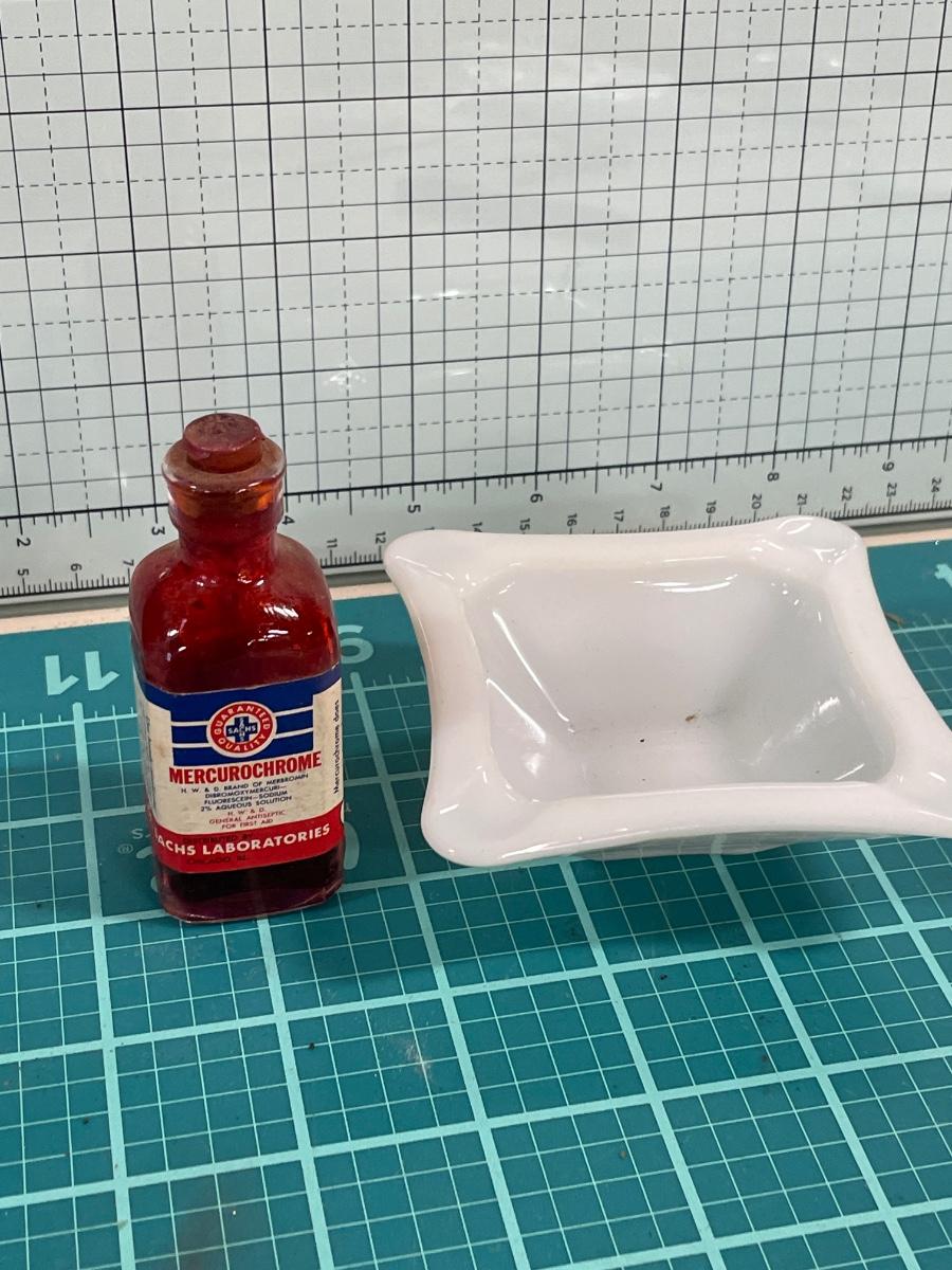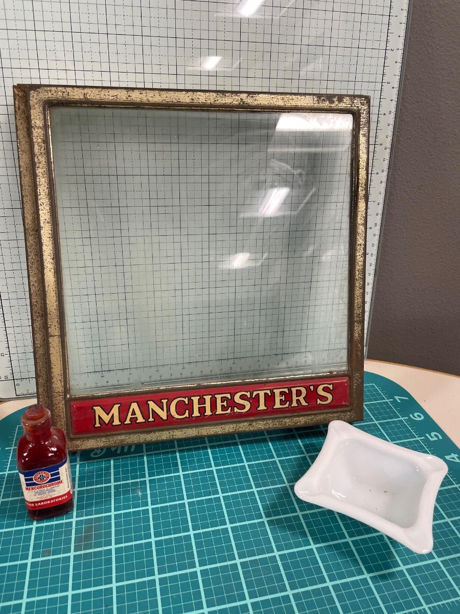Vintage Manchester’s countertop buscuit display with mercurochrome bottle and milk glass ashtray