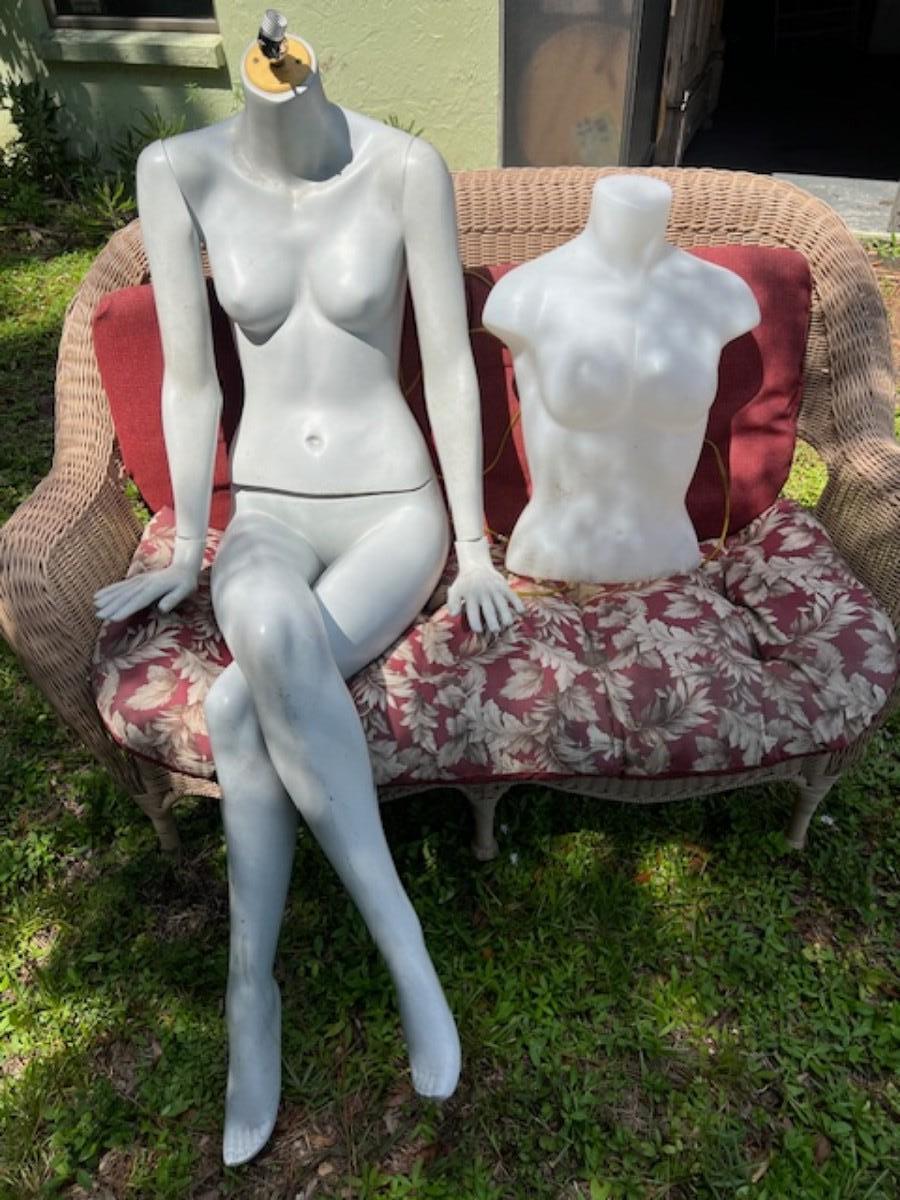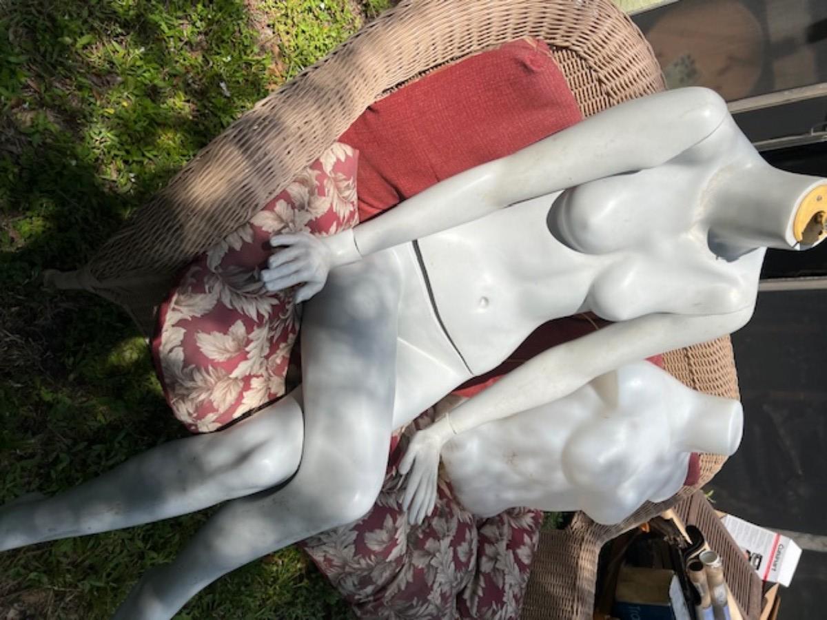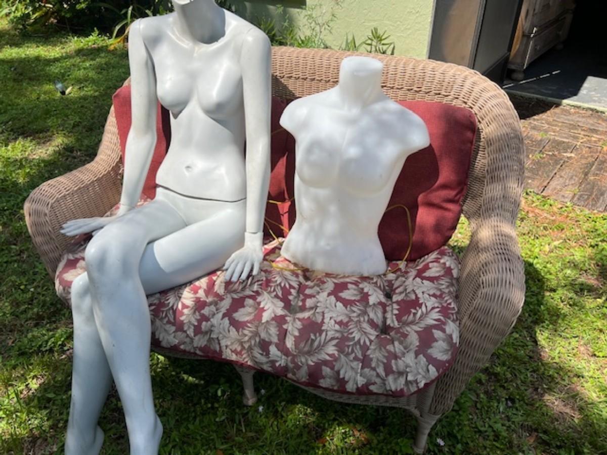 Includes an articulating seated ladie's mannequin wired to be a lamp, a torso, and an all weather wicker loveseat. **WINNING BIDDER MUST TAKE ALL ITEMS IN LOT.**