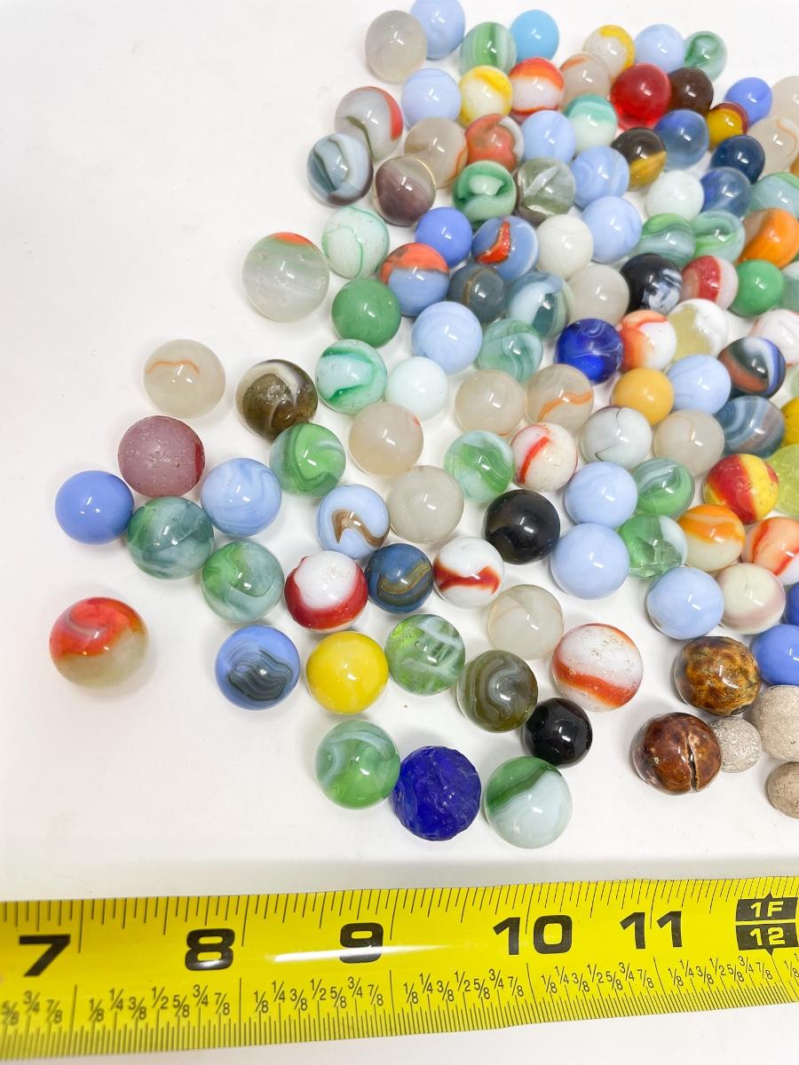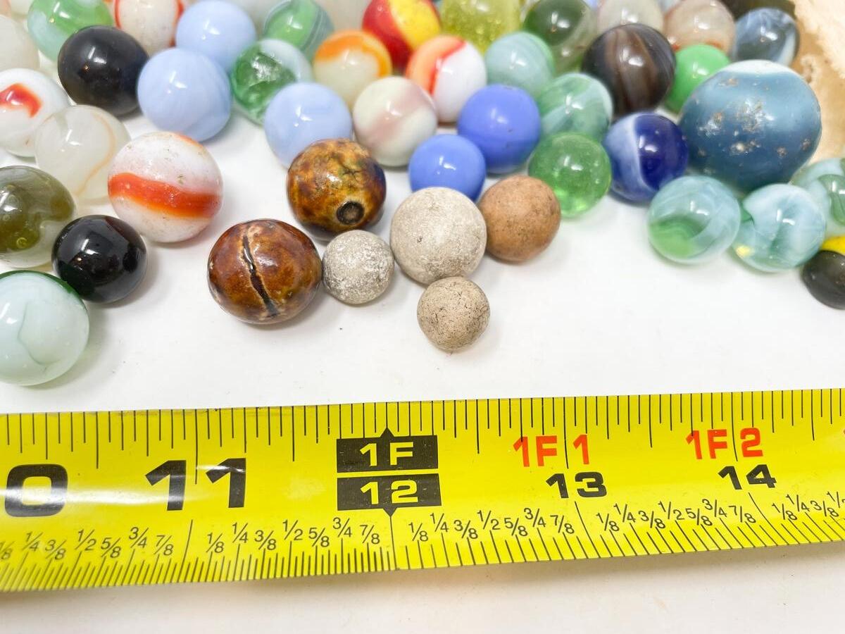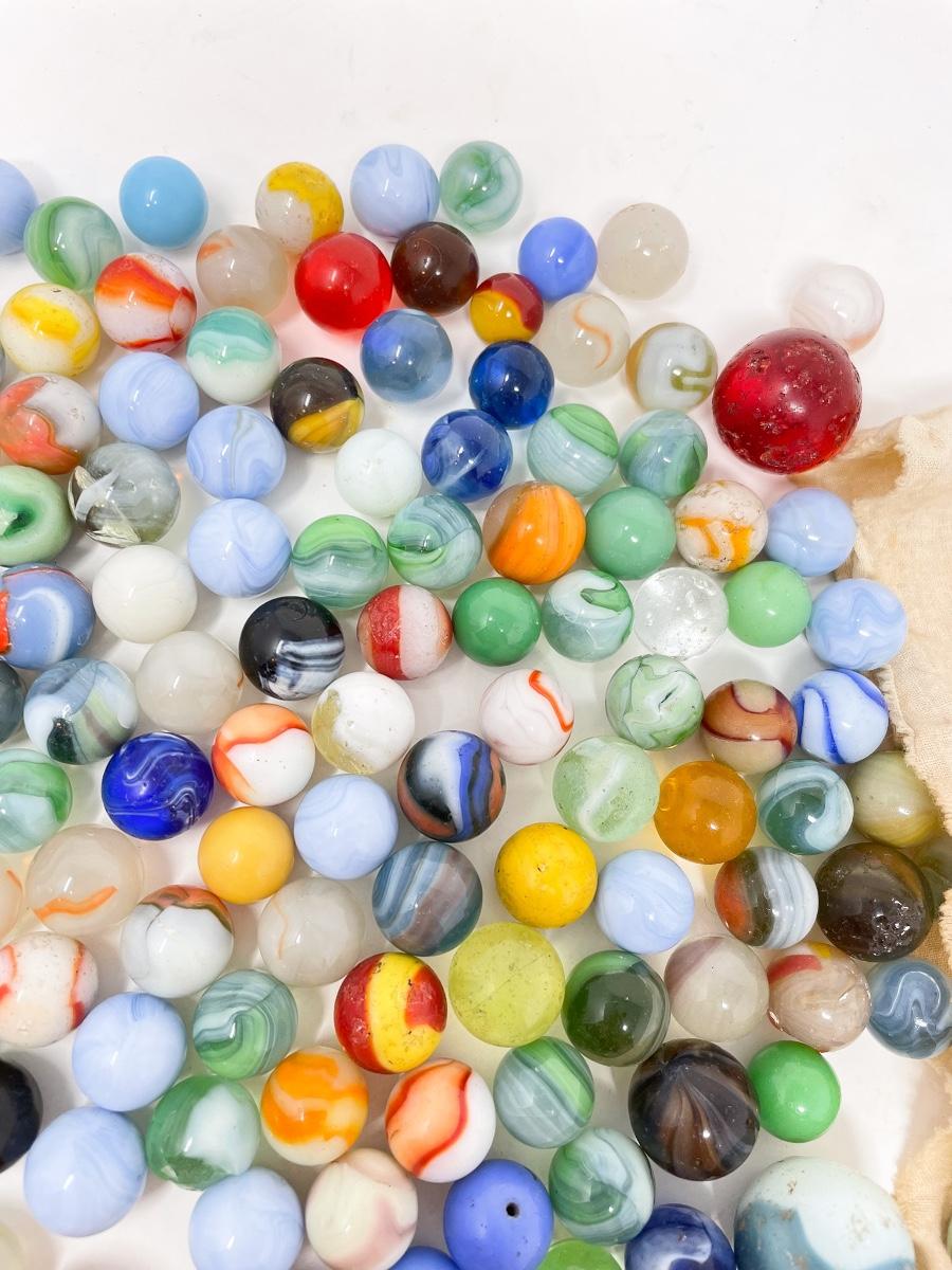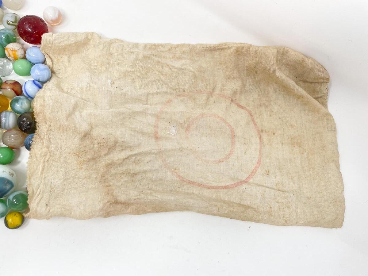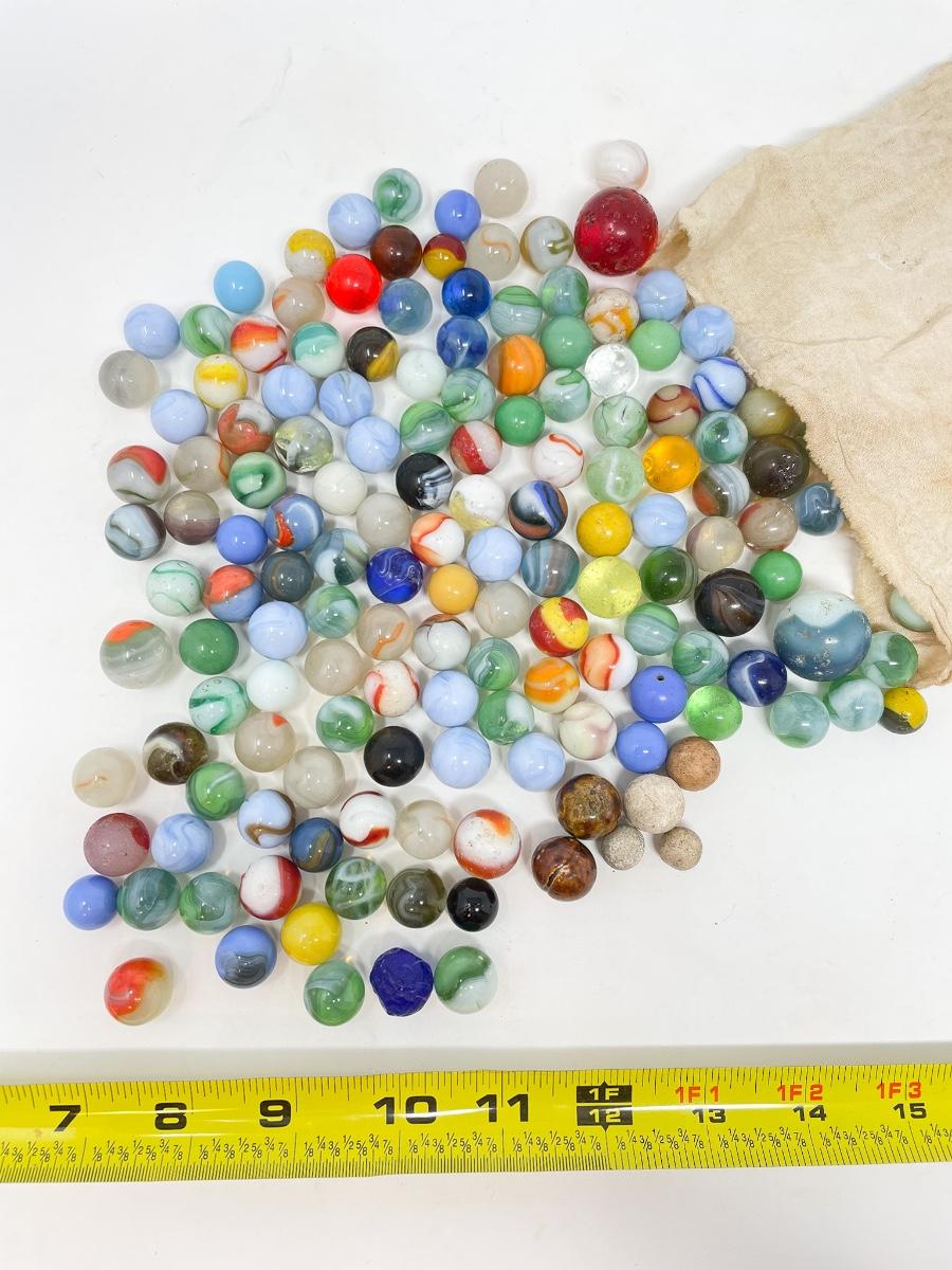 Great variety of marbles - many if not all appear vintage. Includes some clay marbles - possibly Bennington (see pictures). Includes fabric bag with target.