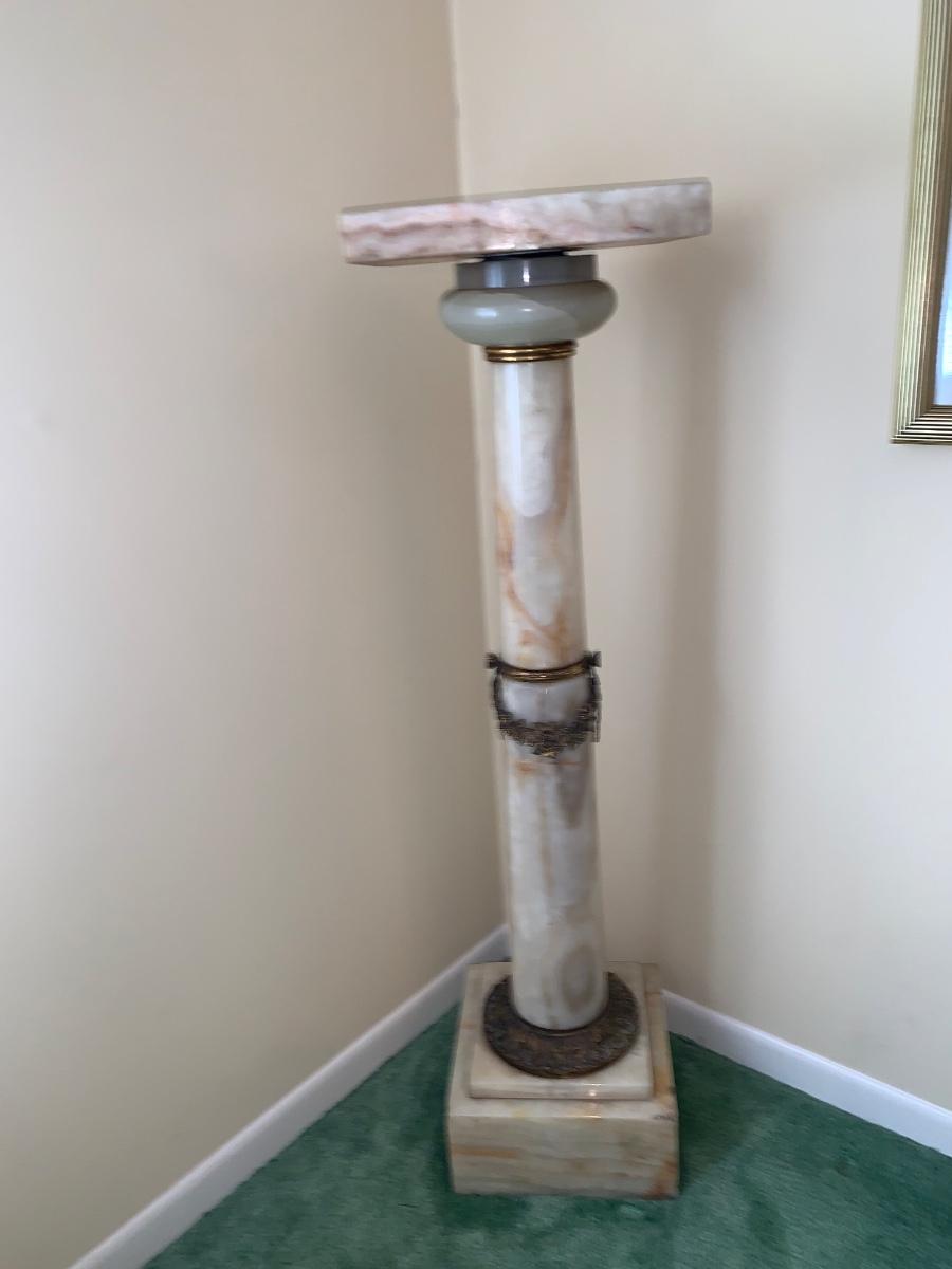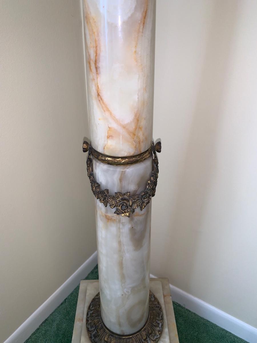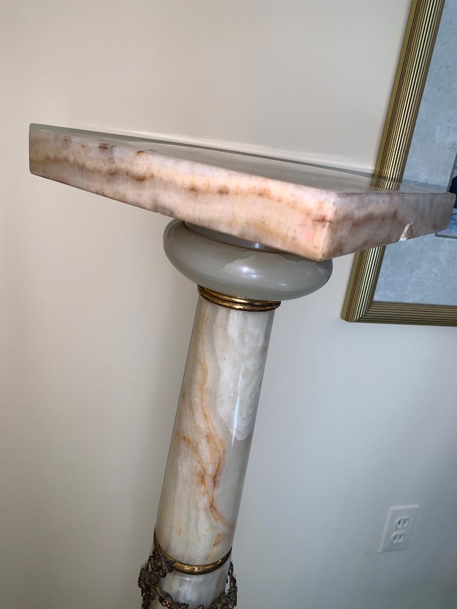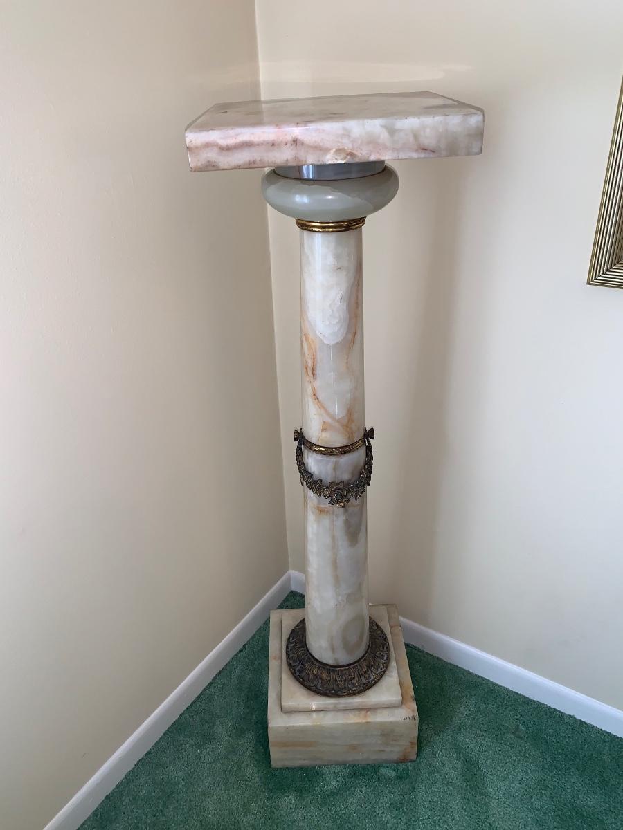 Vintage Onyx pedestal with decorative brass details. Top swivels. Very heavy! Excellent condition.