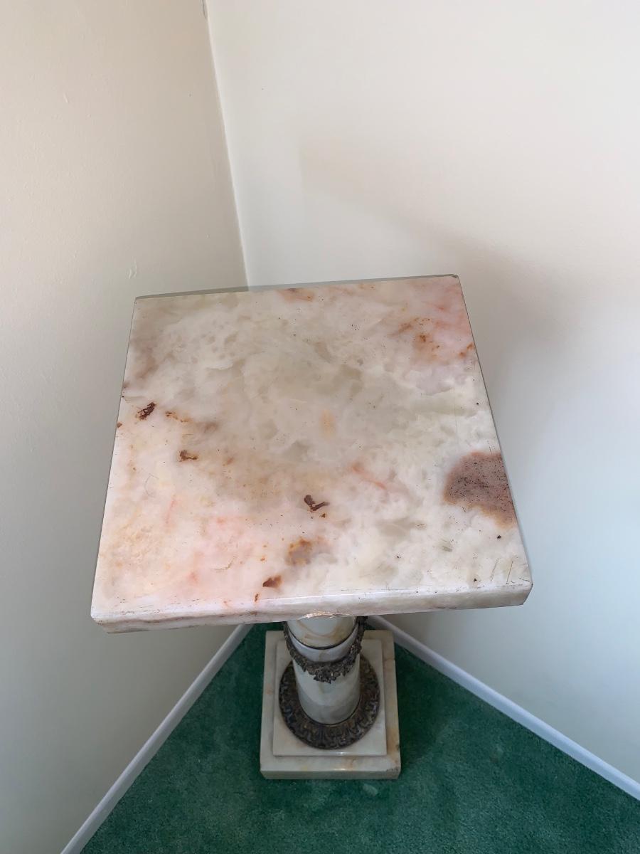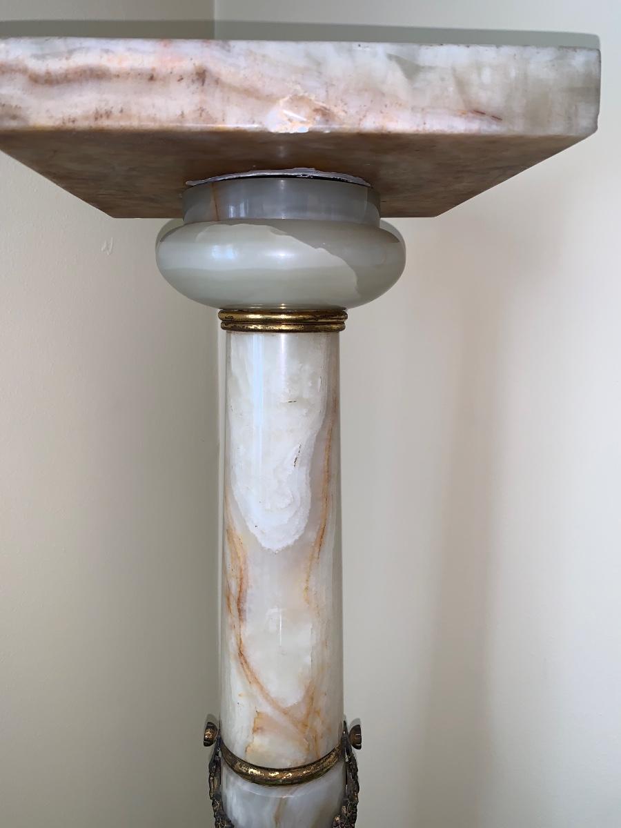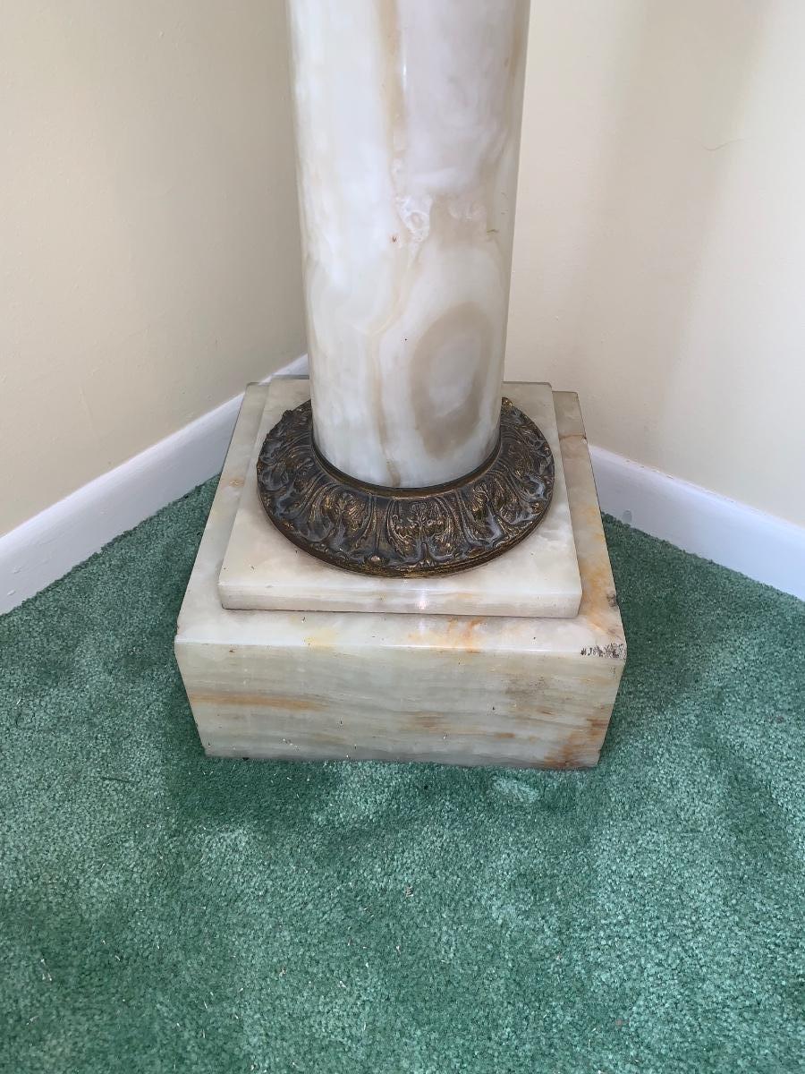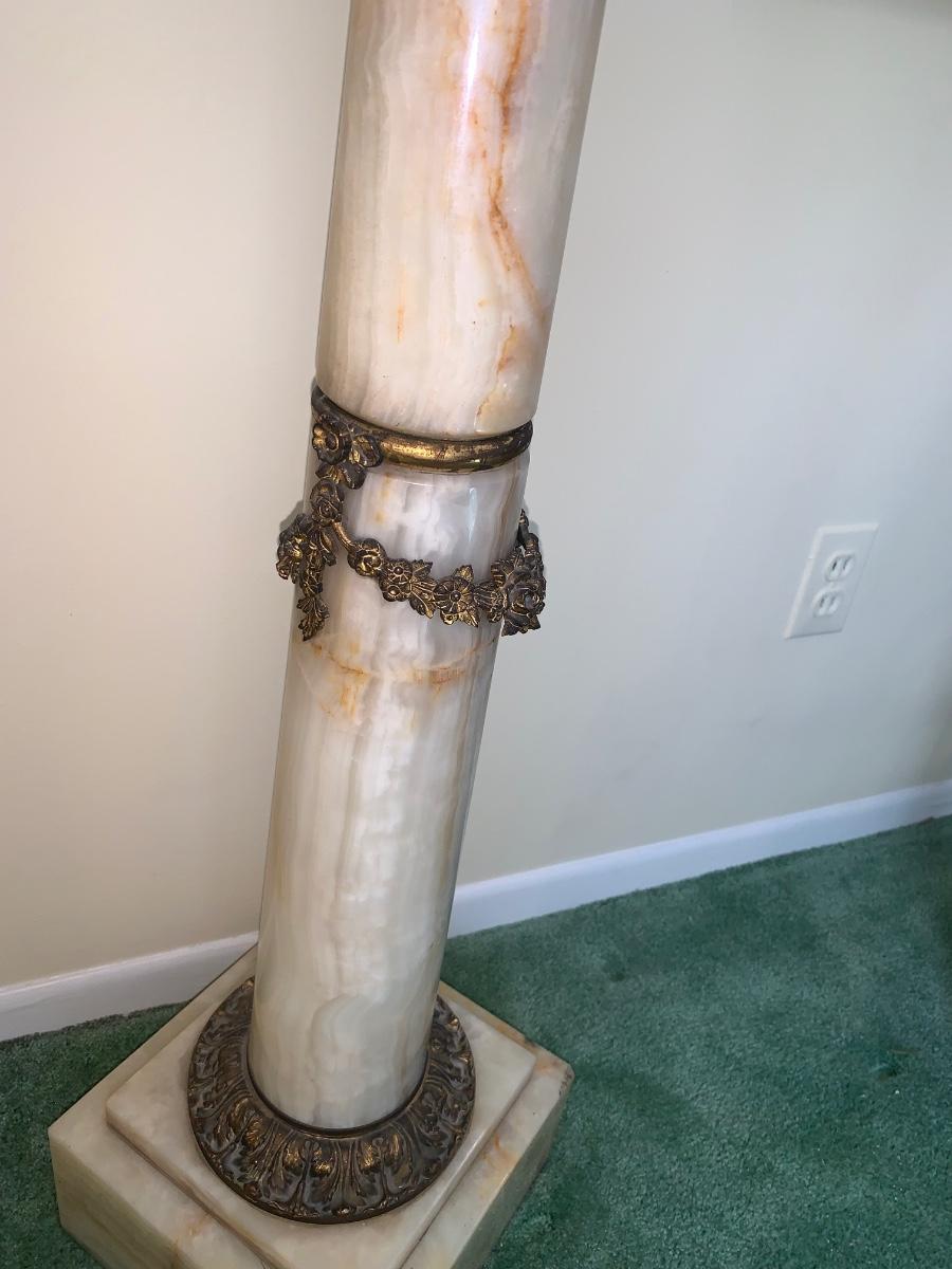 Vintage Onyx pedestal with decorative brass details. Top swivels. Very heavy! Excellent condition.