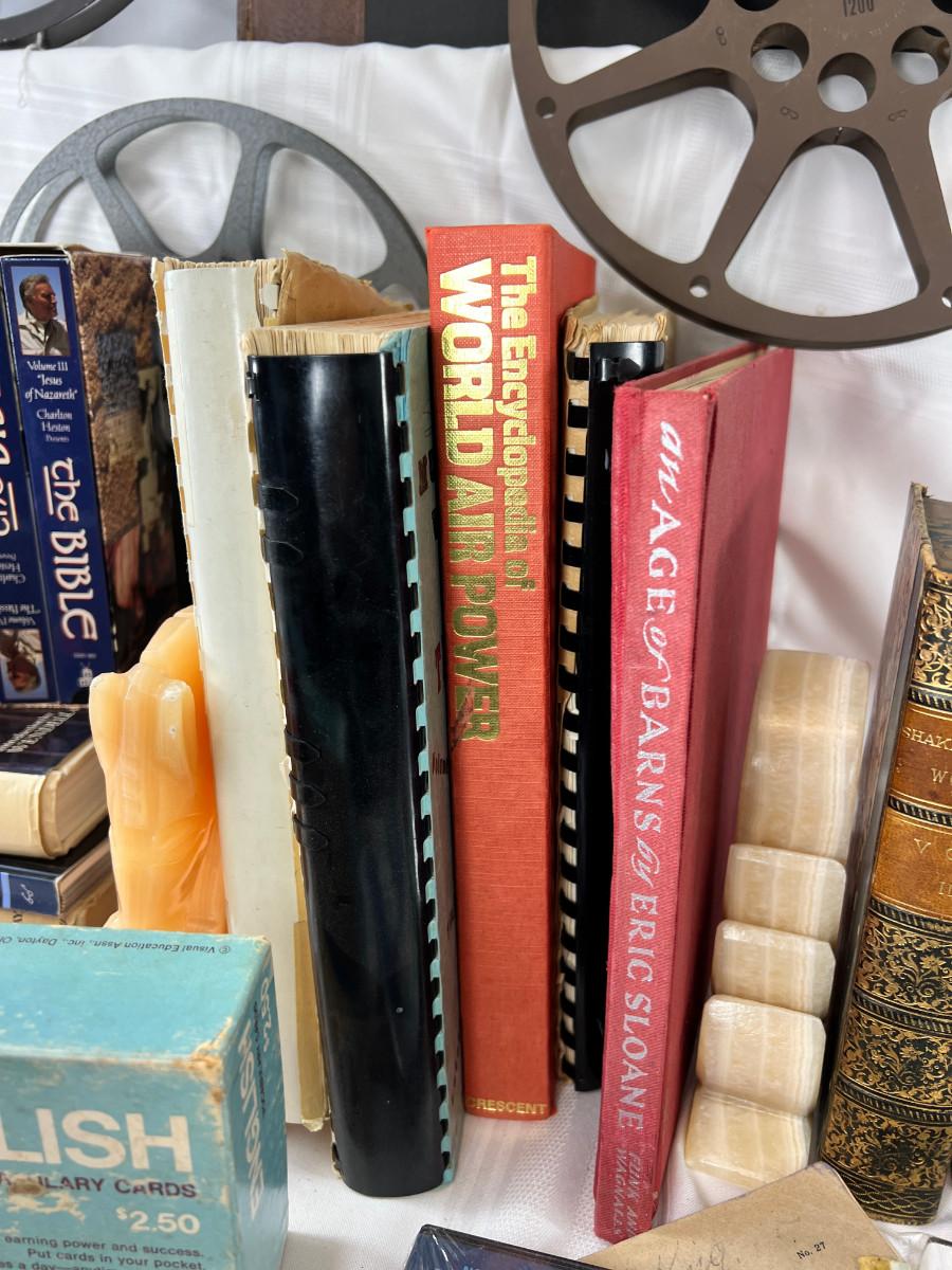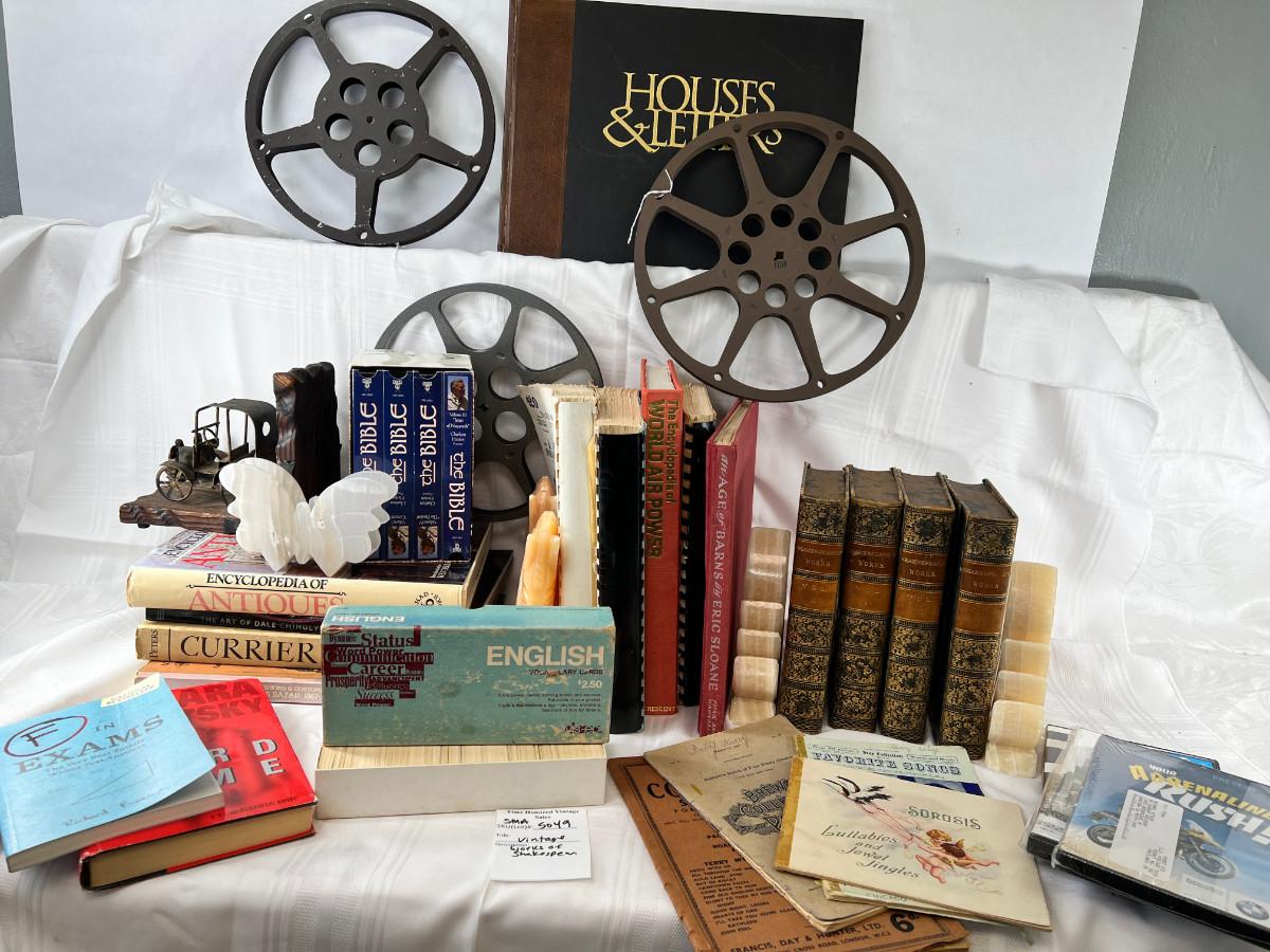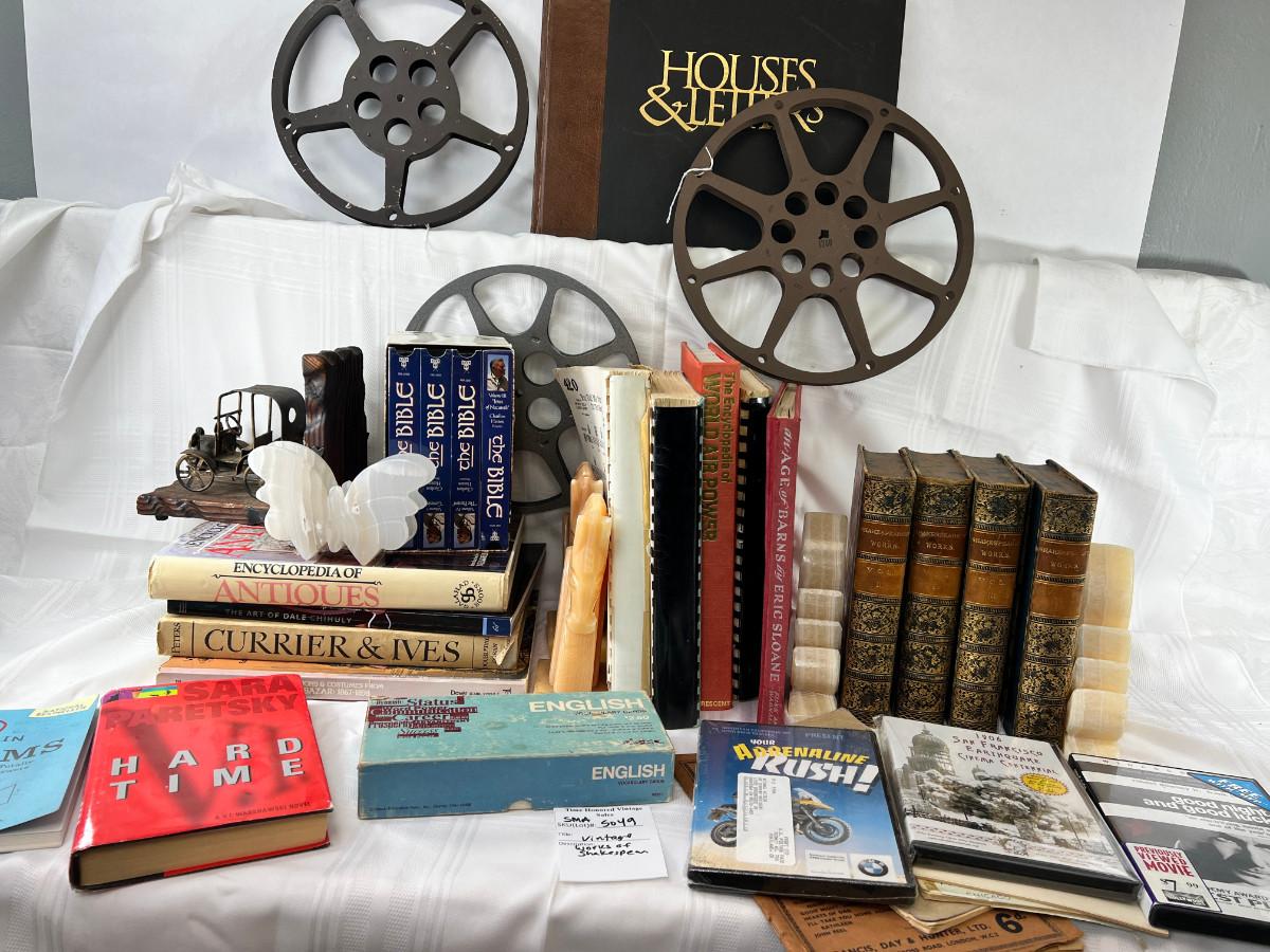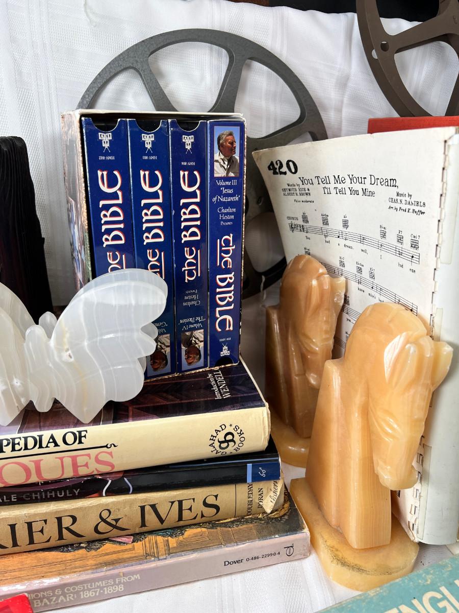 English flash cards, Movie reels, marble bookends, Bible VHS, Sheet music and music books
