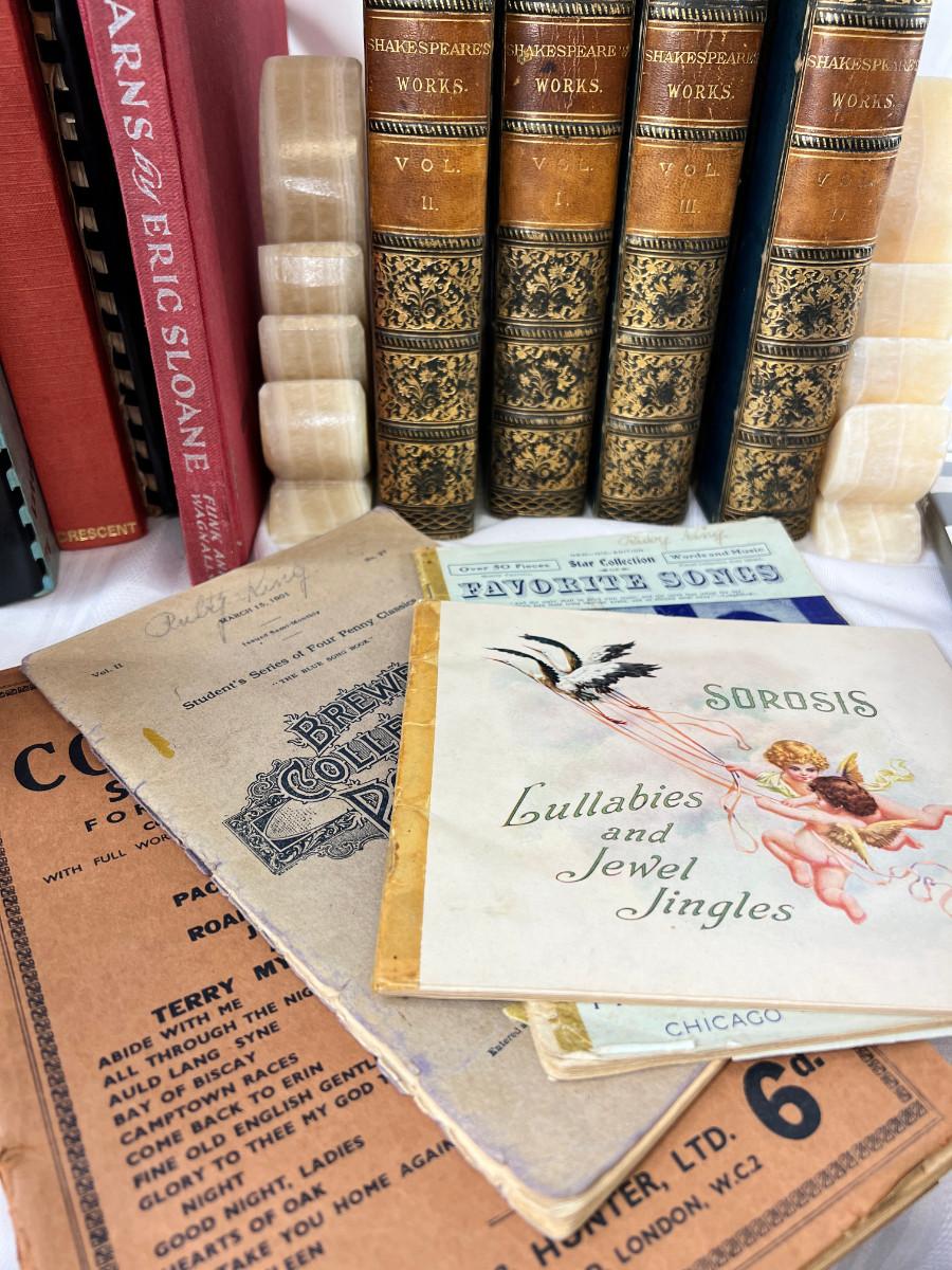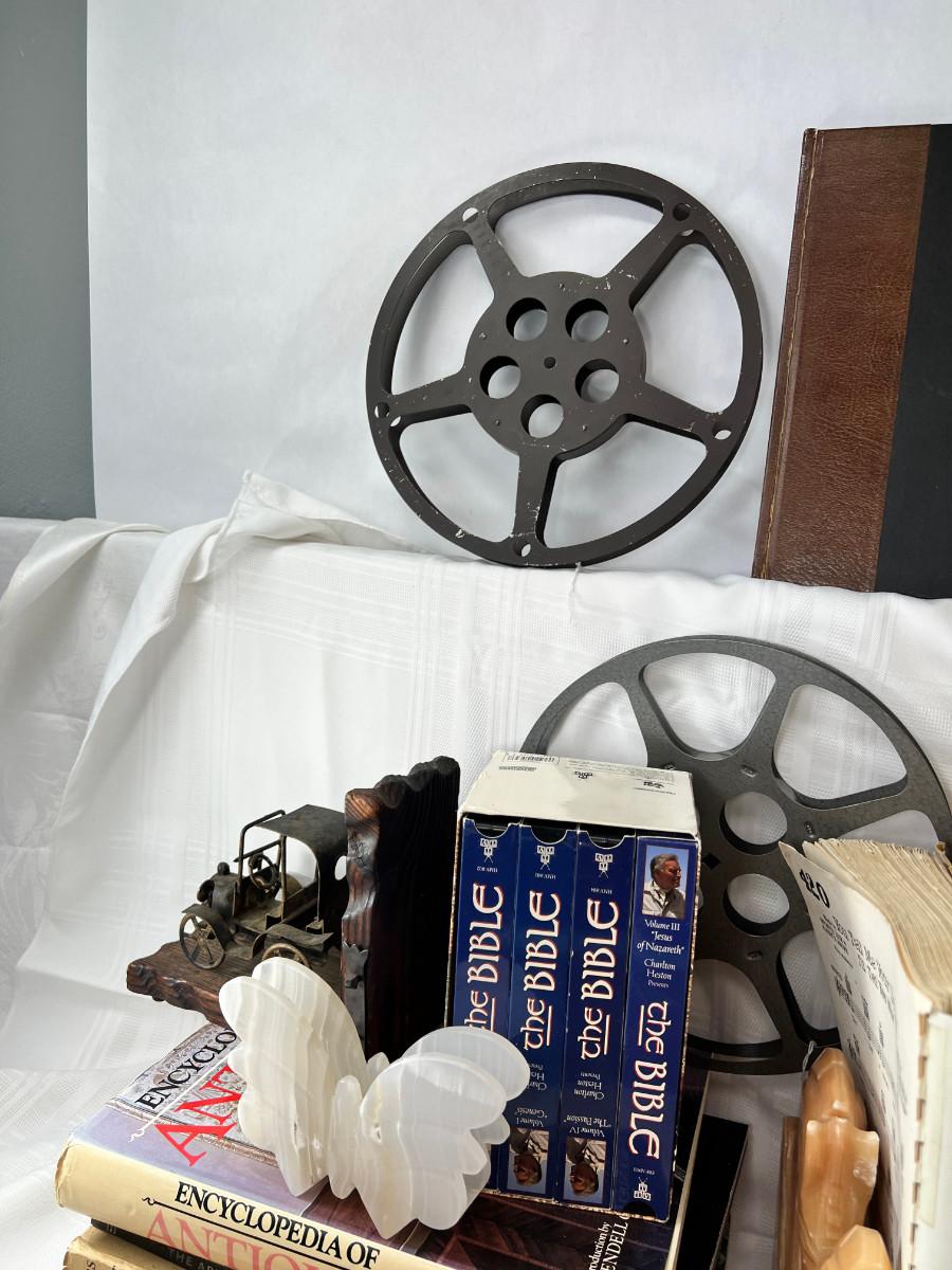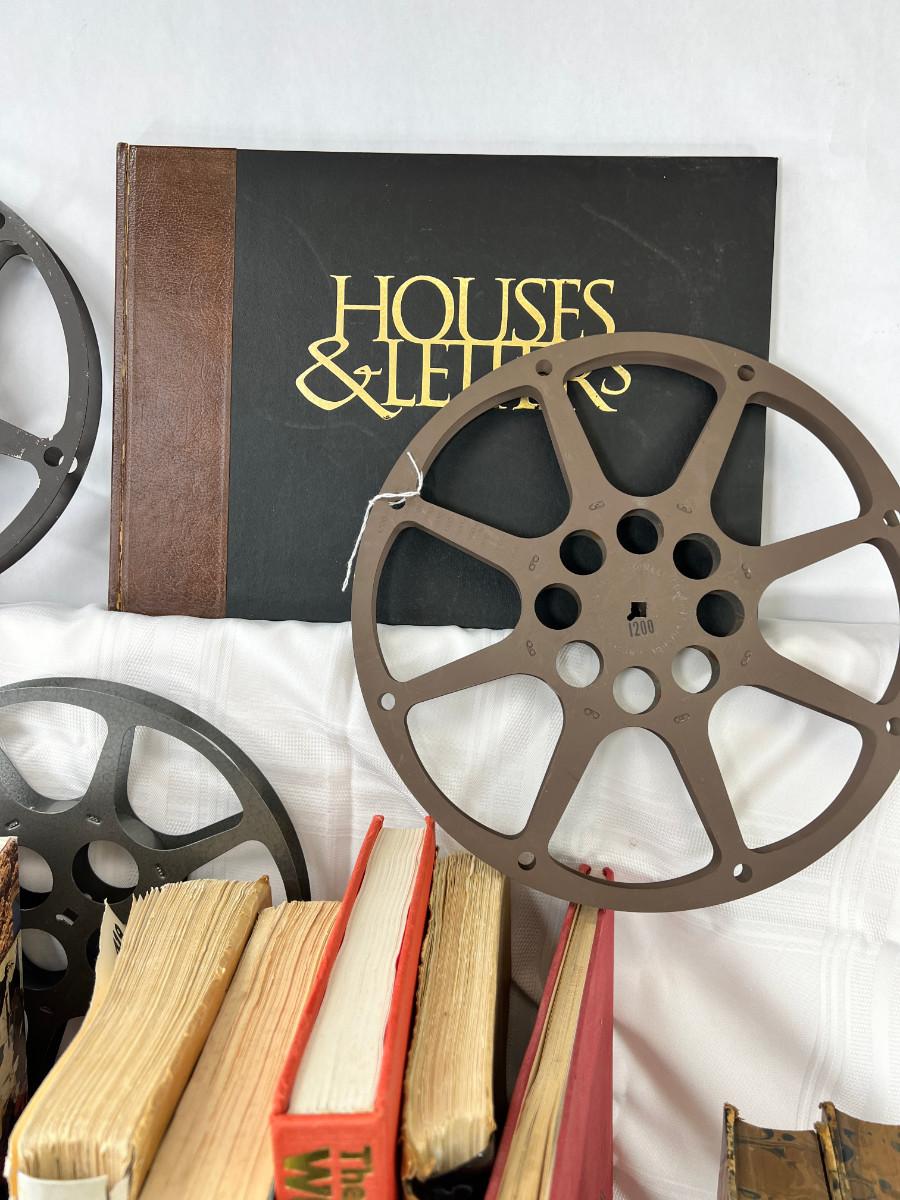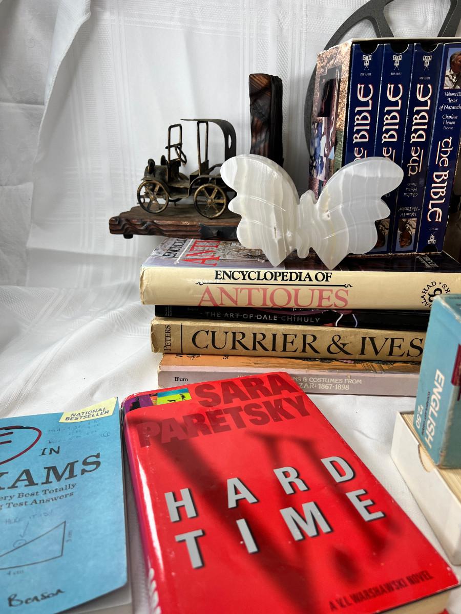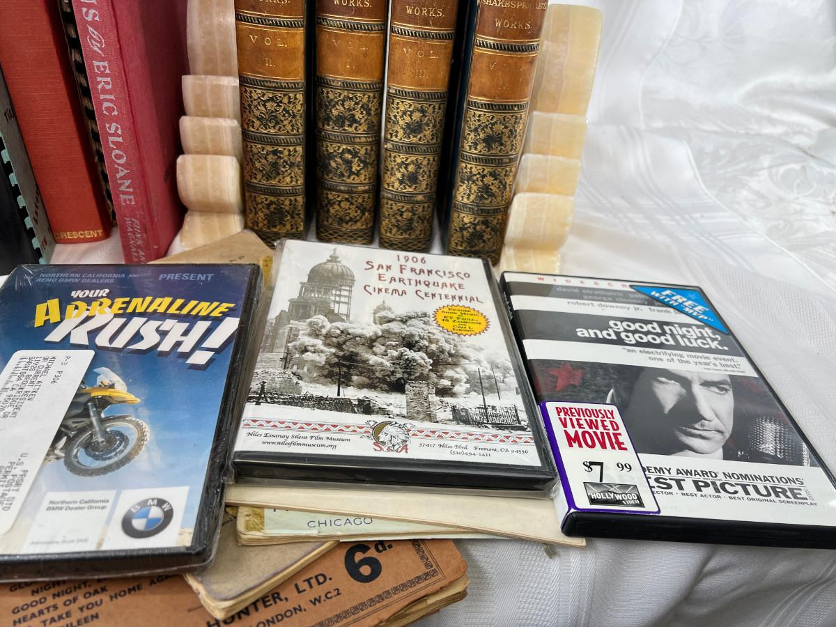 English flash cards, Movie reels, marble bookends, Bible VHS, Sheet music and music books