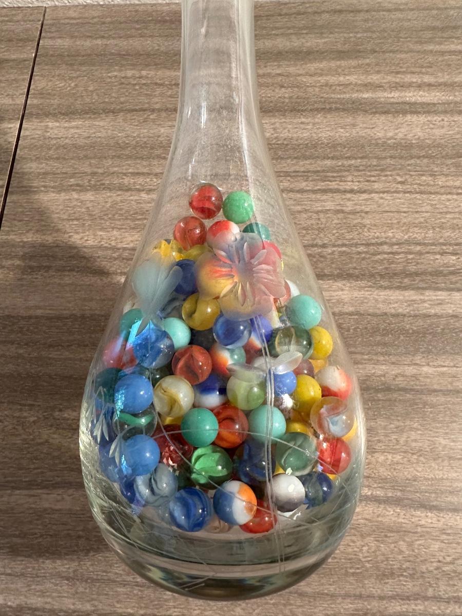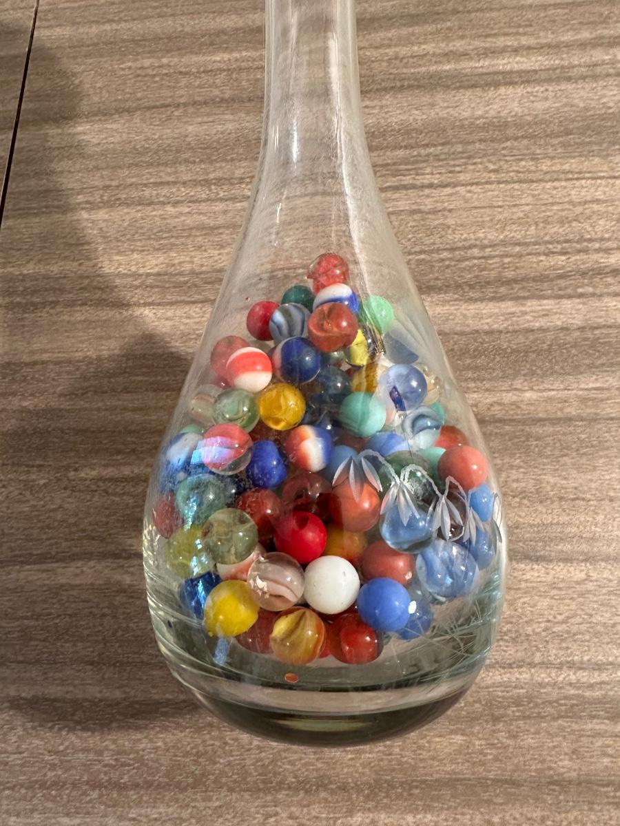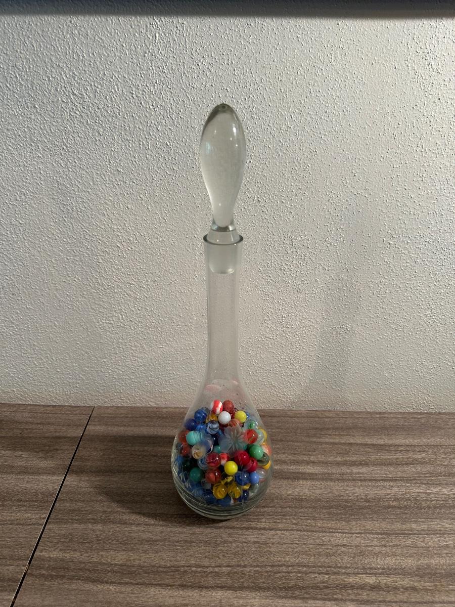 VINTAGE MARBLES IN AN ETCHED DECANTER
