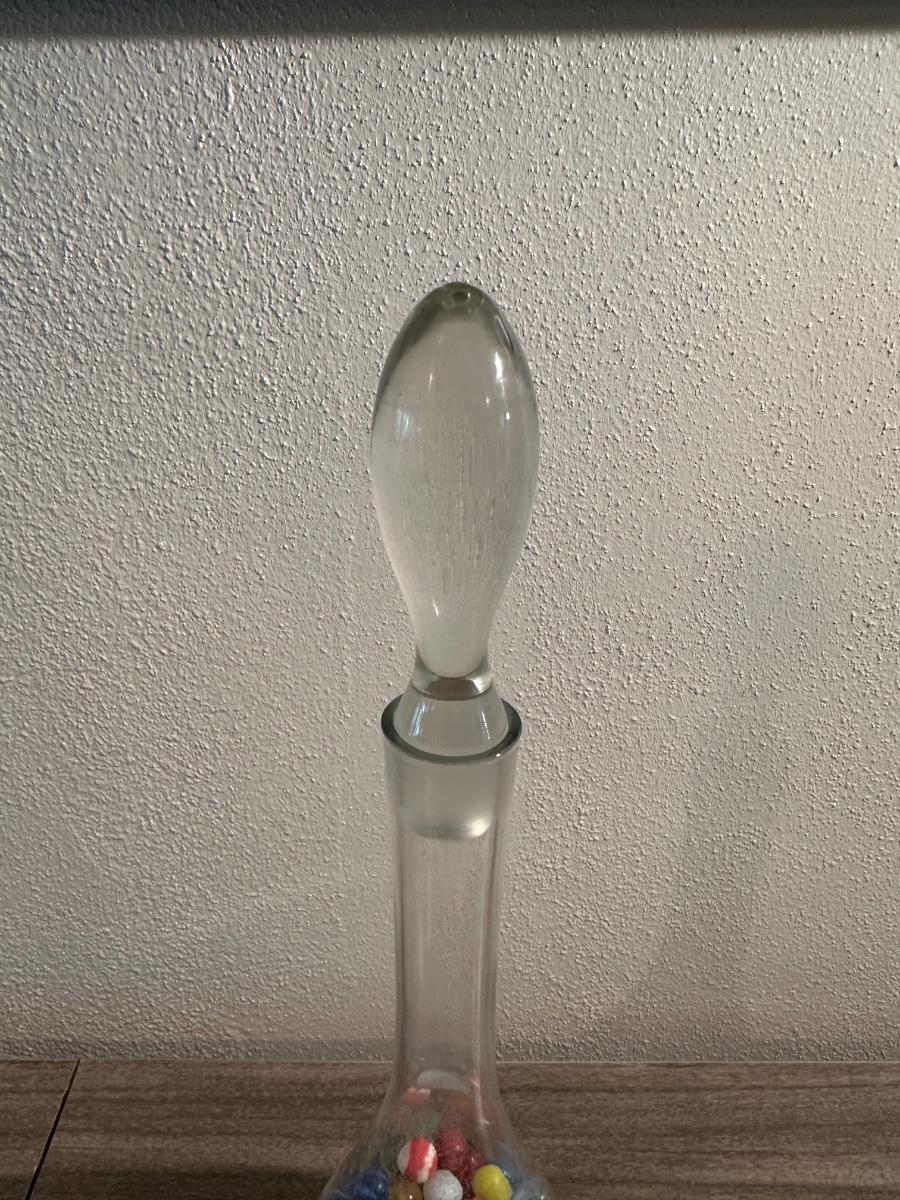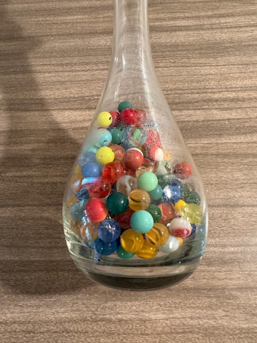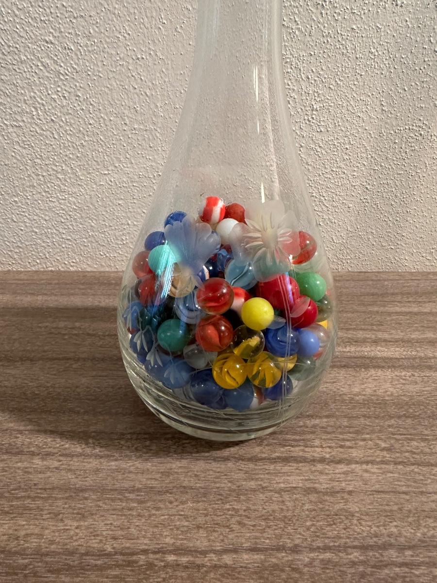 VINTAGE MARBLES IN AN ETCHED DECANTER