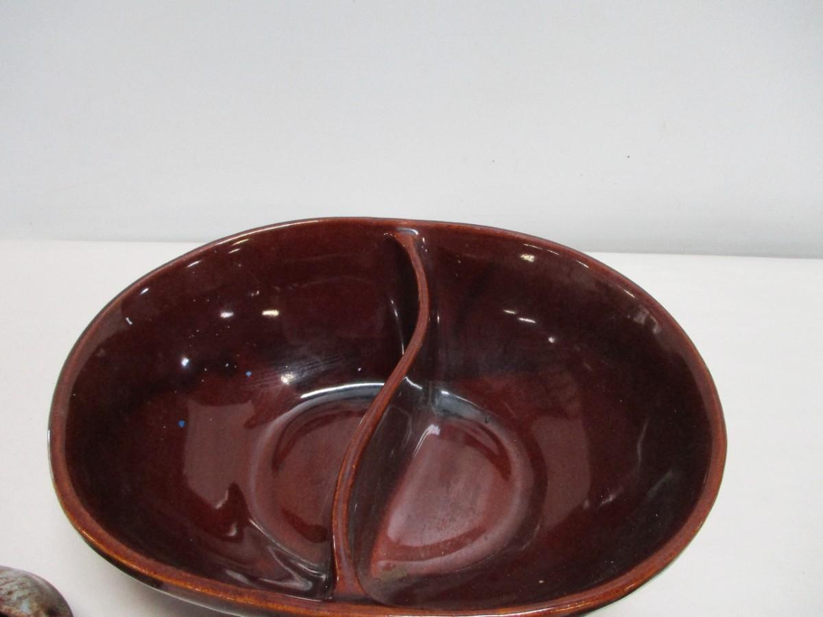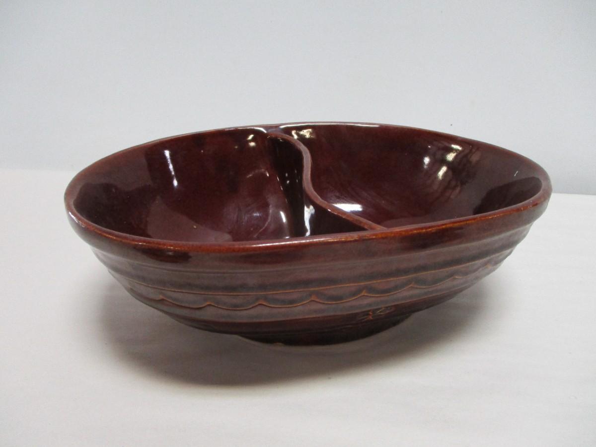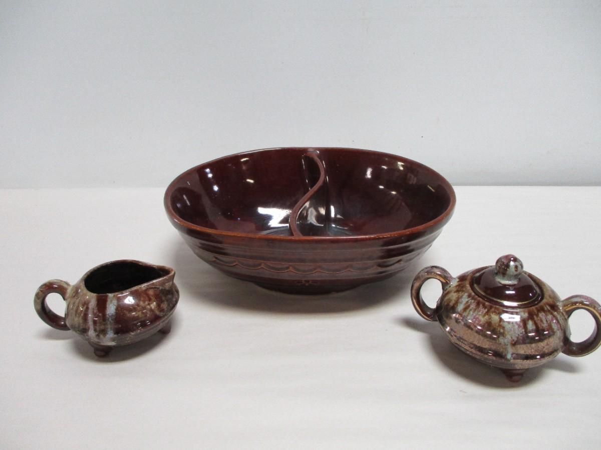 Vintage Marcrest Stoneware Daisy Dot Brown Divided Serving Dish Bowl Ovenproof & Cream & Sugar Pieces