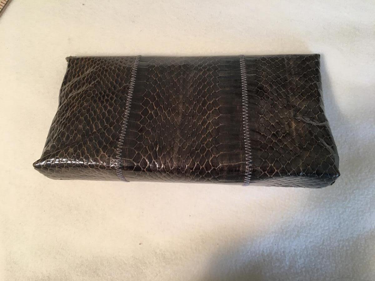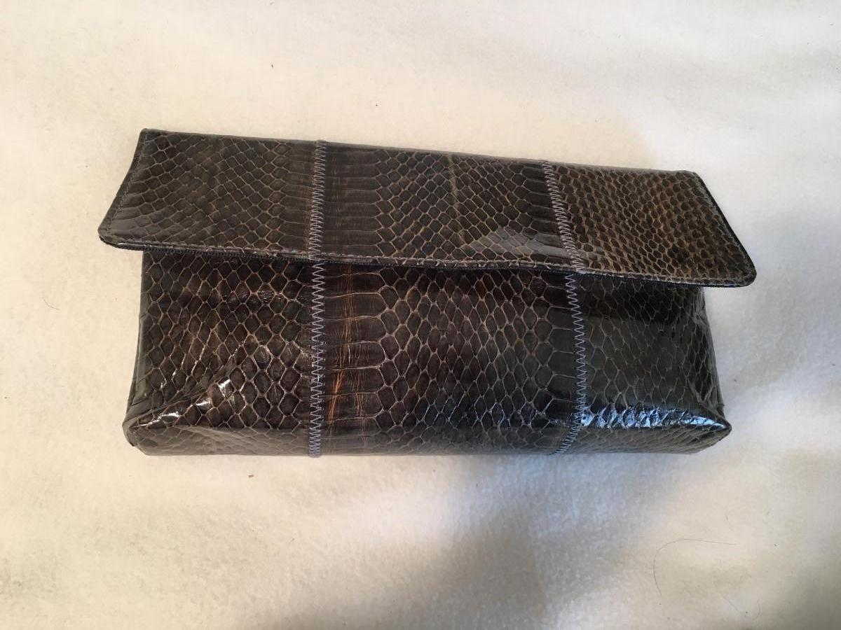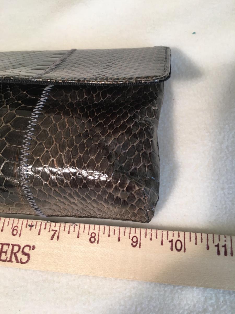 Vintage snakeskin clutch with interior zipper pocket, snap closure.