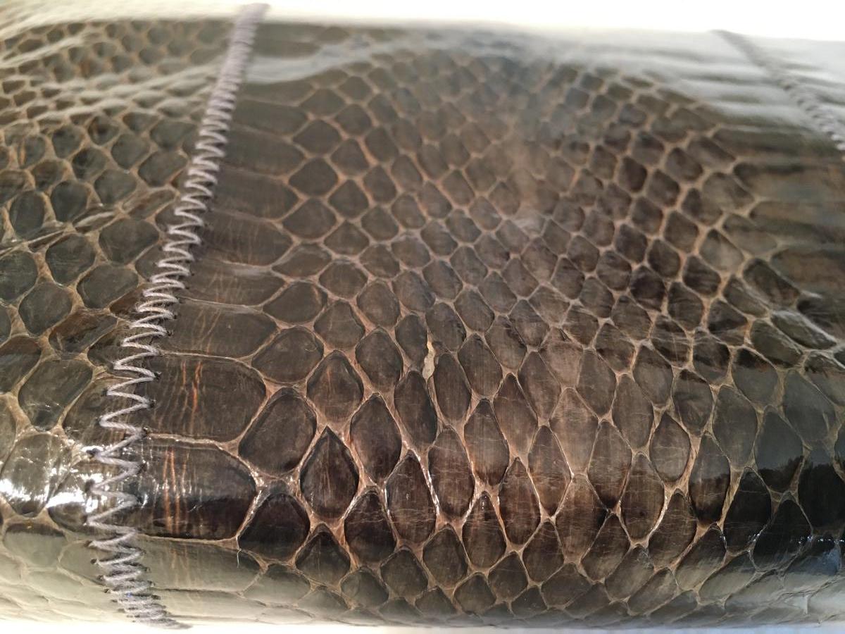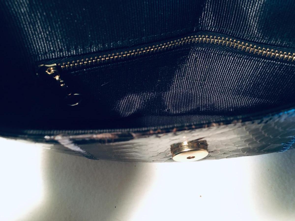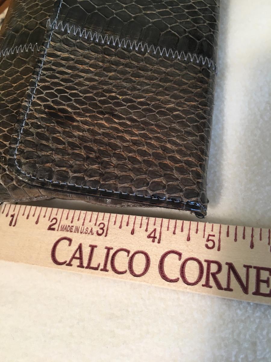 Vintage snakeskin clutch with interior zipper pocket, snap closure.