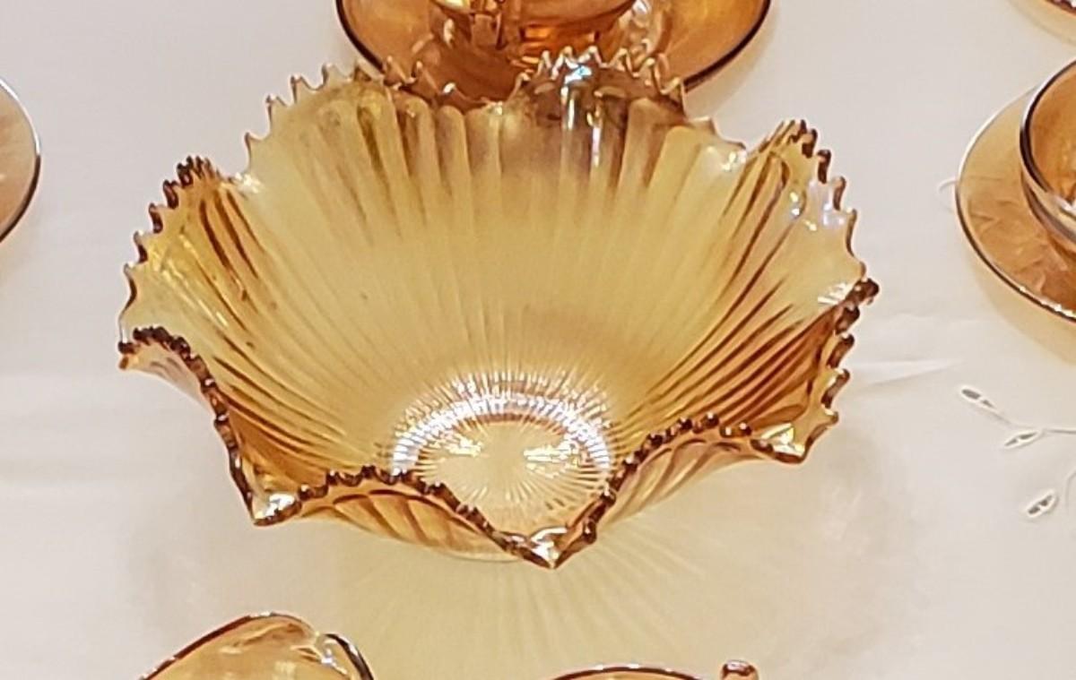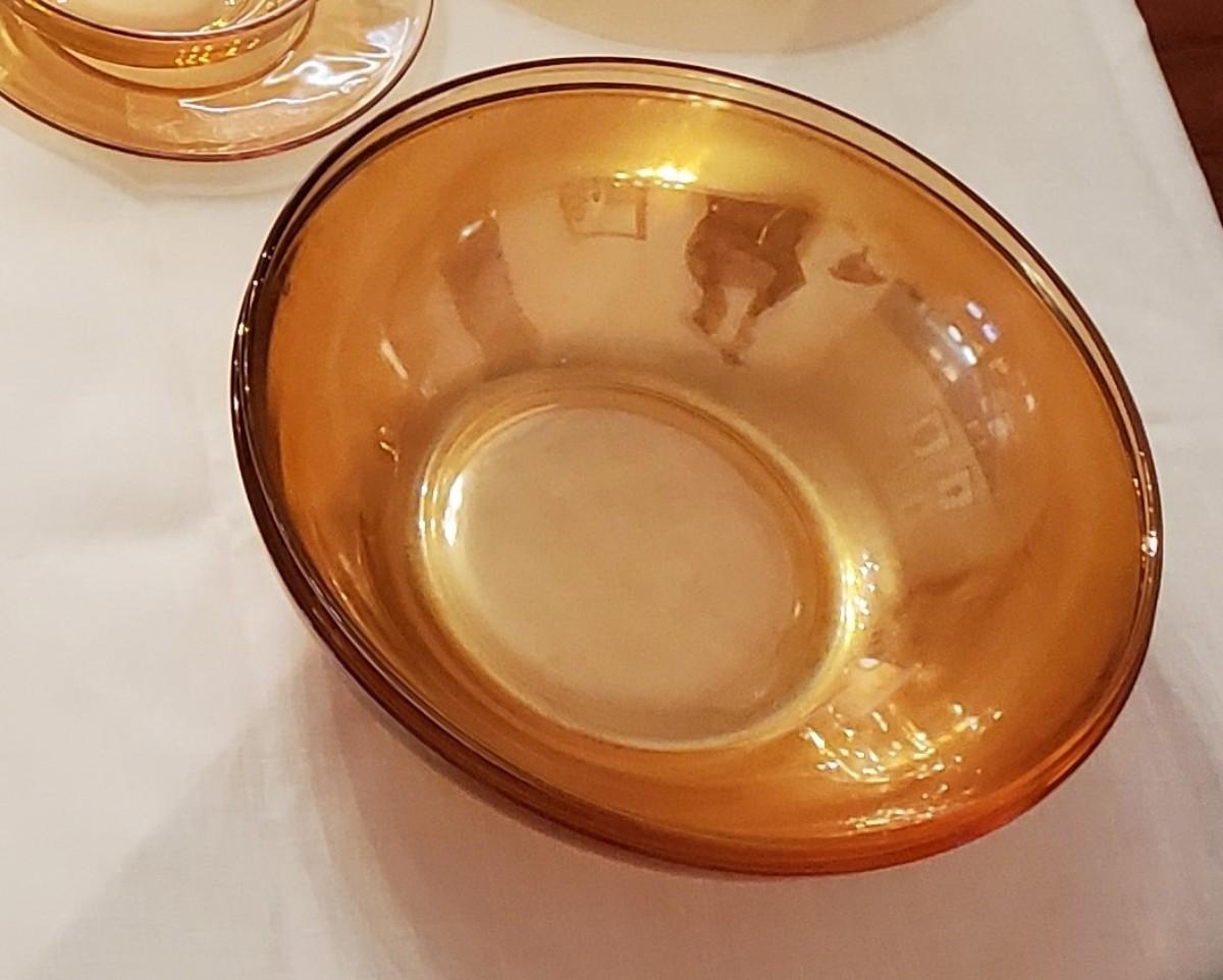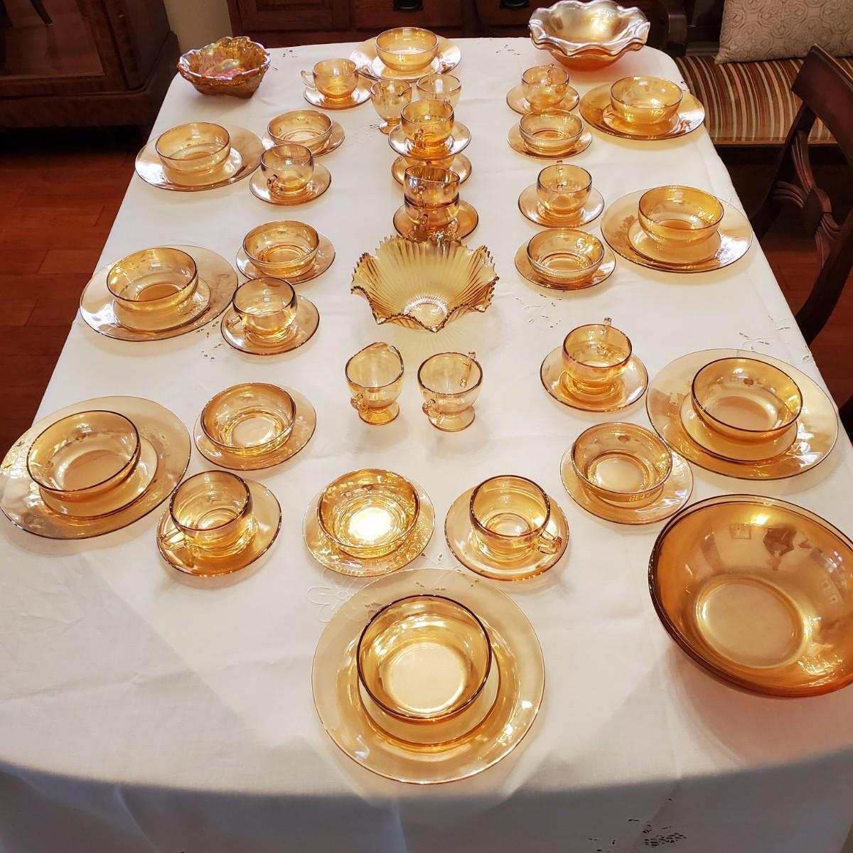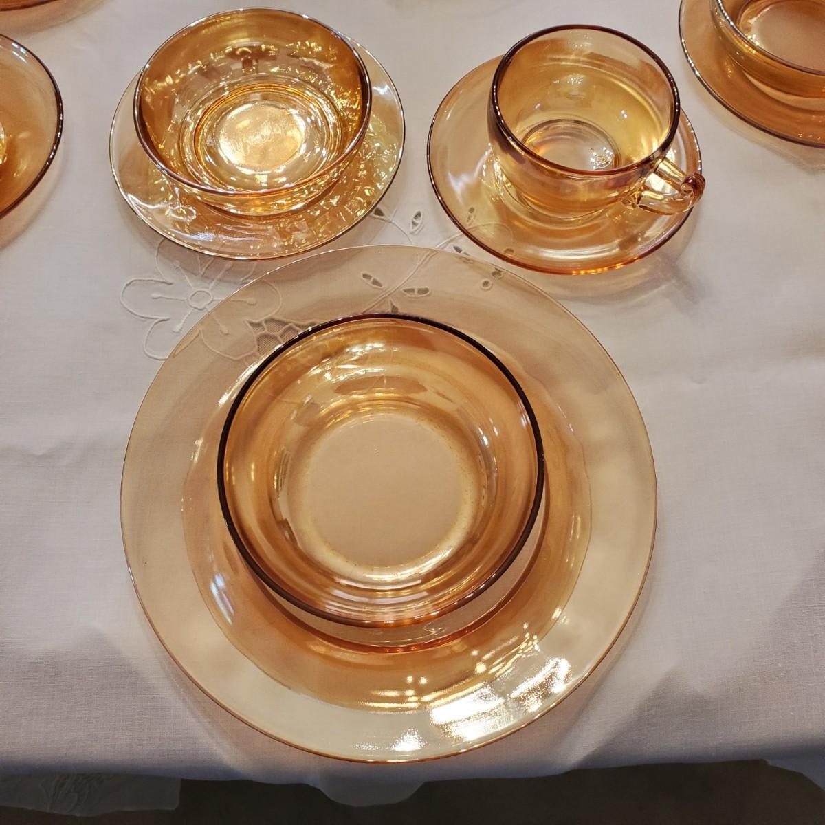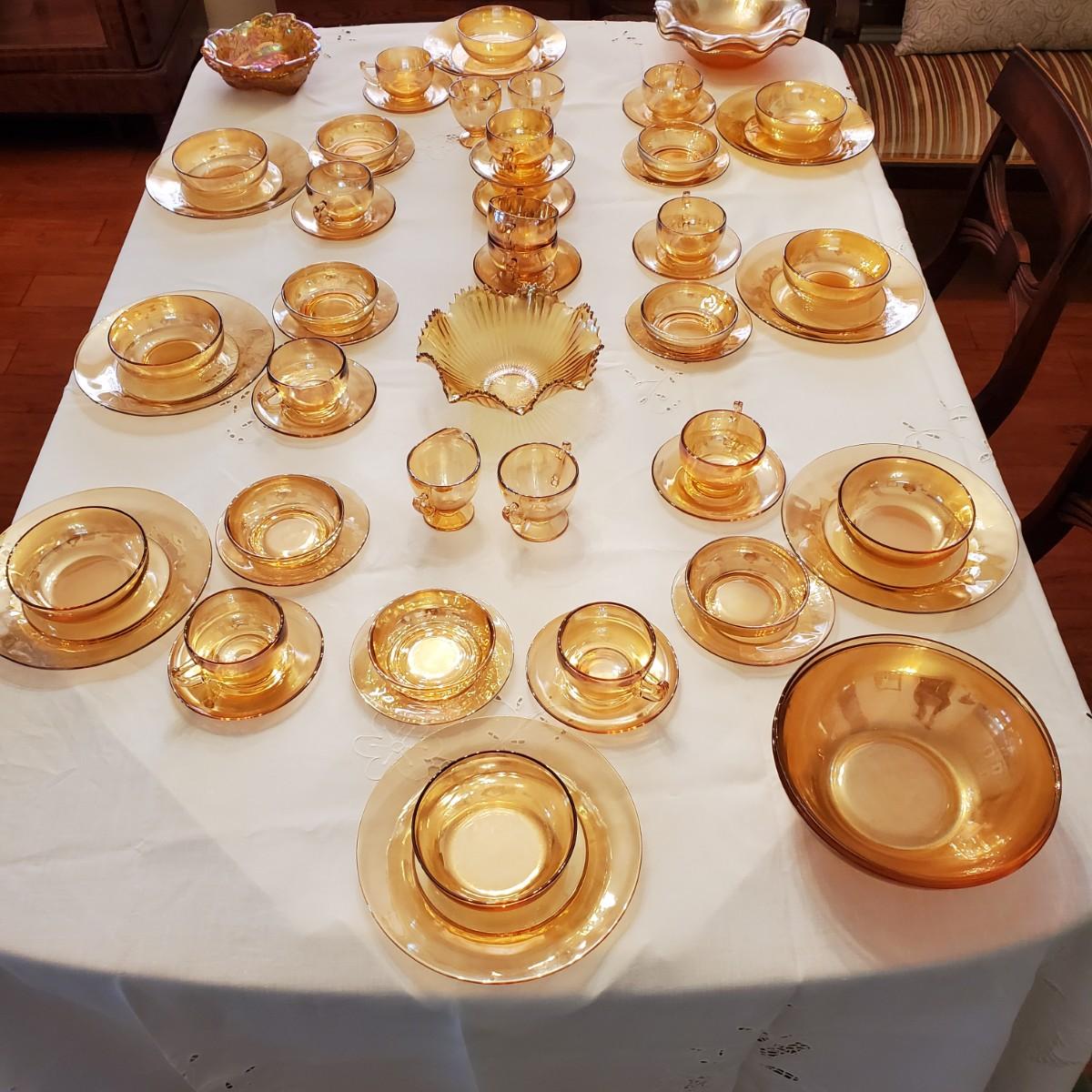 This is a very beautiful set of dishes, purchased from the original owner. It has only been hand washed, and seldom used. 8 dinner plates, 8 salad bowls, 8 cups with saucers, 7 berry bowls, 7 bread and butter plates, cream, sugar, 2-9 inch serve bowls, 2- amber glass berry and leaves small bowls, and 1 - 9 inch ruffled herringbone bowl. Local pickup only.