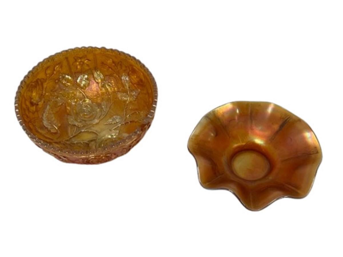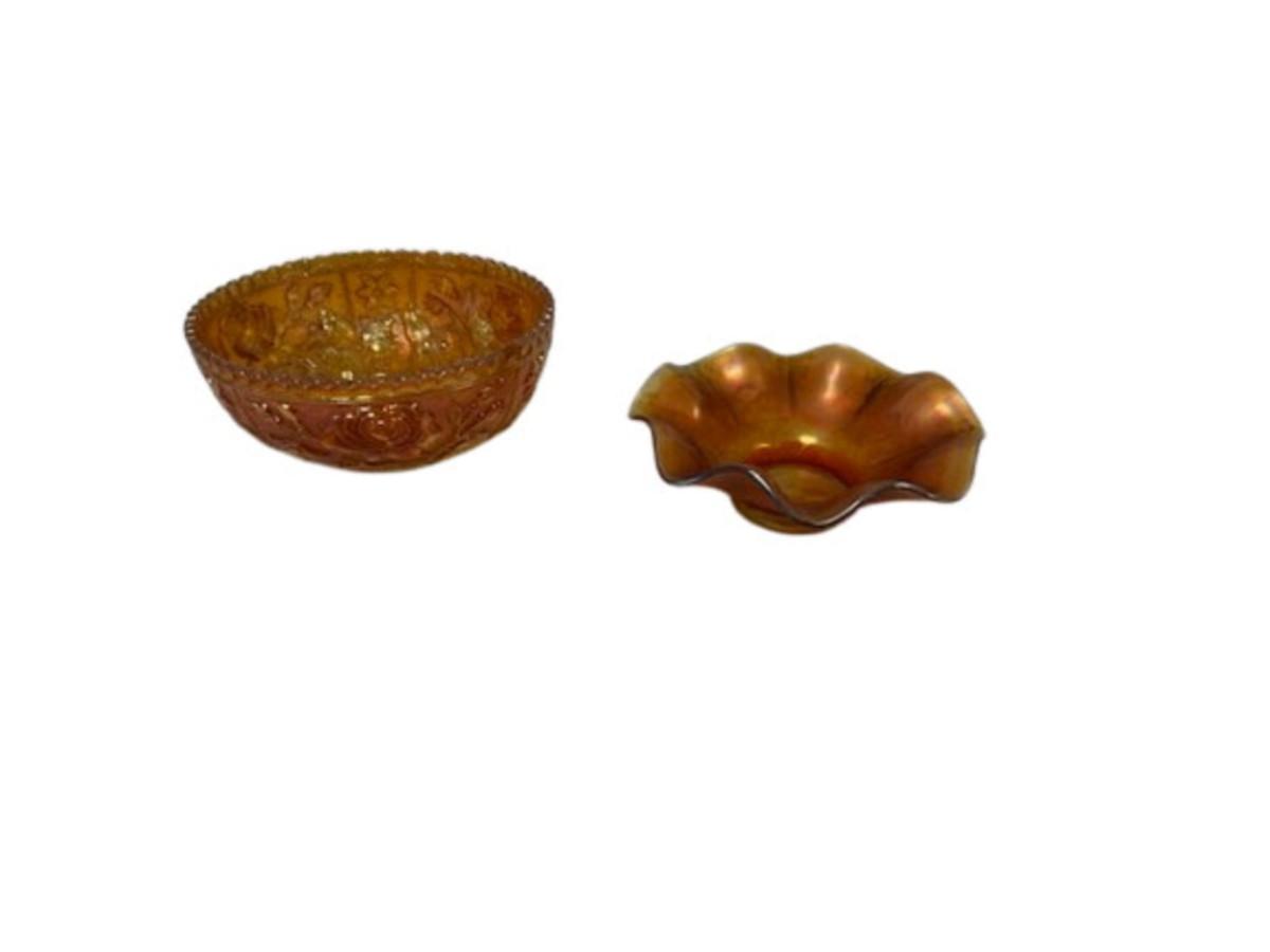 Includes an Imperial Glass rose bowl (has some chips on the rim), and a ruffled bowl. Total of 2 pieces. Measurement of largest: 7.5" Diameter. [CC]