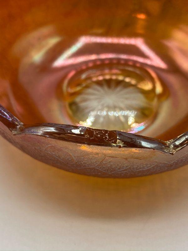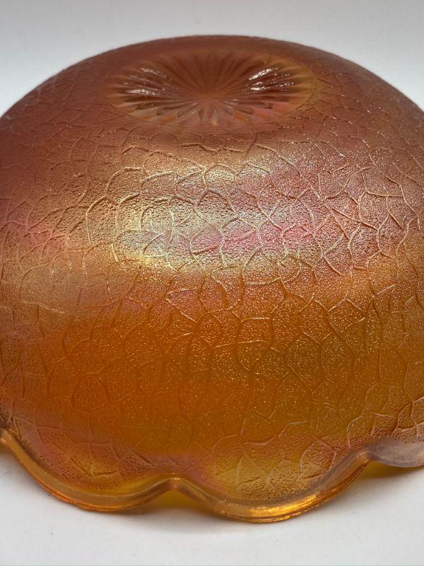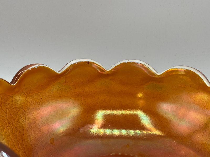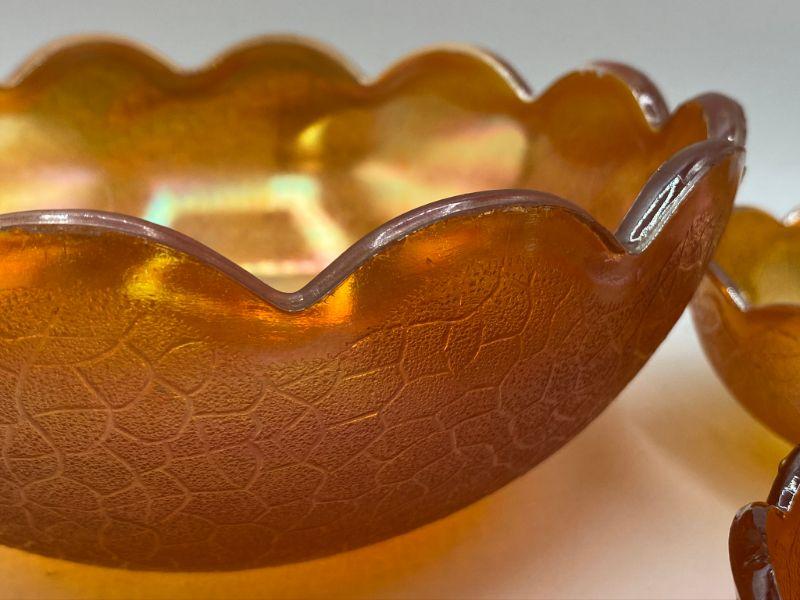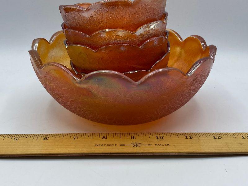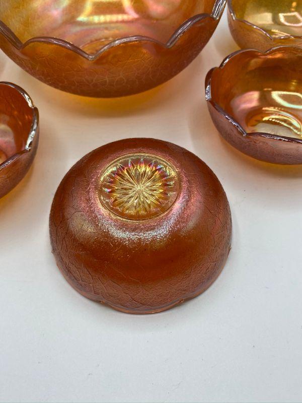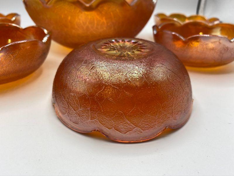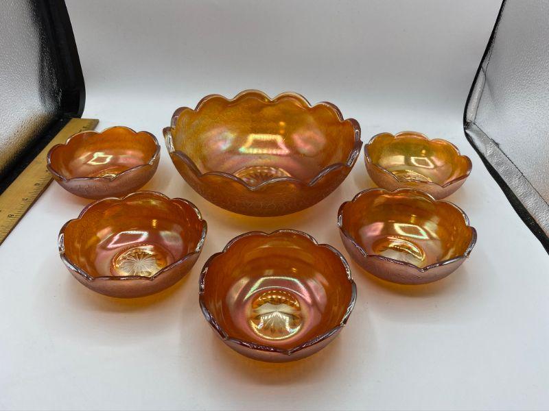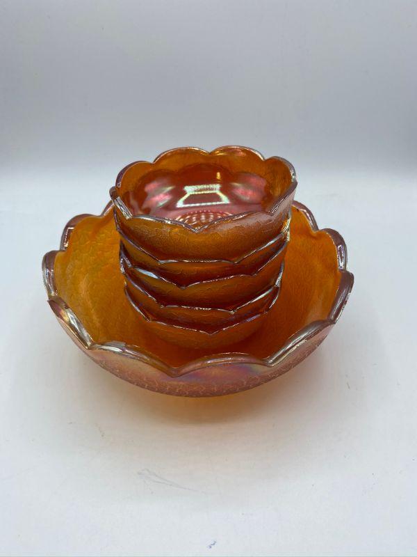 Vintage fruit bowl set. Dark marigold carnival glass from Jeanette Glass. Comes with master bowl and 5 individual bowls. Good Condition.