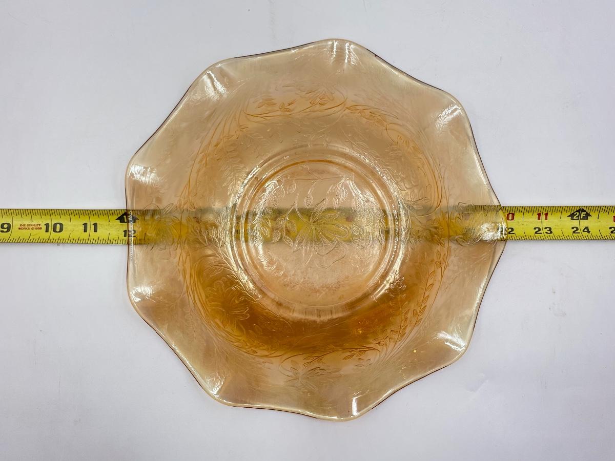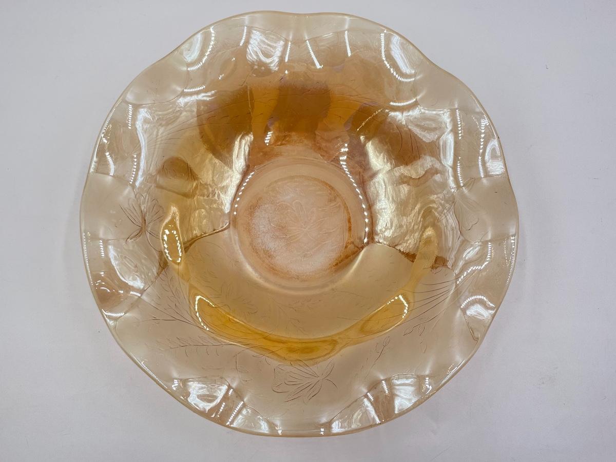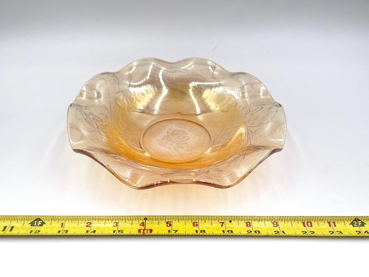 VINTAGE 10" MARIGOLD/AMBER IRIDESCENT CARNIVAL GLASS RUFFLED EDGE BOWL