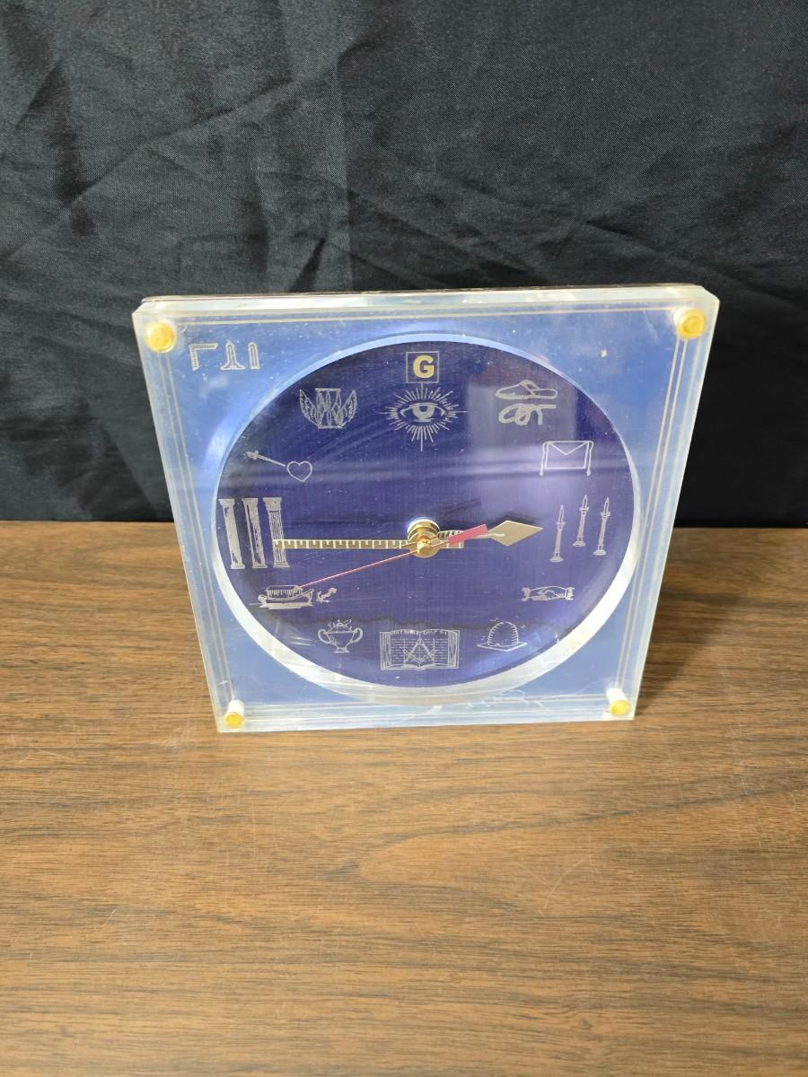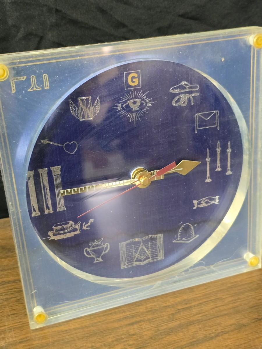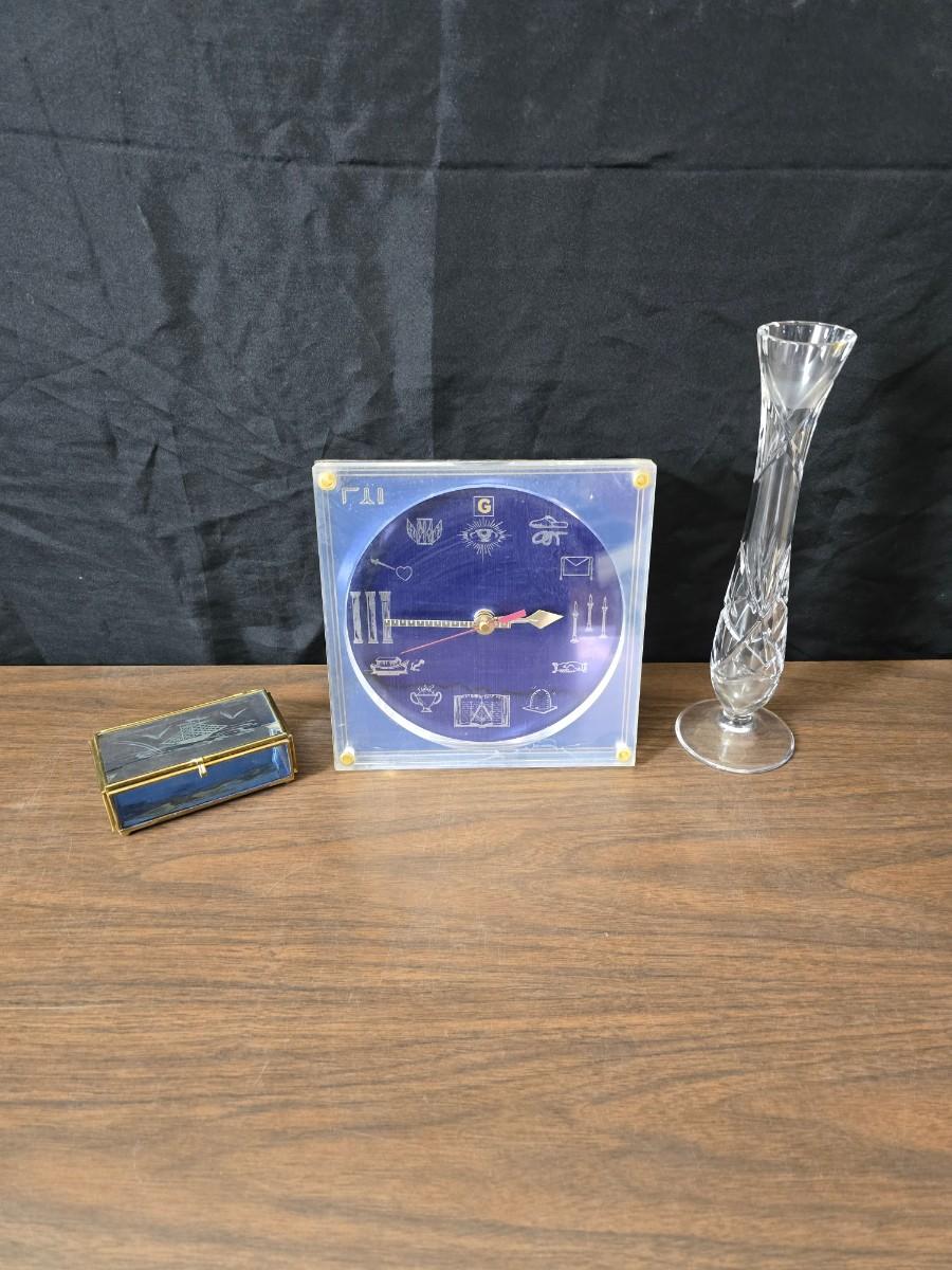 Vintage Marion Kay Masonic Desk Clock, Model No. 30 Blue Lodge with etched trinket box and a vase
