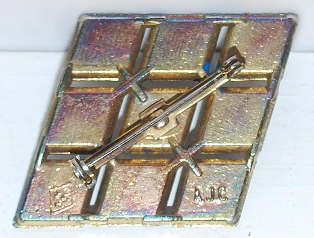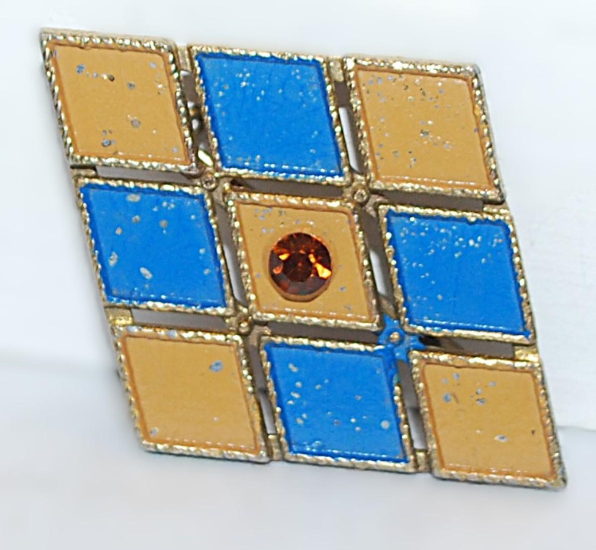 VINTAGE Marked "AJC" BLUE & BEIGE 9 SQUARE BROOCH (2¼" x 1¾") with Amber Colored Center Stone on a Gold Tone Setting