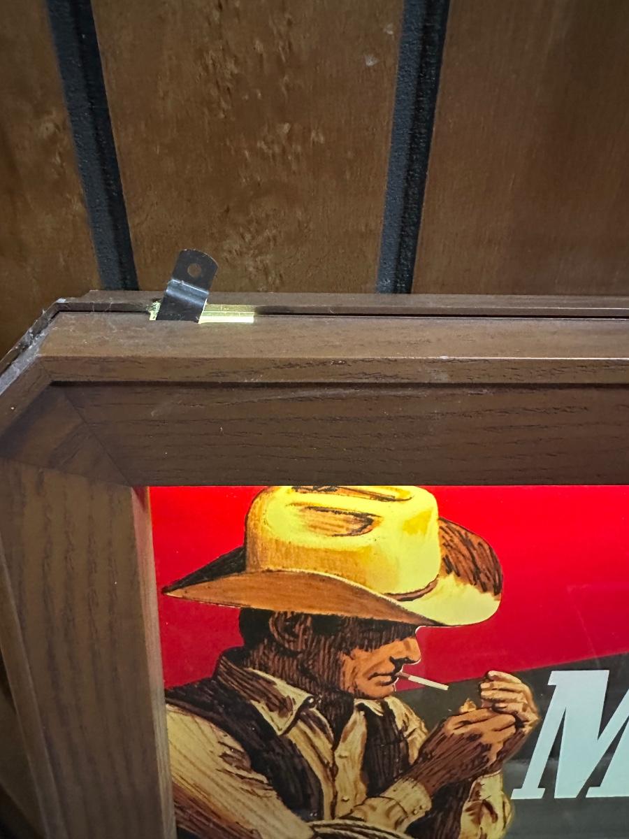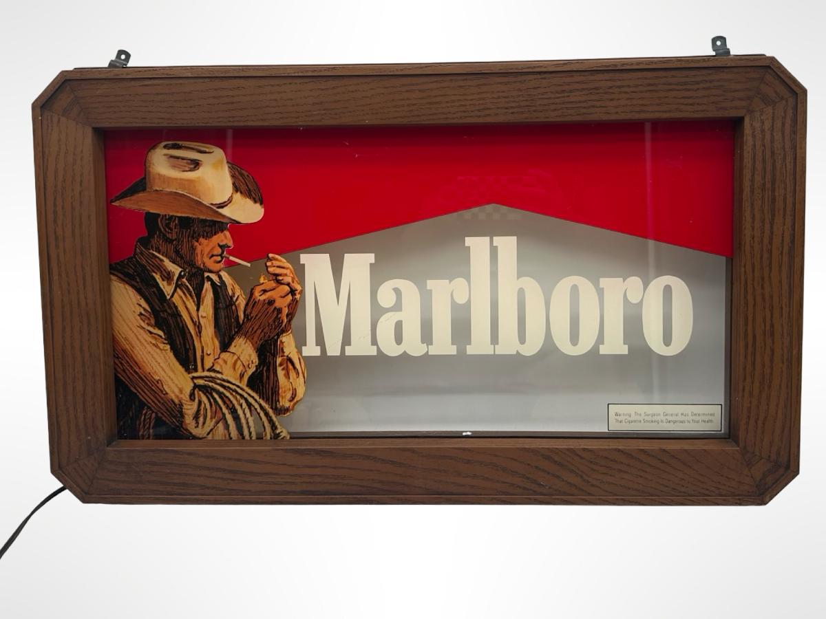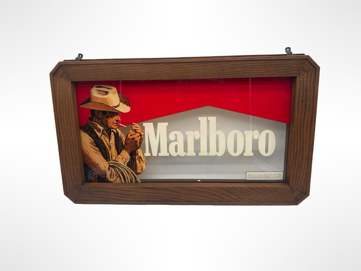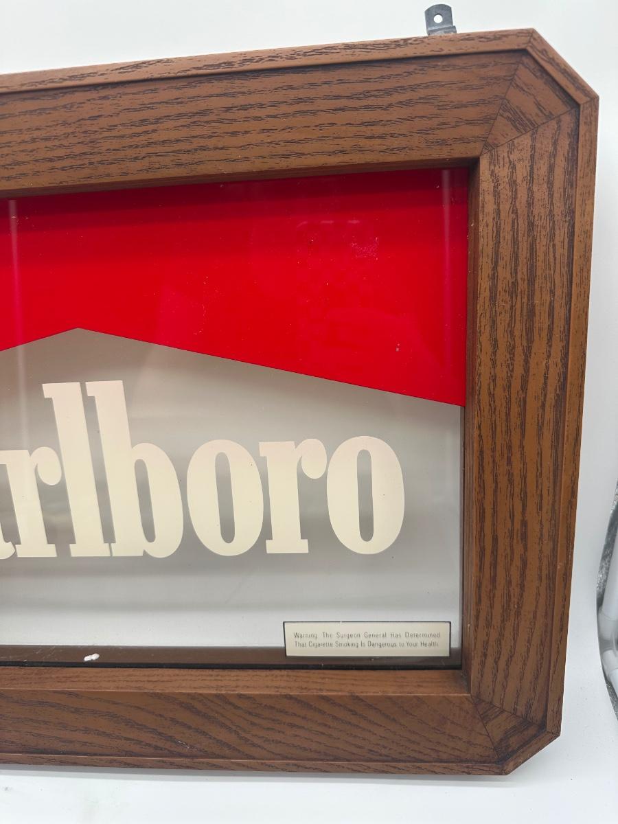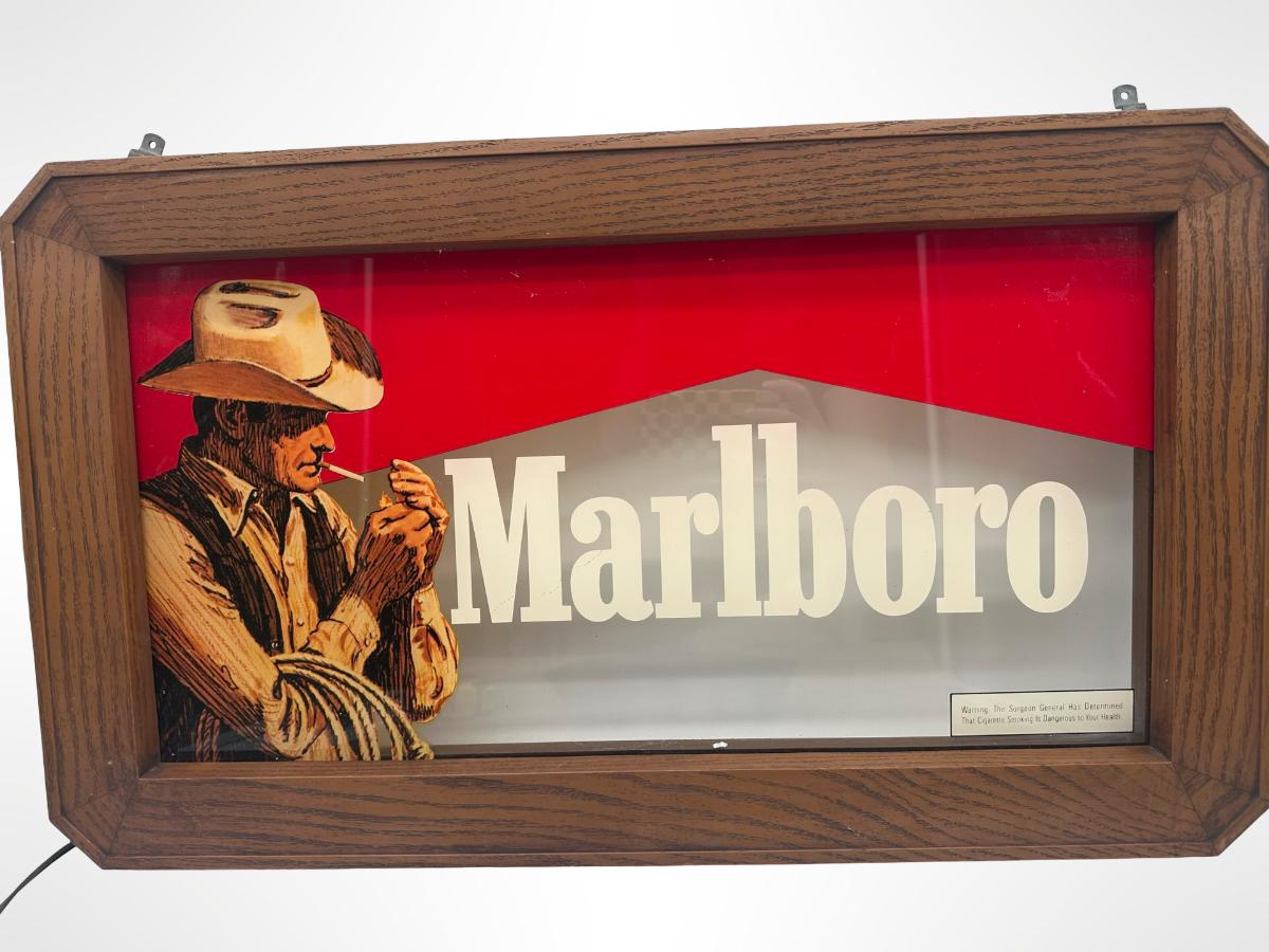 Vintage Marlboro lighted wall advertising sign featuring classic cowboy graphic and Surgeon General warning panel. Faux-wood framed housing with glass front panel. Measures approx. 26” wide x 15.5” tall. Includes power cord with inline switch. Lights up as shown.