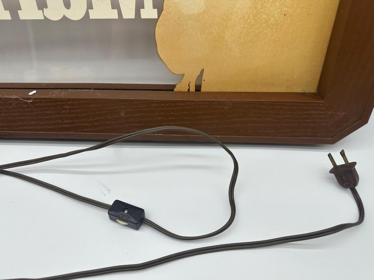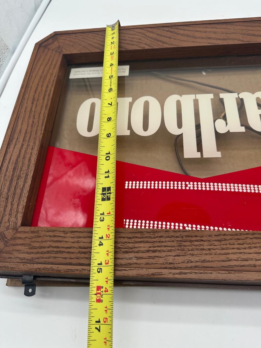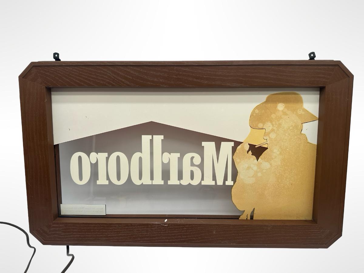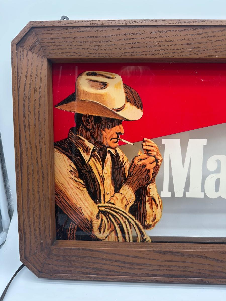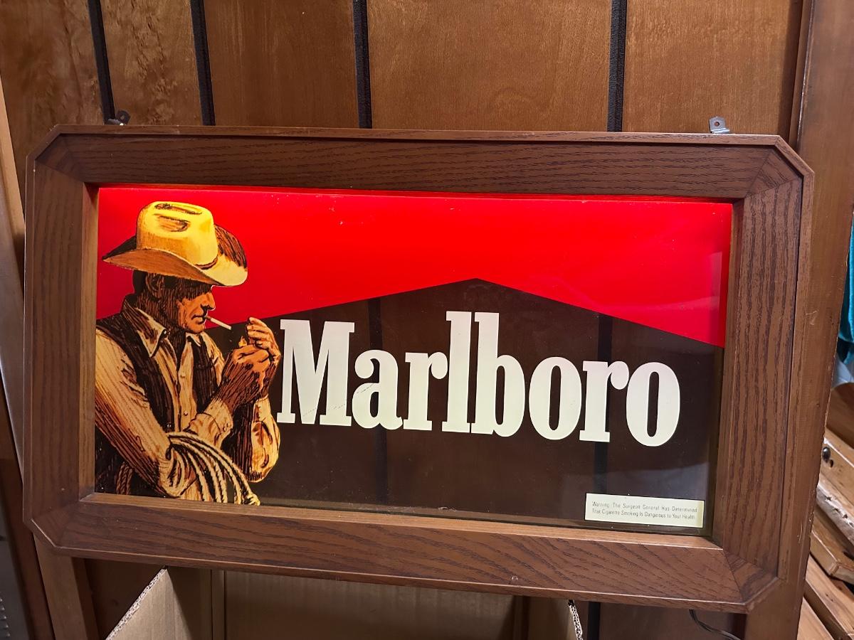 Vintage Marlboro lighted wall advertising sign featuring classic cowboy graphic and Surgeon General warning panel. Faux-wood framed housing with glass front panel. Measures approx. 26” wide x 15.5” tall. Includes power cord with inline switch. Lights up as shown.