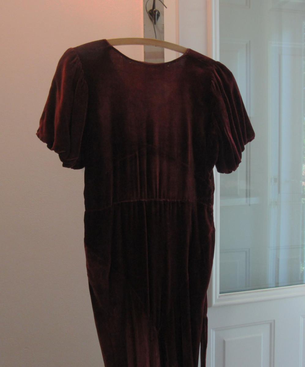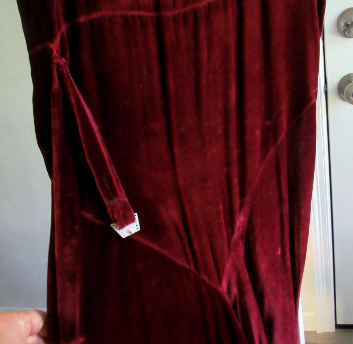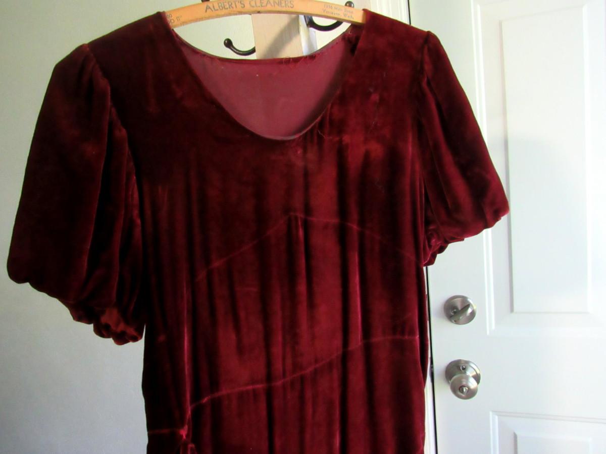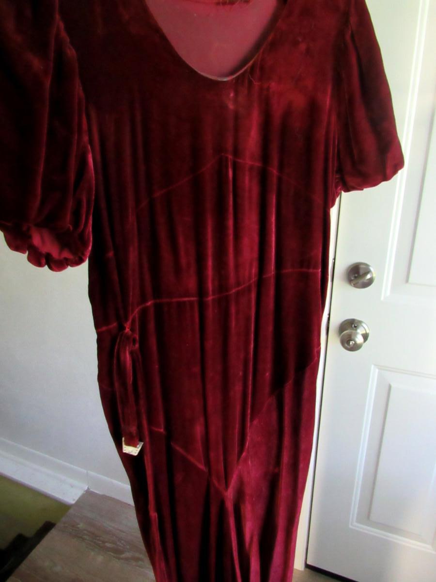 Note: I have checked this dress again for a customer and noticed a little more wear than I saw originally. There is wear to the velvet in spots and at the neckline. Not sure if something was attached to it in the past, or not. Just be aware there is a little more wear in the fabric that I first noticed. Stitching coming loose at neck back, minor fraying at back neck. No makers labels, unknown size. Partially machine and hand sewn. Shipping available at shipping cost plus $5.00 per box handling fee. See our terms for details.