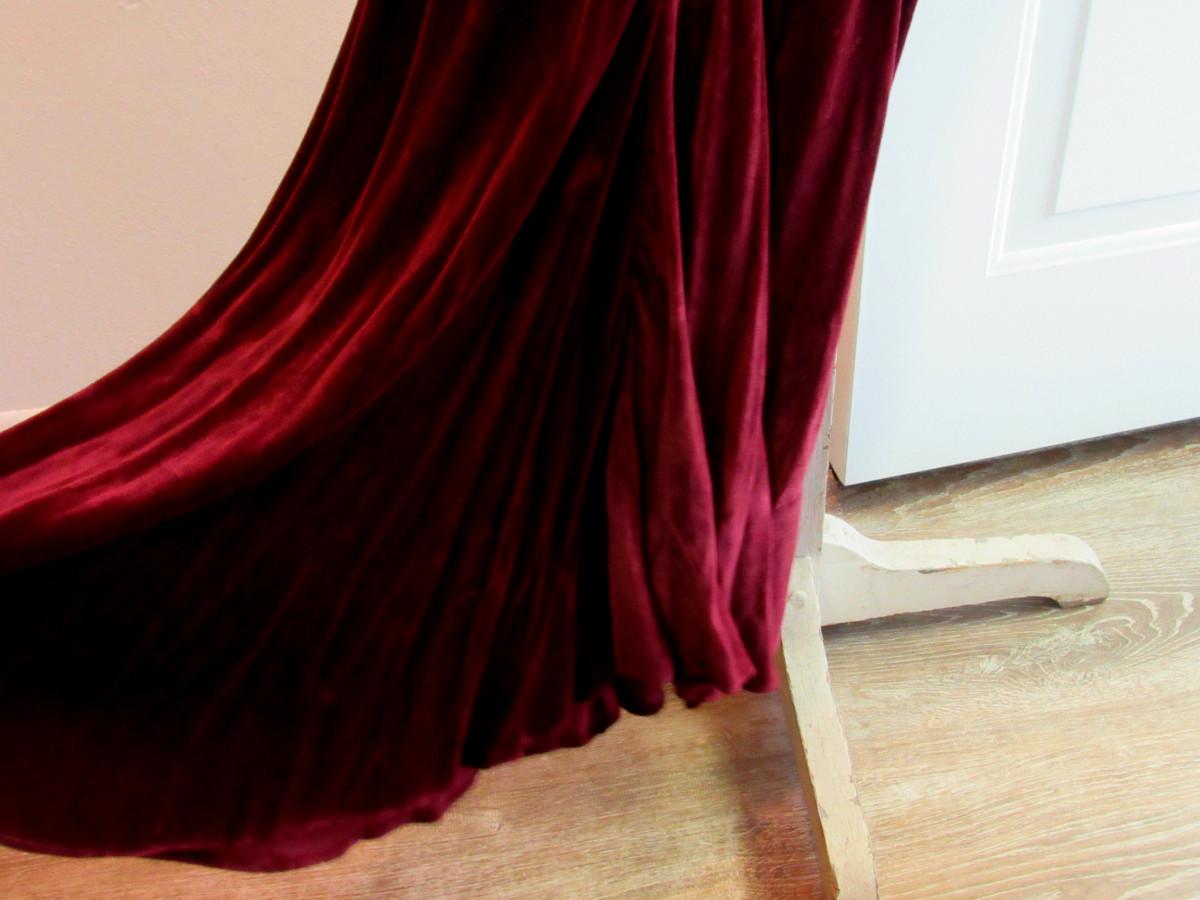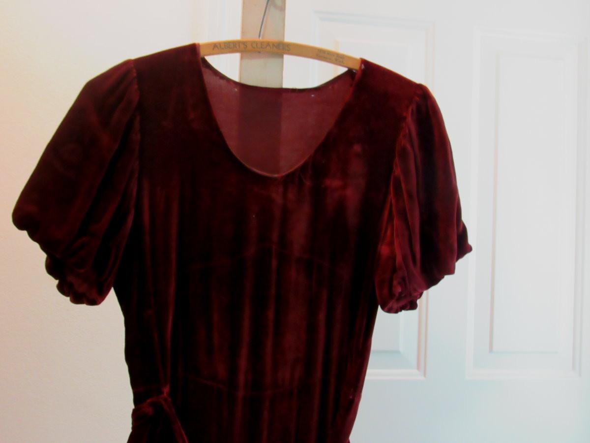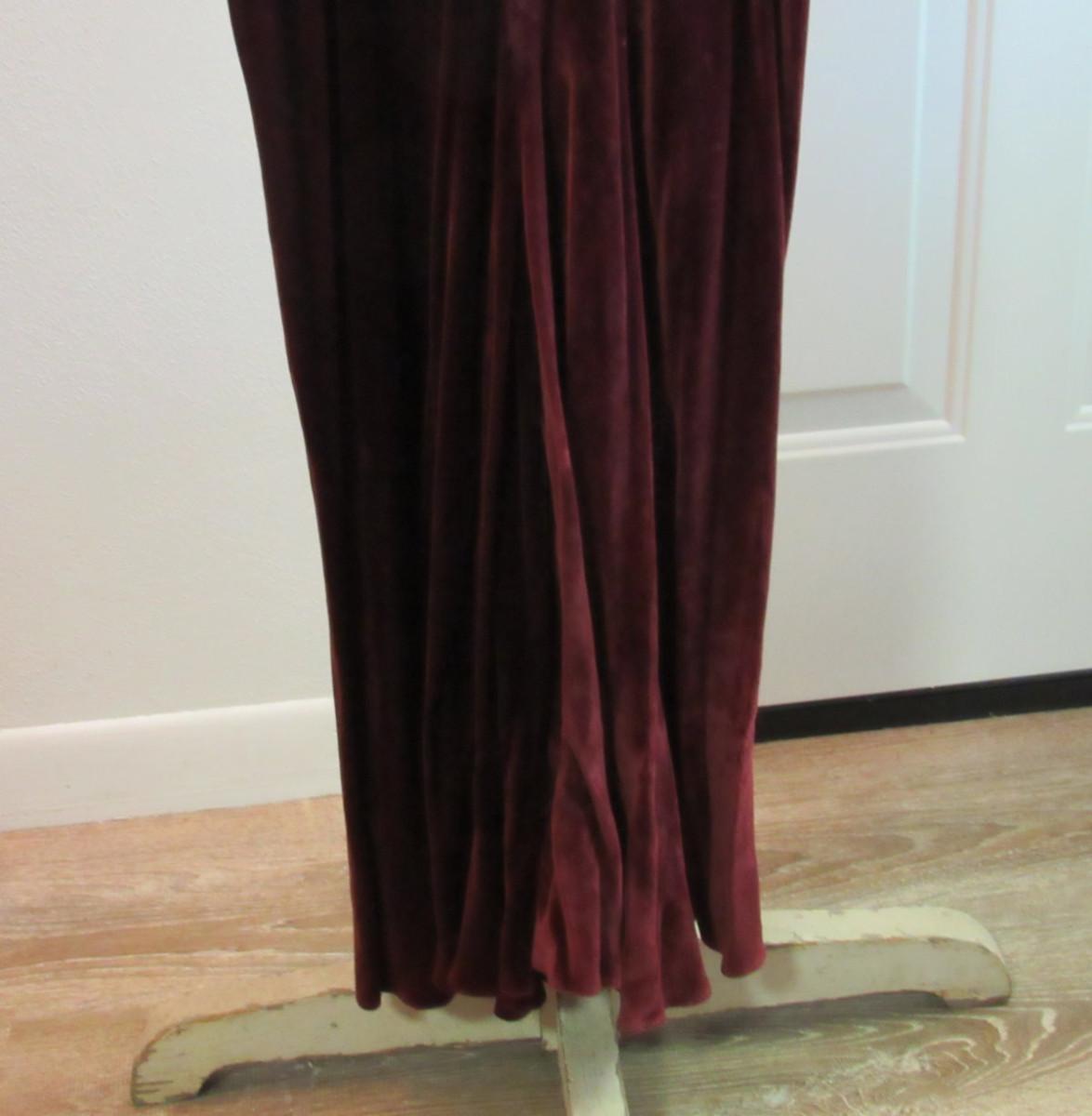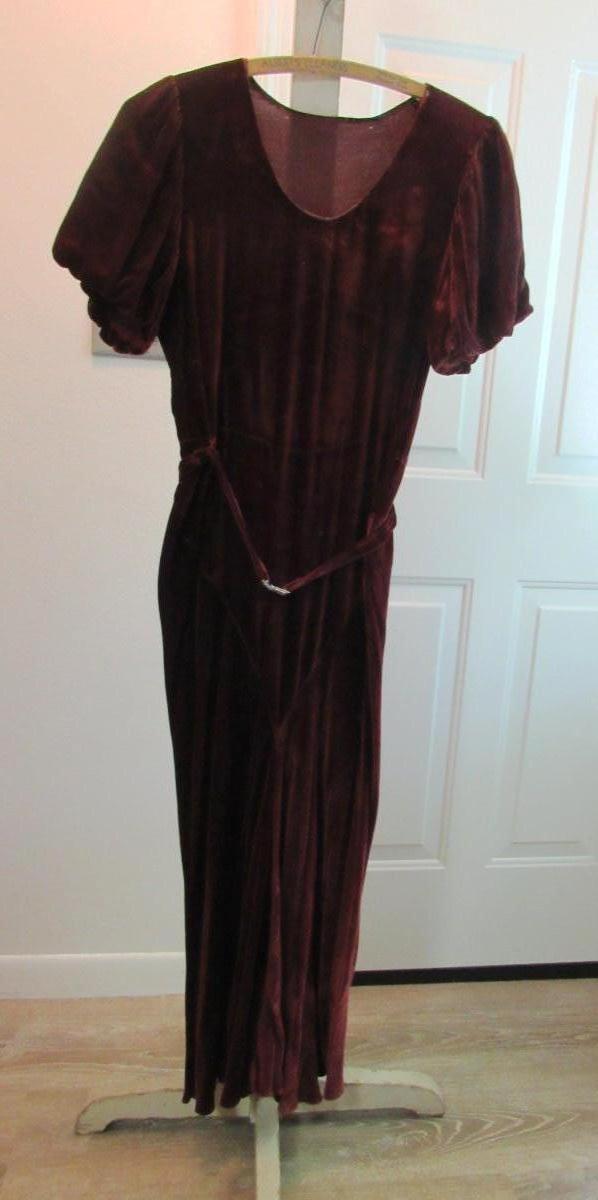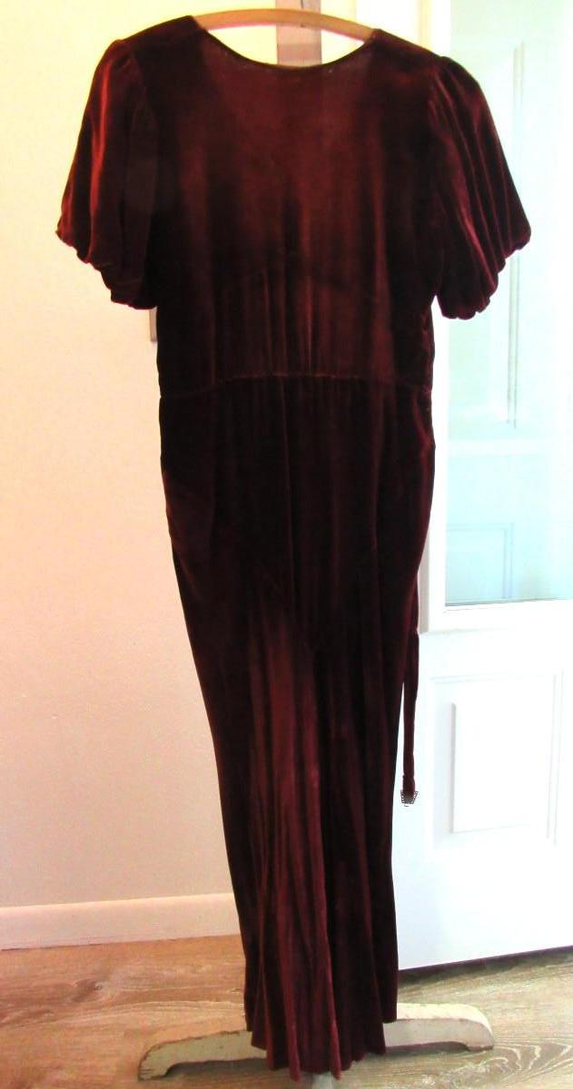 Note: I have checked this dress again for a customer and noticed a little more wear than I saw originally. There is wear to the velvet in spots and at the neckline. Not sure if something was attached to it in the past, or not. Just be aware there is a little more wear in the fabric that I first noticed. Stitching coming loose at neck back, minor fraying at back neck. No makers labels, unknown size. Partially machine and hand sewn. Shipping available at shipping cost plus $5.00 per box handling fee. See our terms for details.