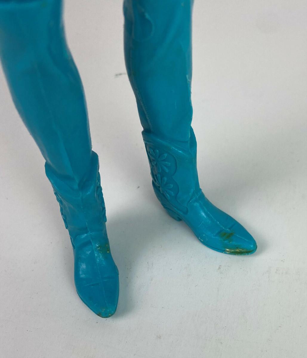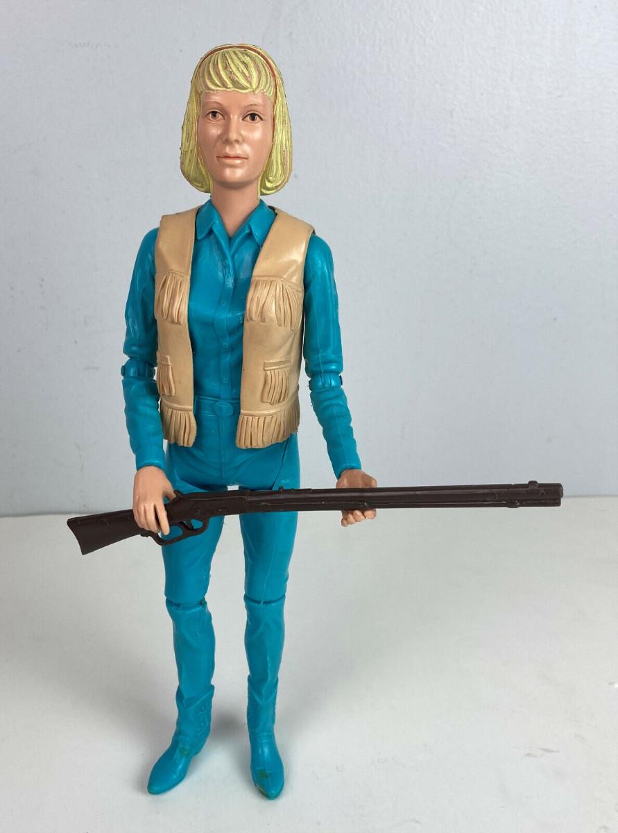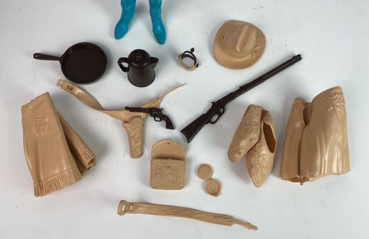 JANE WEST the movable COWGIRL...Johnny West's wife...Fully jointed..by MARX...'SHE WILL SIT..STAND..KNEEL..RIDE A HORSE...Light play wear...some discoloration on boots(pictured)...Good condition overall..Accessories included as shown, missing a spur...11" high...Part of the Best of the West action figures series from Louis Marx released in 1966