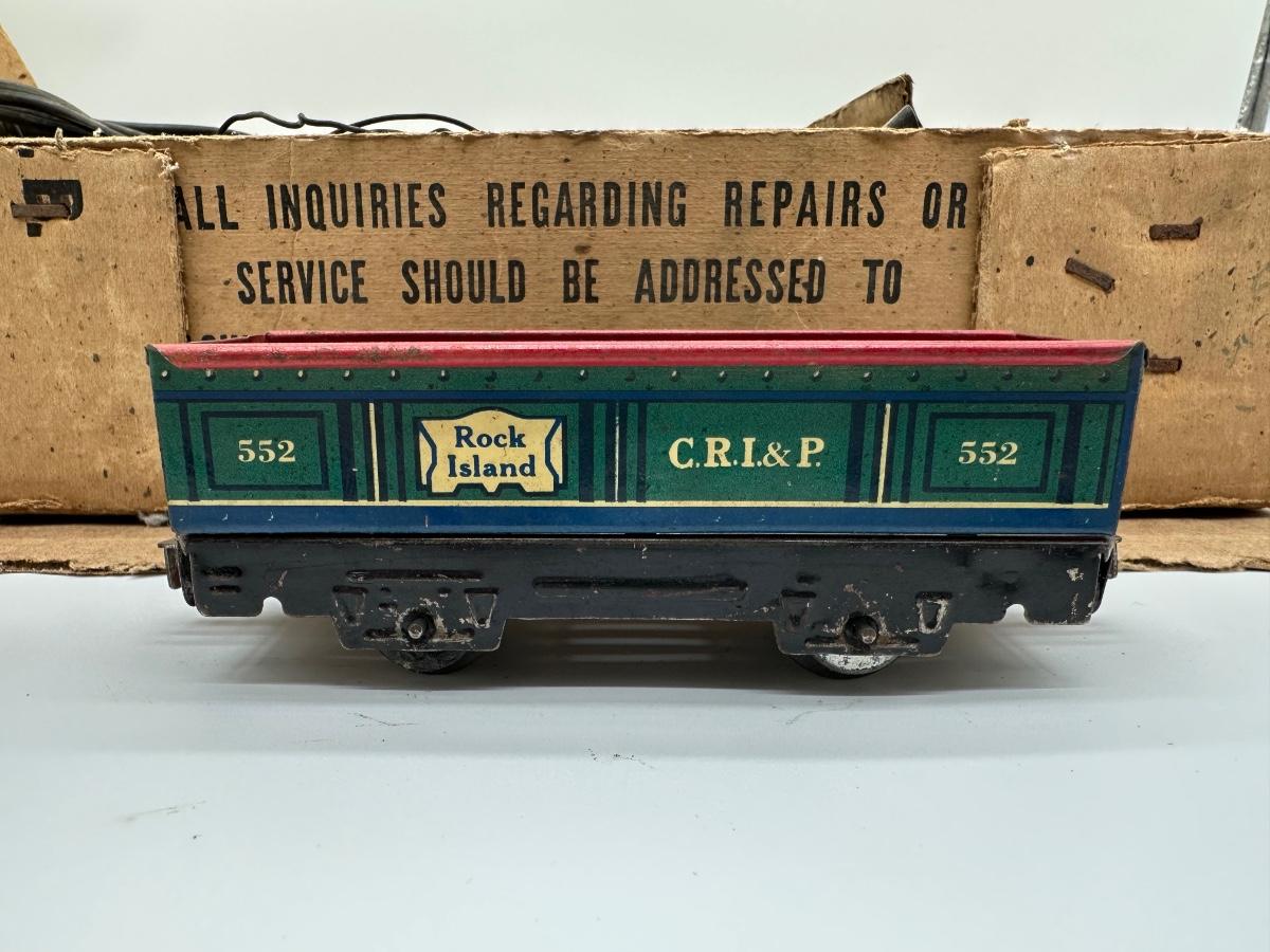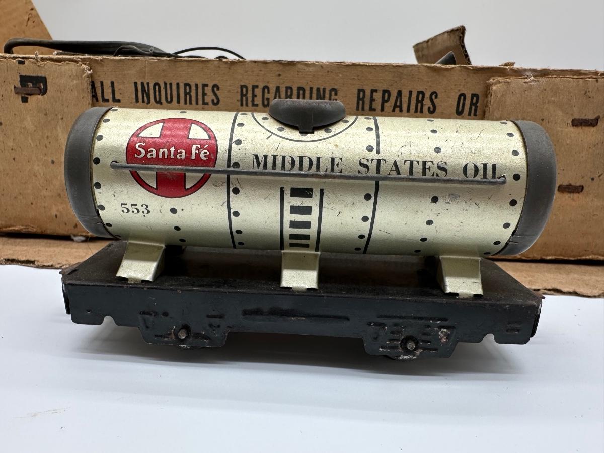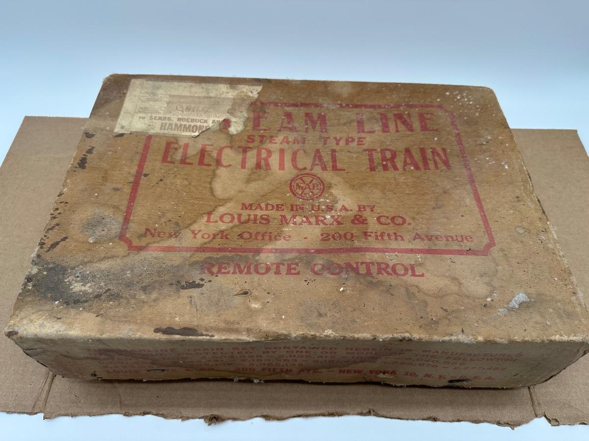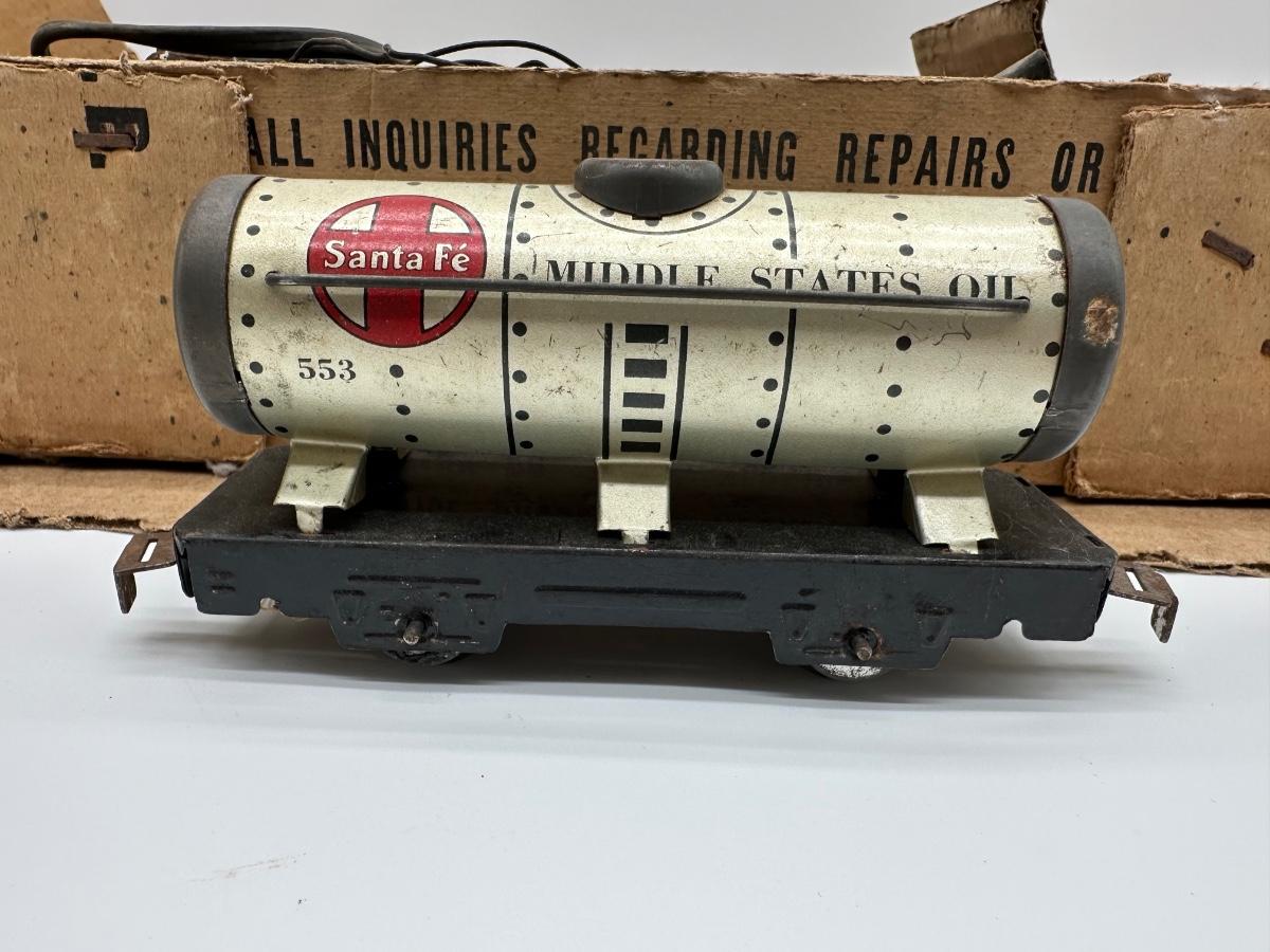 Original Louis Marx & Co. electric steam-type train set in the original cardboard box. Includes locomotive, multiple tin litho cars (New York Central, Santa Fe oil tanker, Rock Island, caboose), transformer, track sections, and working crossing signal. Classic pre/post-war era tinplate with strong graphics.