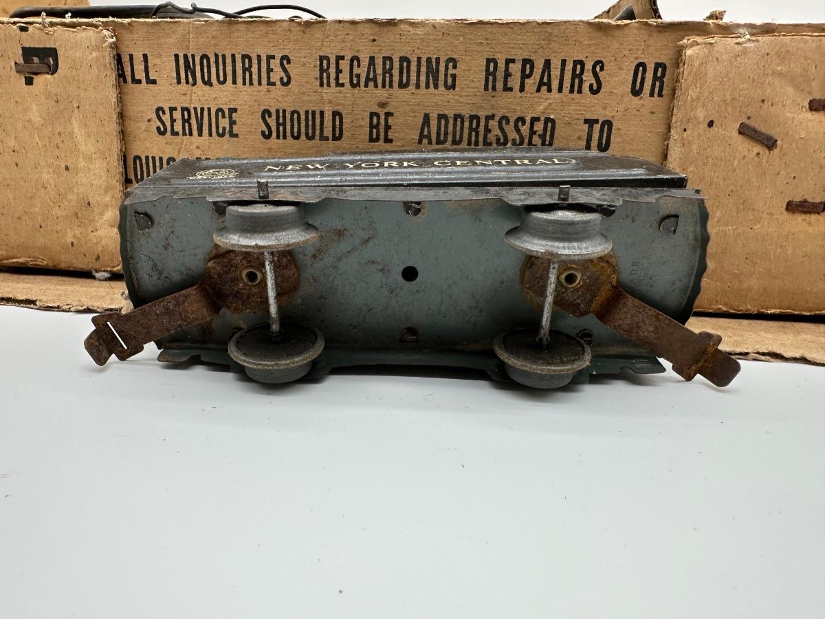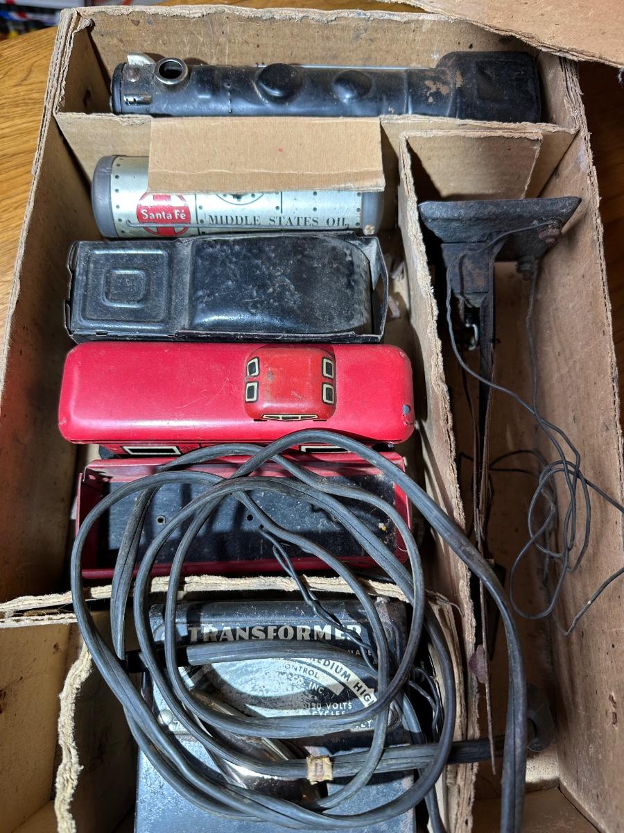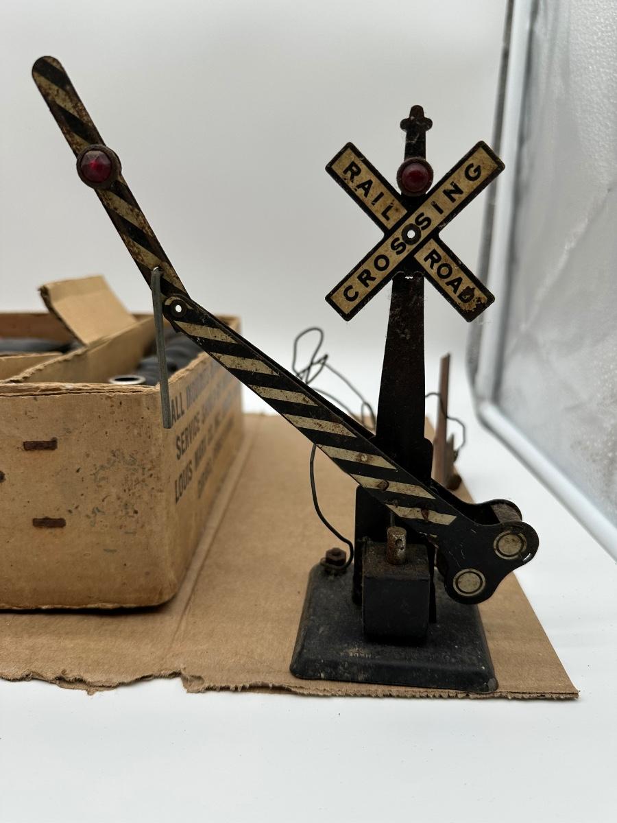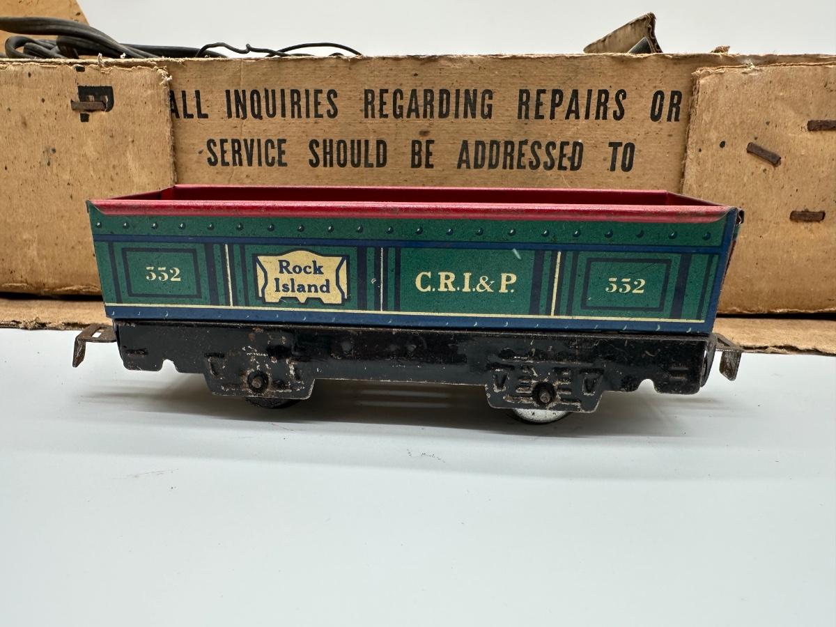 Original Louis Marx & Co. electric steam-type train set in the original cardboard box. Includes locomotive, multiple tin litho cars (New York Central, Santa Fe oil tanker, Rock Island, caboose), transformer, track sections, and working crossing signal. Classic pre/post-war era tinplate with strong graphics.